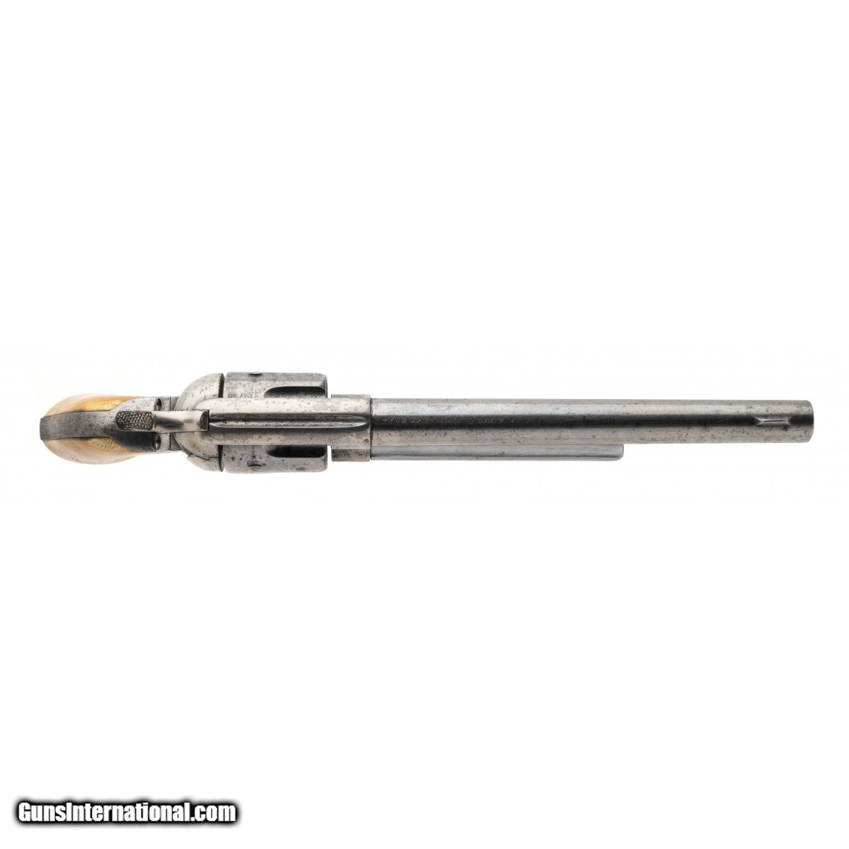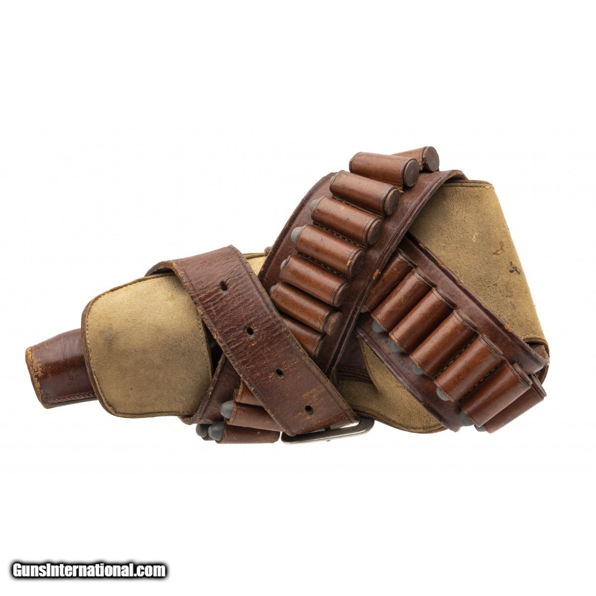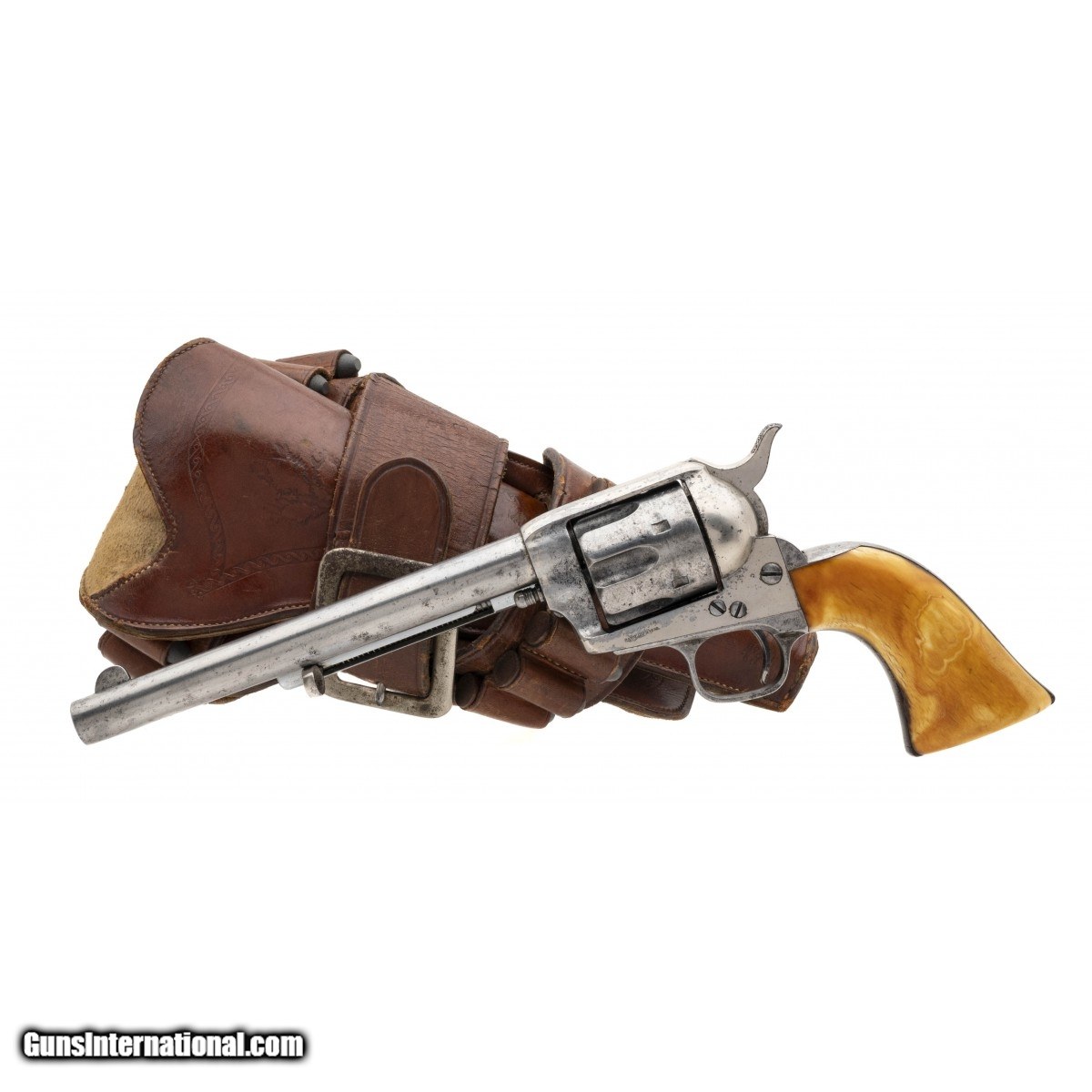 Description: "Serial number 22730.Made in 1876. 44-40 LC caliber with a 7 ½" barrel. Nice sharp gun with traces of nickel finish. Metal has been cleaned. Grips are very good old one piece Ivory. This gun comes with a double loop holster that has some decorations along the border. The cartridge belt is very good. (Consignment) SOLD Antique: Yes |