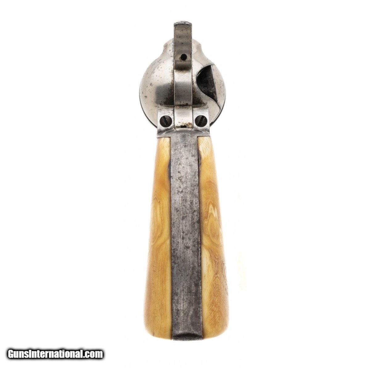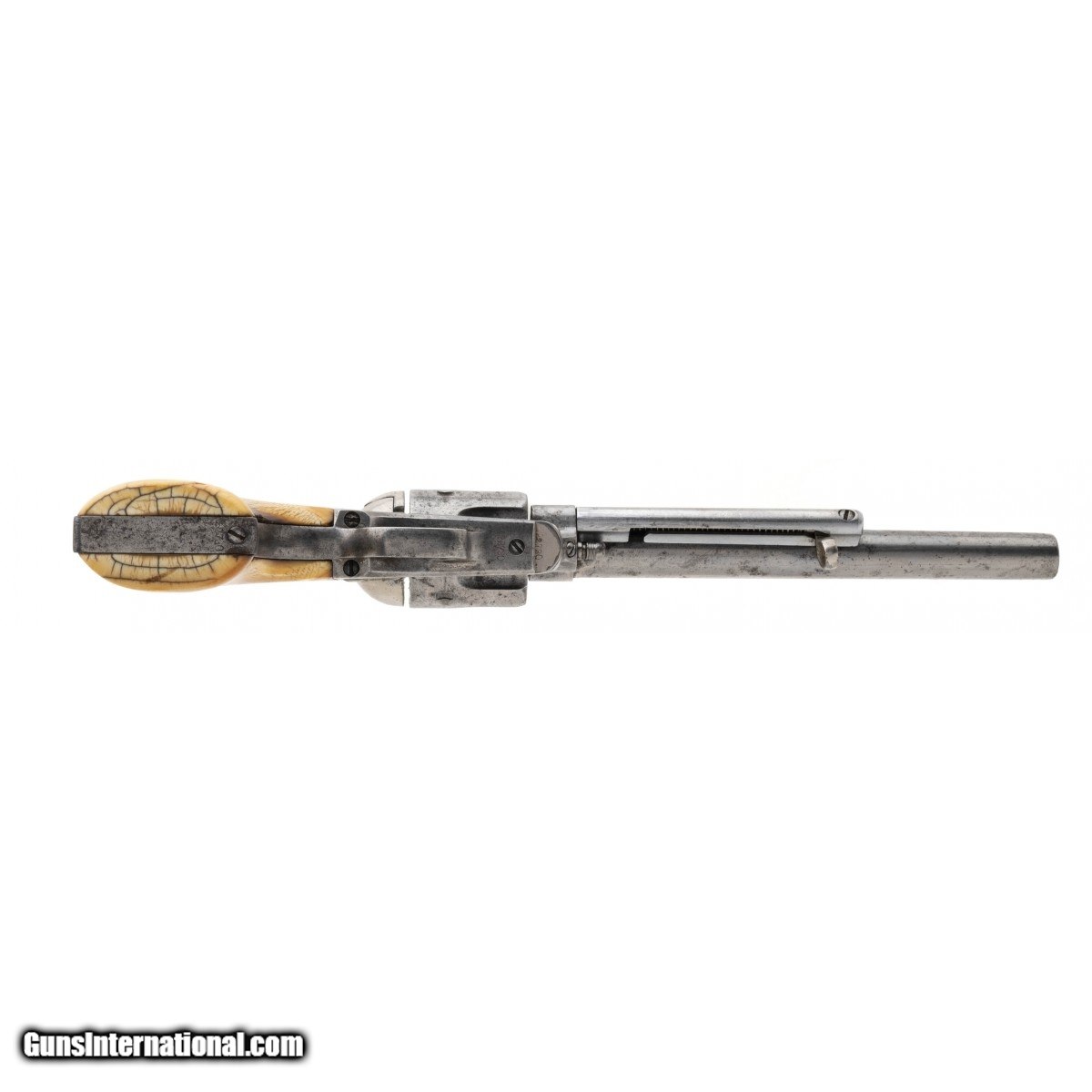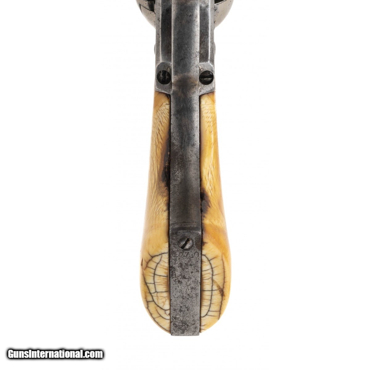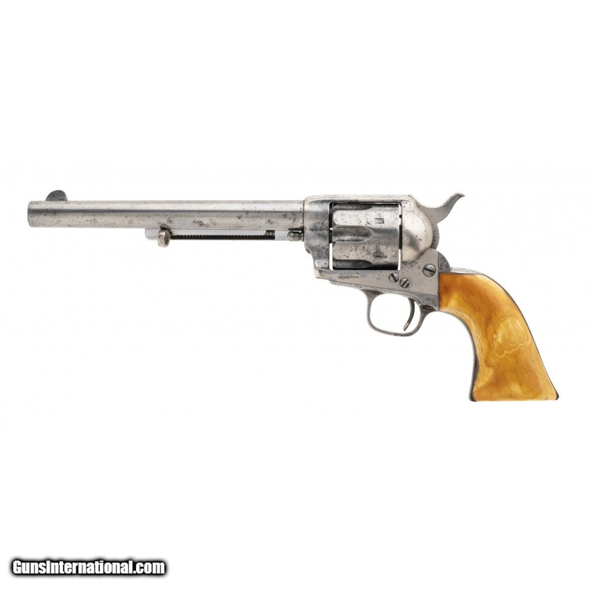 Description: "Serial number 22730.Made in 1876. 44-40 LC caliber with a 7 ½" barrel. Nice sharp gun with traces of nickel finish. Metal has been cleaned. Grips are very good old one piece Ivory. This gun comes with a double loop holster that has some decorations along the border. The cartridge belt is very good. (Consignment) SOLD Antique: Yes |