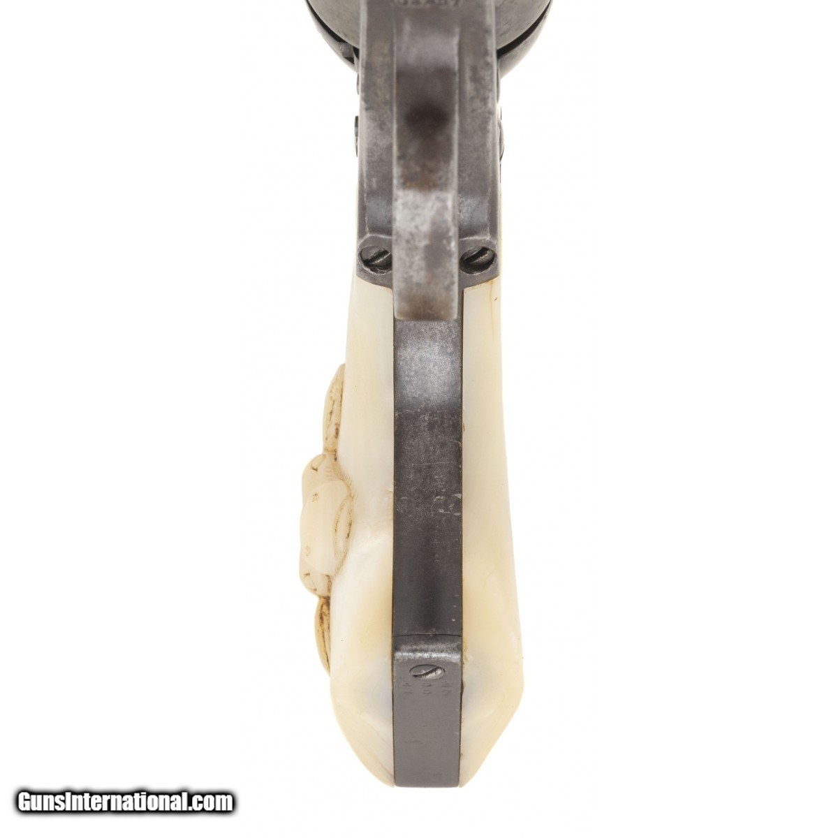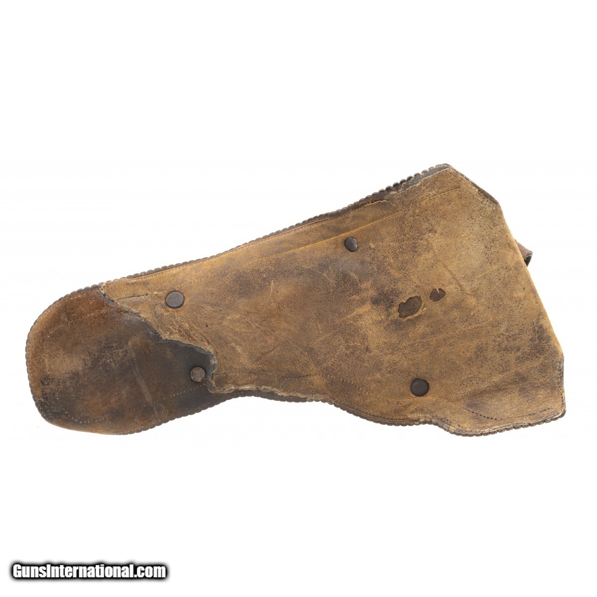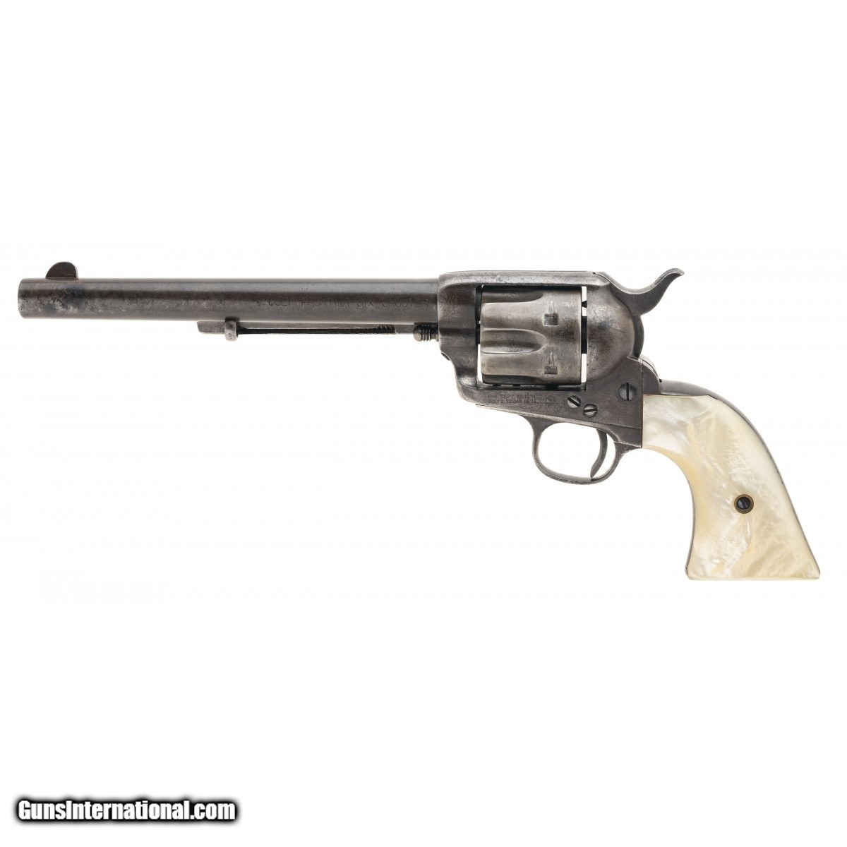 Description: "Serial number 152257. Made in 1893. 44-40 caliber with a 7 ½" barrel. Metal has a dark gray patina. Metal has been cleaned. This is a later black powder frame Single Action. The grips are two piece pearls with a carved steer head on the right hand side. This gun comes with a beautiful carved Mexican gun belt. The leather by the buckle is marked “Leonides Rodriguez" which is the maker. The holster is a double loop leather with a thumb strap. SOLD |