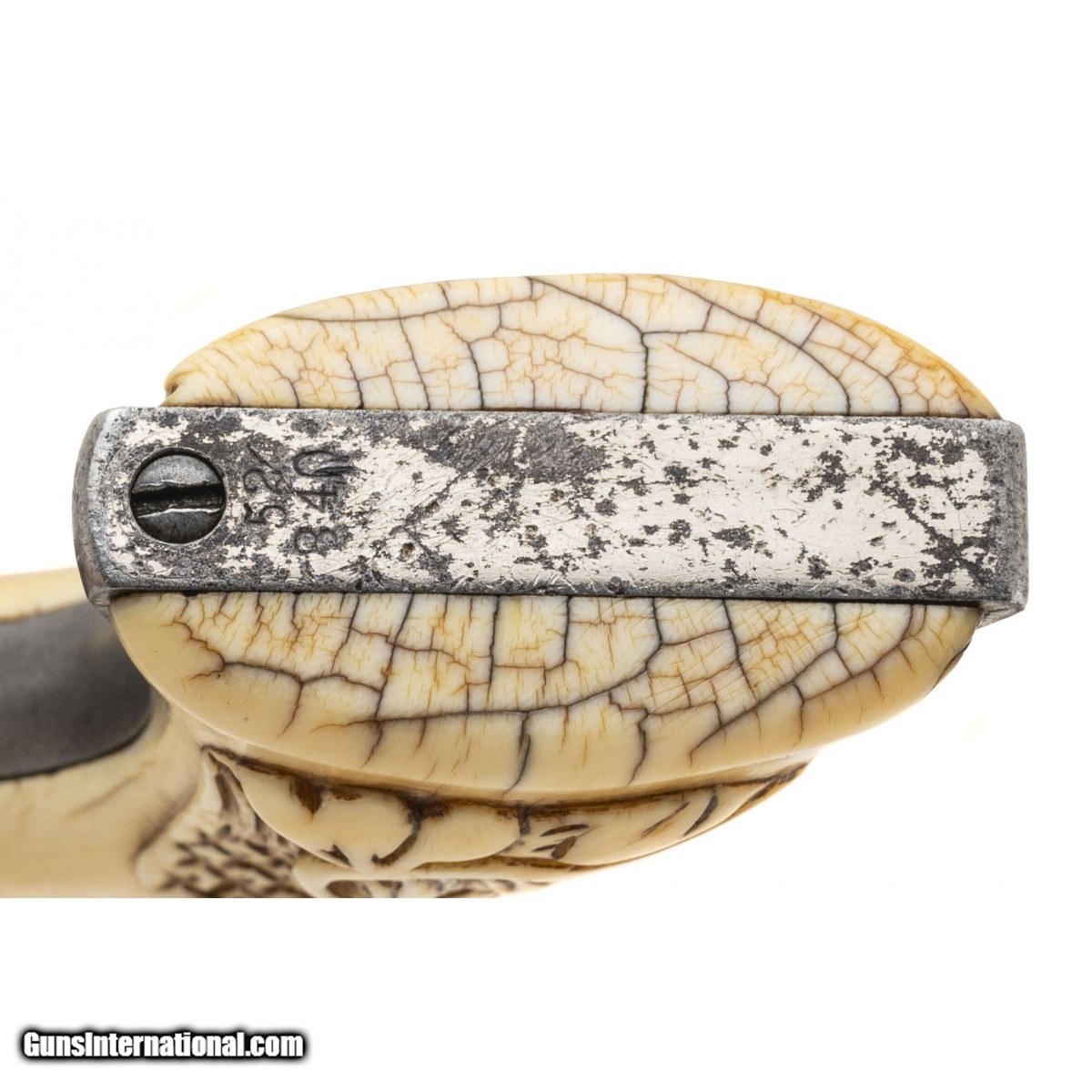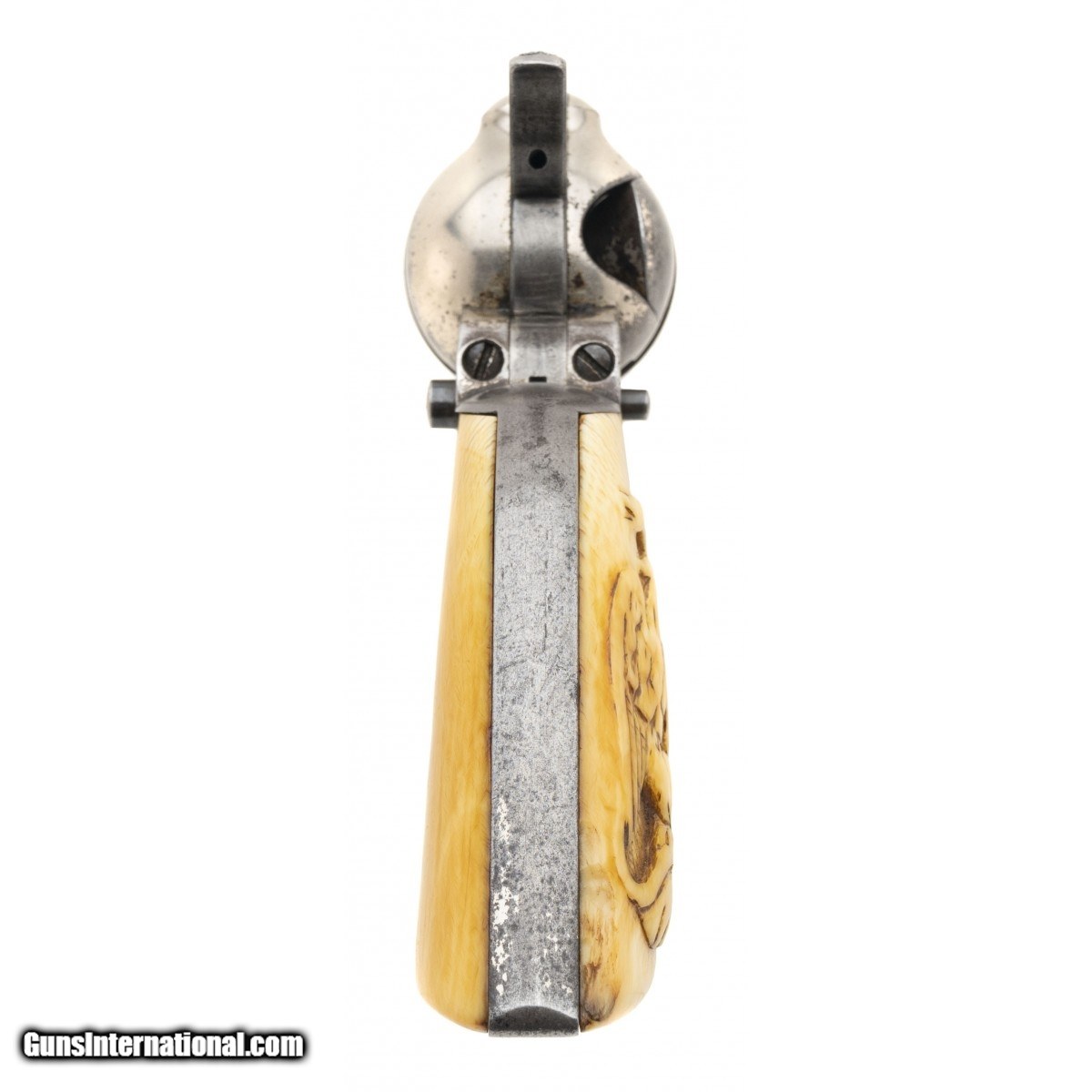 Description: "Serial number 52840. Made in 1879. 44-40 caliber with a 7 ½" barrel. This is an etched panel Colt Frontier Six Shooter. The barrel has 70% of the original finish. The etched panel on the barrel is still visible. Gun is all matching. The one piece ivory grips are very fine with a carved Mexican eagle on the left hand side. SOLD Antique: Yes |