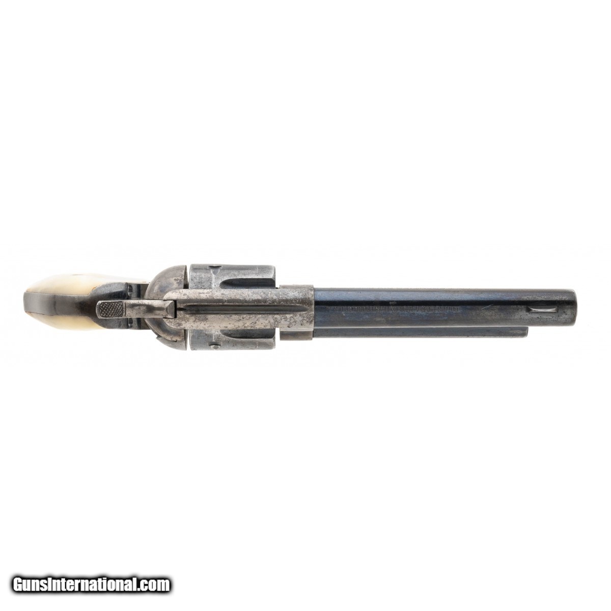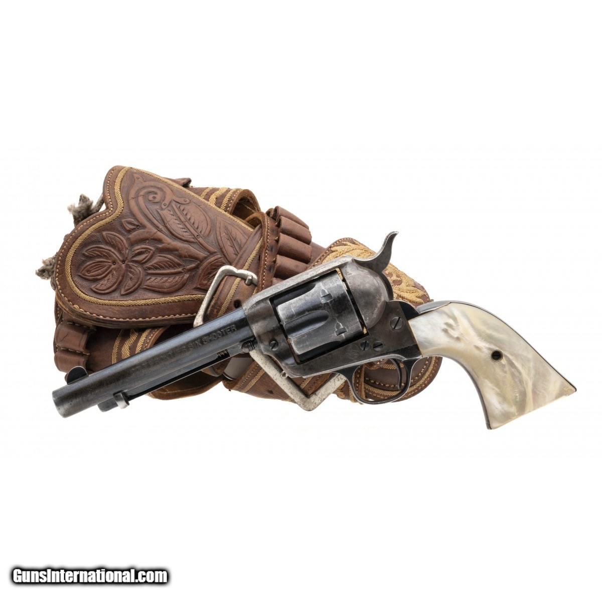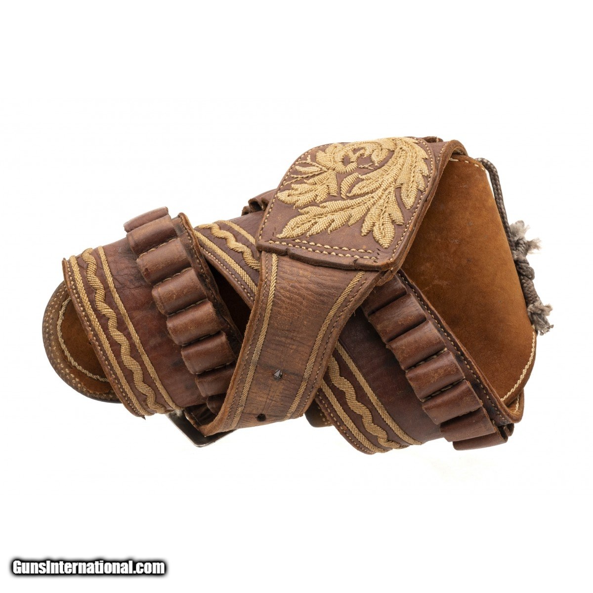 Description: "Serial number 262685. Made in 1905. 44-40 caliber with a 5 ½" barrel. Very fine gun with 60%+ of the original blue and over all very good case colors on the frame. The grips are nice thick two piece pearls. The cartridge belt has Piteado decoration which is typical something found on rigs done in Mexico. The Holster is a “jock strap" style that is carved and adorned with piteado work. SOLD Curio/Relic: Yes |