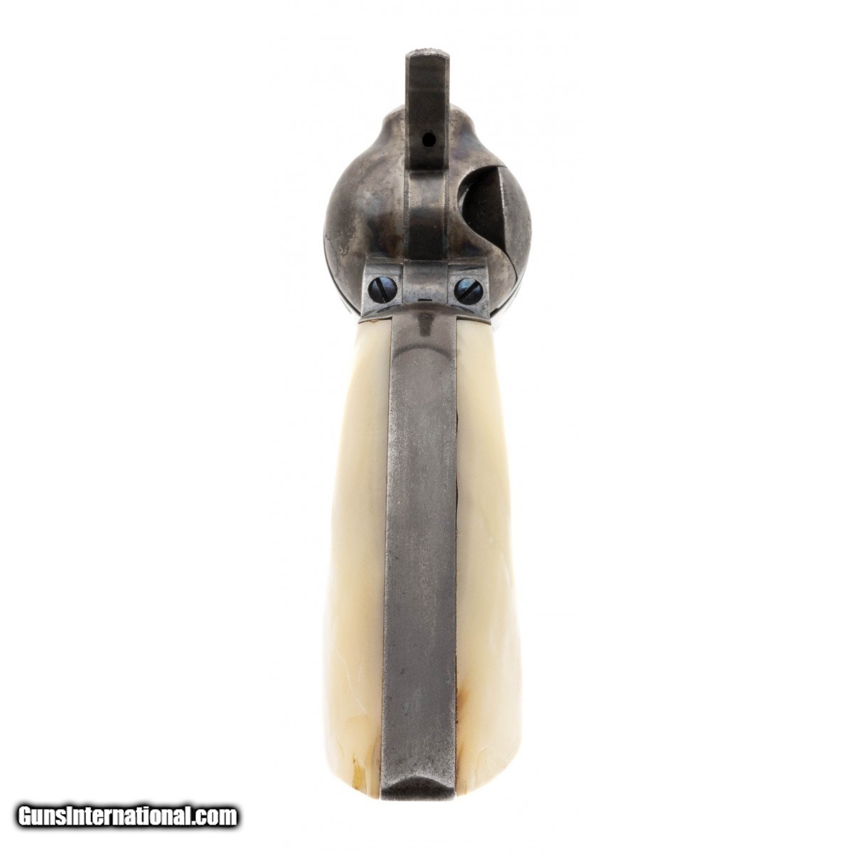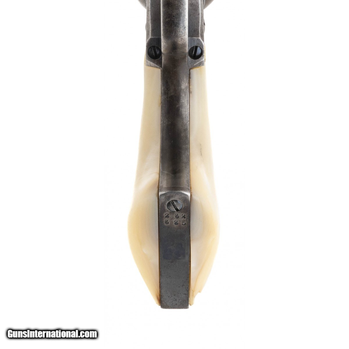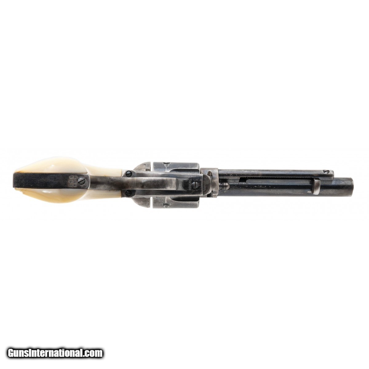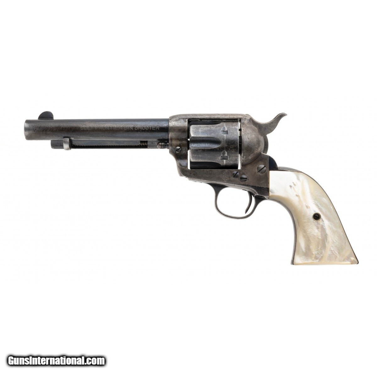 Description: "Serial number 262685. Made in 1905. 44-40 caliber with a 5 ½" barrel. Very fine gun with 60%+ of the original blue and over all very good case colors on the frame. The grips are nice thick two piece pearls. The cartridge belt has Piteado decoration which is typical something found on rigs done in Mexico. The Holster is a “jock strap" style that is carved and adorned with piteado work. SOLD Curio/Relic: Yes |