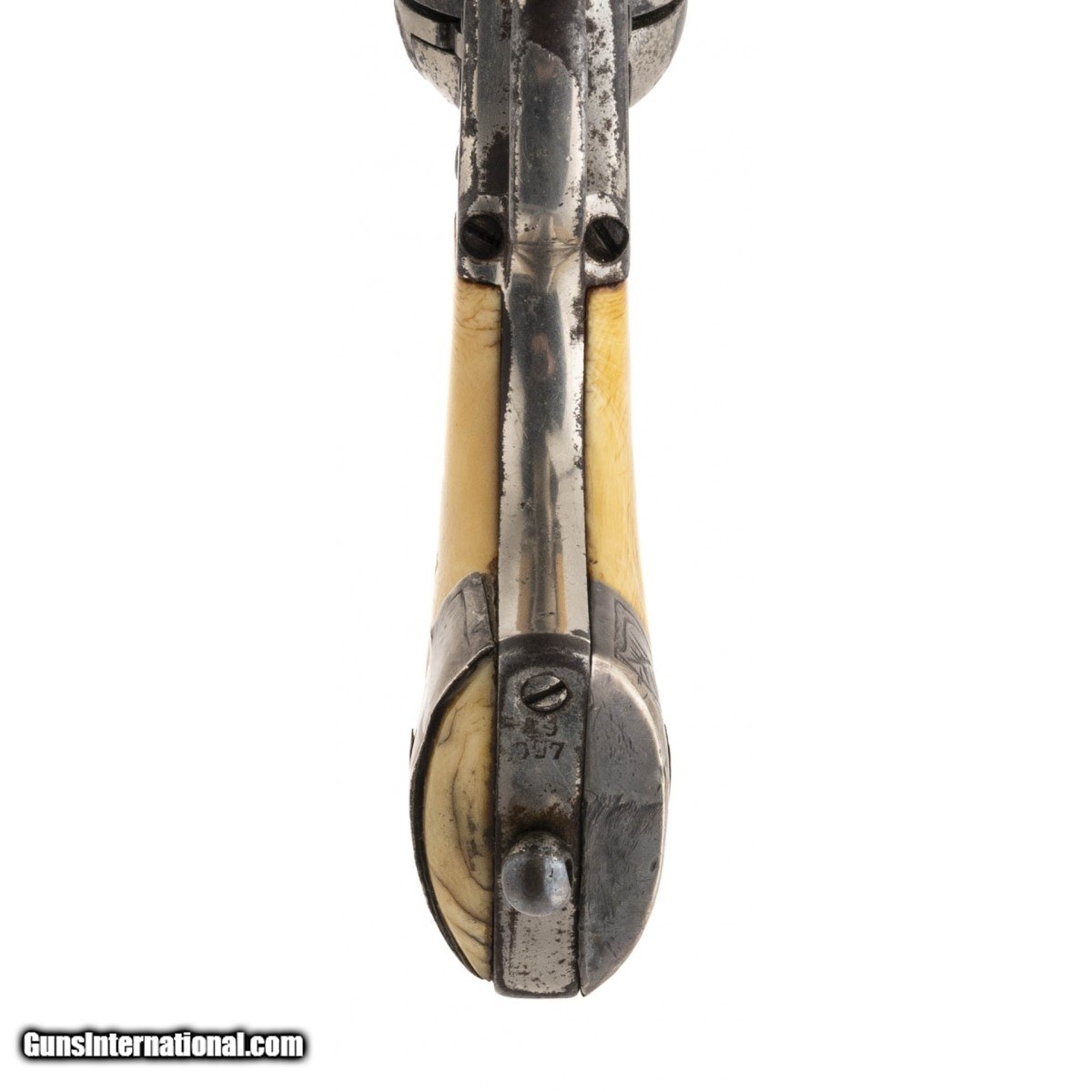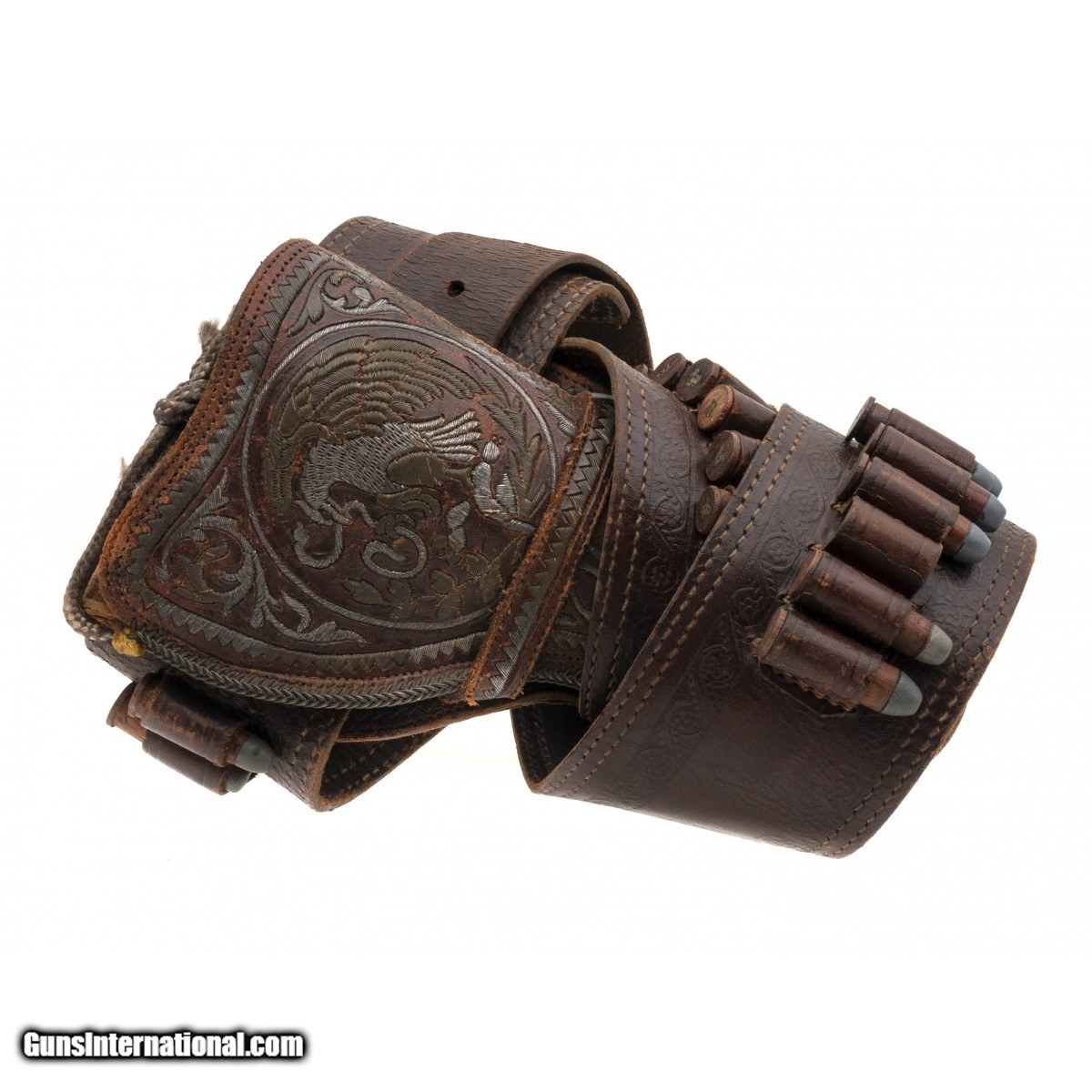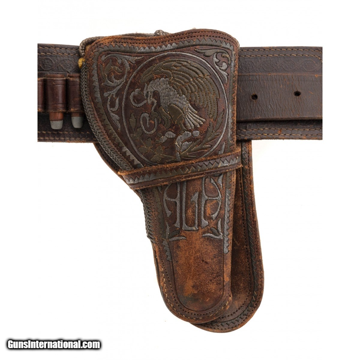 Description: "Serial number 49997. Made in 1879. 45 LC caliber with a 5" barrel. This gun has had the barrel shortened from the original 7 ½" length. This gun was also nickel finished of the period. Original this was a cavalry model and throughout the gun you can see original Henry Nettleton inspectors marks. The grips are ivory with Mexican silver work on the base. Along with this gun comes a fantastic Piteado Holster featuring a Mexican eagle. The cartridge belt is carved and unmarked. This is a absolutely fantastic looking rig! (Consignment) SOLD Antique: Yes |