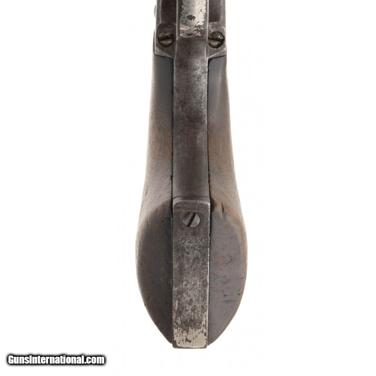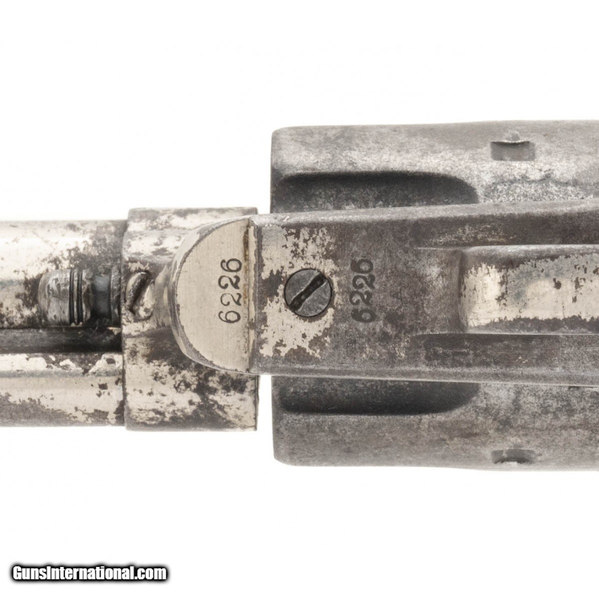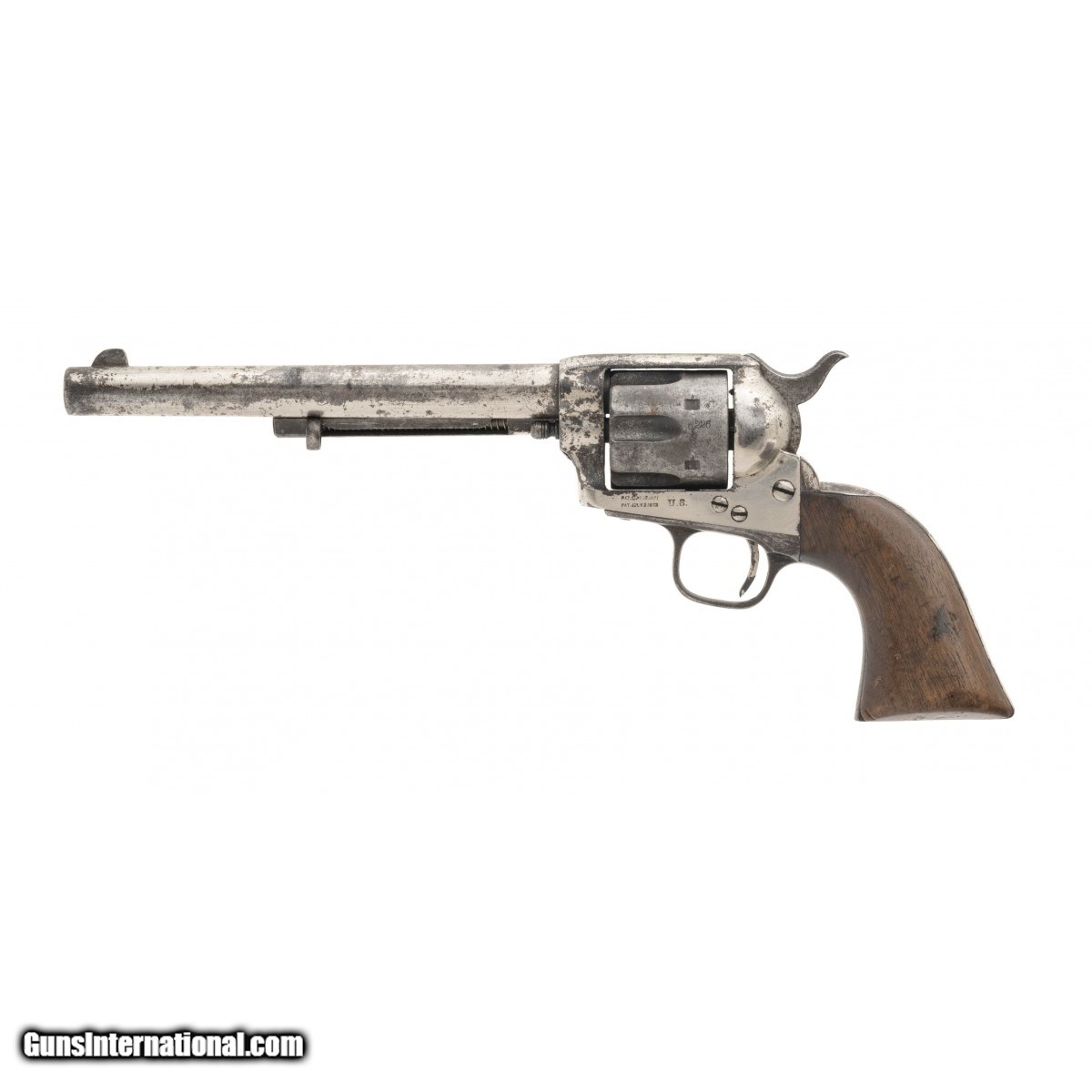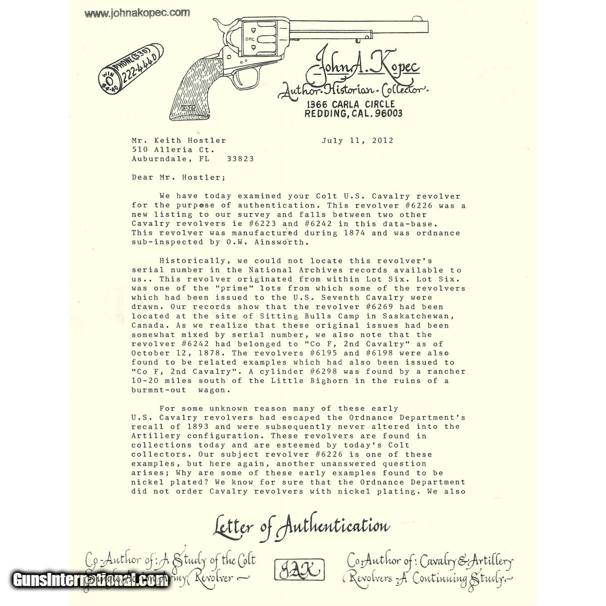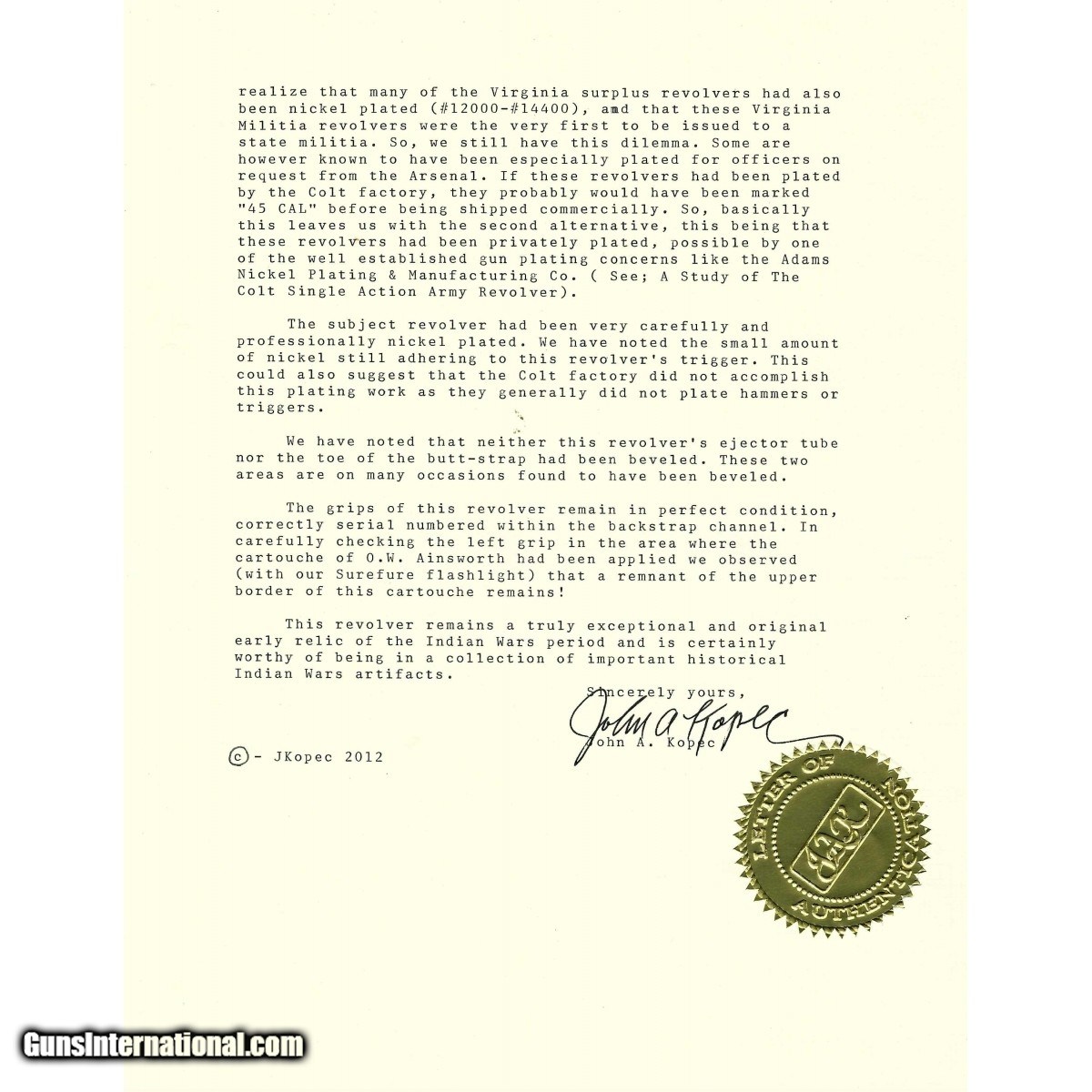 Description: "Serial number 6226. 45 LC caliber with a 7 ½" barrel. This gun is a Cavalry model purchased by the military and inspected by O. W. Ainsworth. This gun has a period nickel finish. Noted expert and author John Kopec has speculations of why some cavalry models were nickel plated, but does not know for sure the reason. Approximately 70% of the nickel finish remains. Grips show normal wear. This gun falls in the 6th lot issued to the cavalry where Lot 5 & 6 are the guns issued to the 7th cavalry and could have been used at the Battle of the Little Big Horn. It also falls in a range where it could have been issued to the 2nd Cavalry. This gun comes with a letter from noted expert John Kopec authenticating this gun as all original. This gun was awarded Mr. Kopec’s coveted Golden seal that is reserved for only the finest cavalry models that are completely original and completely unaltered. Very fine Custer era Colt! SOLD Antique: Yes |