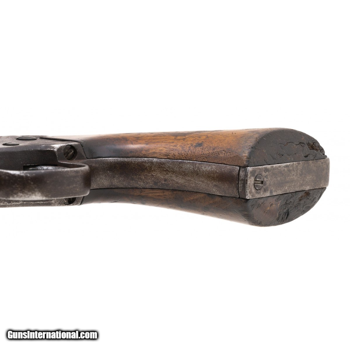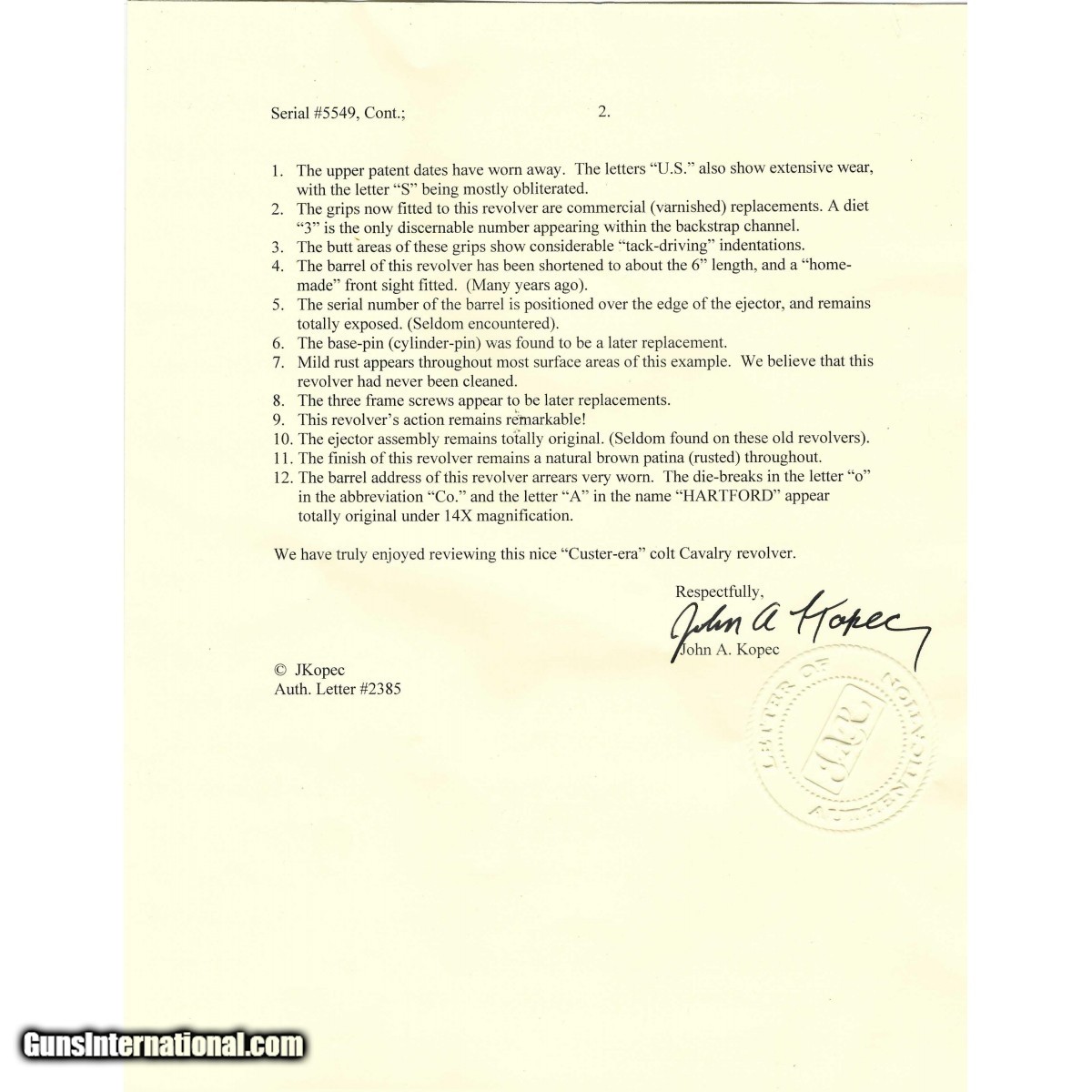 Description: "Serial number 5549. Made in 1874. 45 caliber with a 6" barrel that has been shortened from 7.5"". Gun has an even brown patina. Grips are very good, but replacements that look like they have been with the gun since the period of use. This gun was in Lot 6 which was where a bunch of guns were issued to the 7th cavalry. Along with this gun comes a letter of authentication from noted Colt expert John Kopec. Very neat Custer range gun! SOLD Antique: Yes |