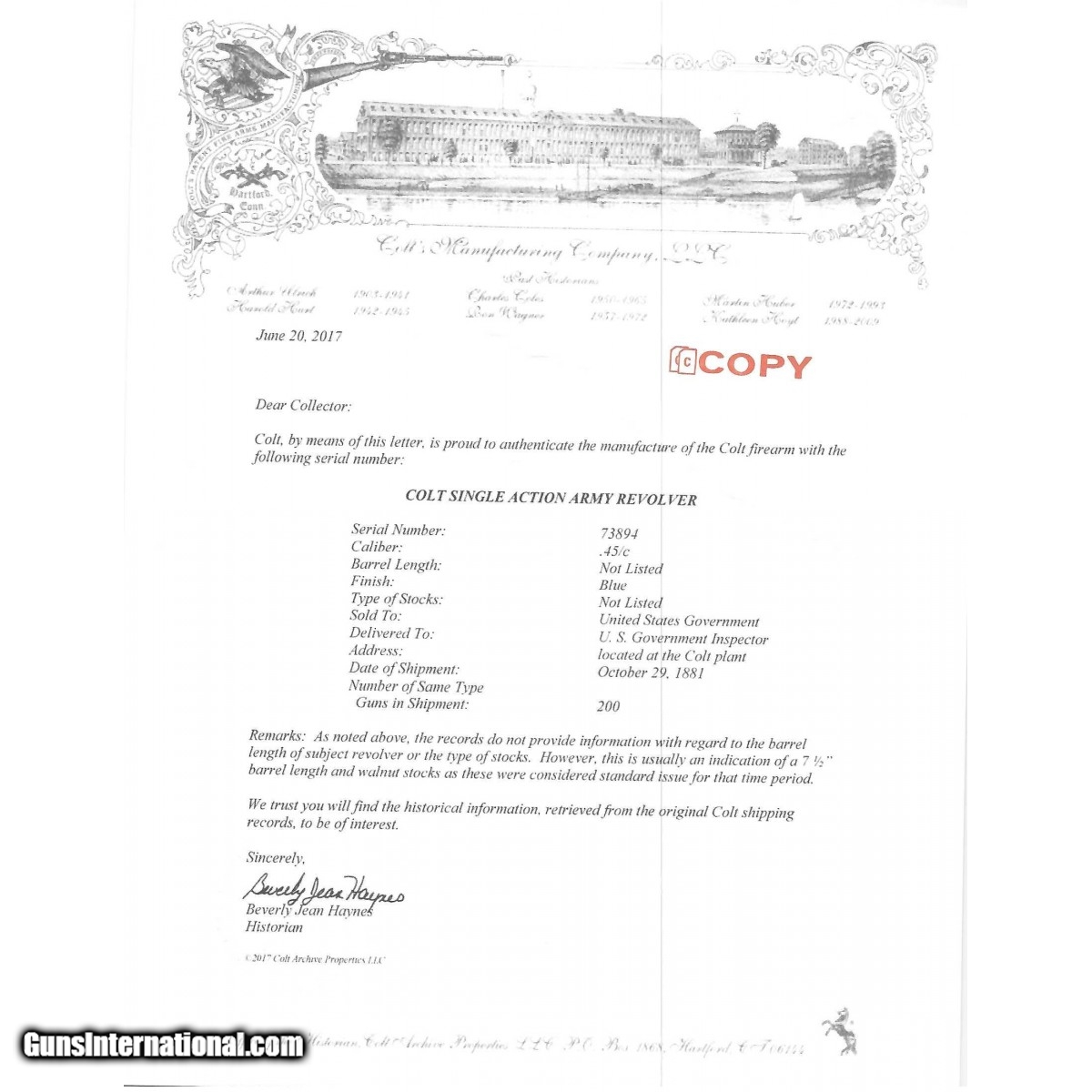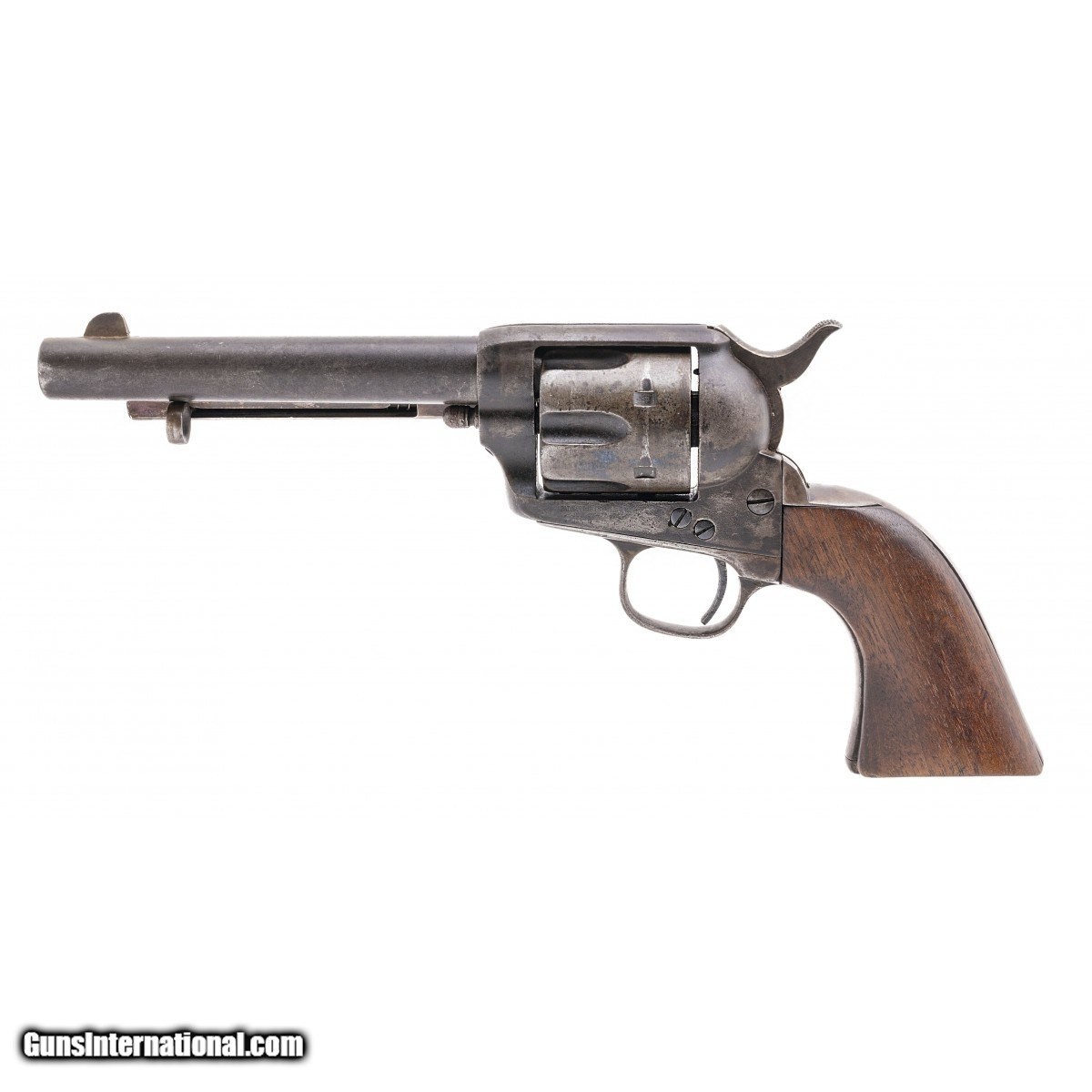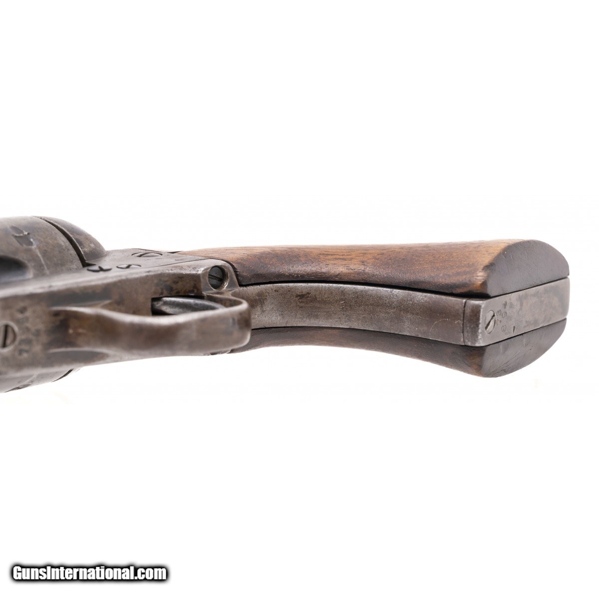 Description: "Serial number 73894. Made in 1881. 45 LC caliber with a 5 ½" barrel. This gun has a dark brown patina. This is a DFC inspected gun. The barrel has been shortened and the grips have been replaced. This gun is all matching. Consignment. SOLD Antique: Yes |