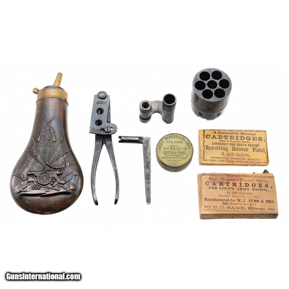Description: "Serial number 184596. Made in 1869. 44-100 Thuer caliber with an 8" barrel. Excellent condition with 95% of the original blue. The frame has bright case colors. The grips have most of the original varnish. Thuer conversions are exceedingly rare and cased examples in this condition of virtually unheard of. This ggun comes with an original matching percussion cylinder. All accessories are excellent and you have the Thuer loading tool. There is also two boxes of Thuer cartridges. One of the boxes is a possible reproduction. The case is all original and excellent. This is about as good as one will find and certainly worthy of the finest Colt collections! SOLD Antique: Yes |