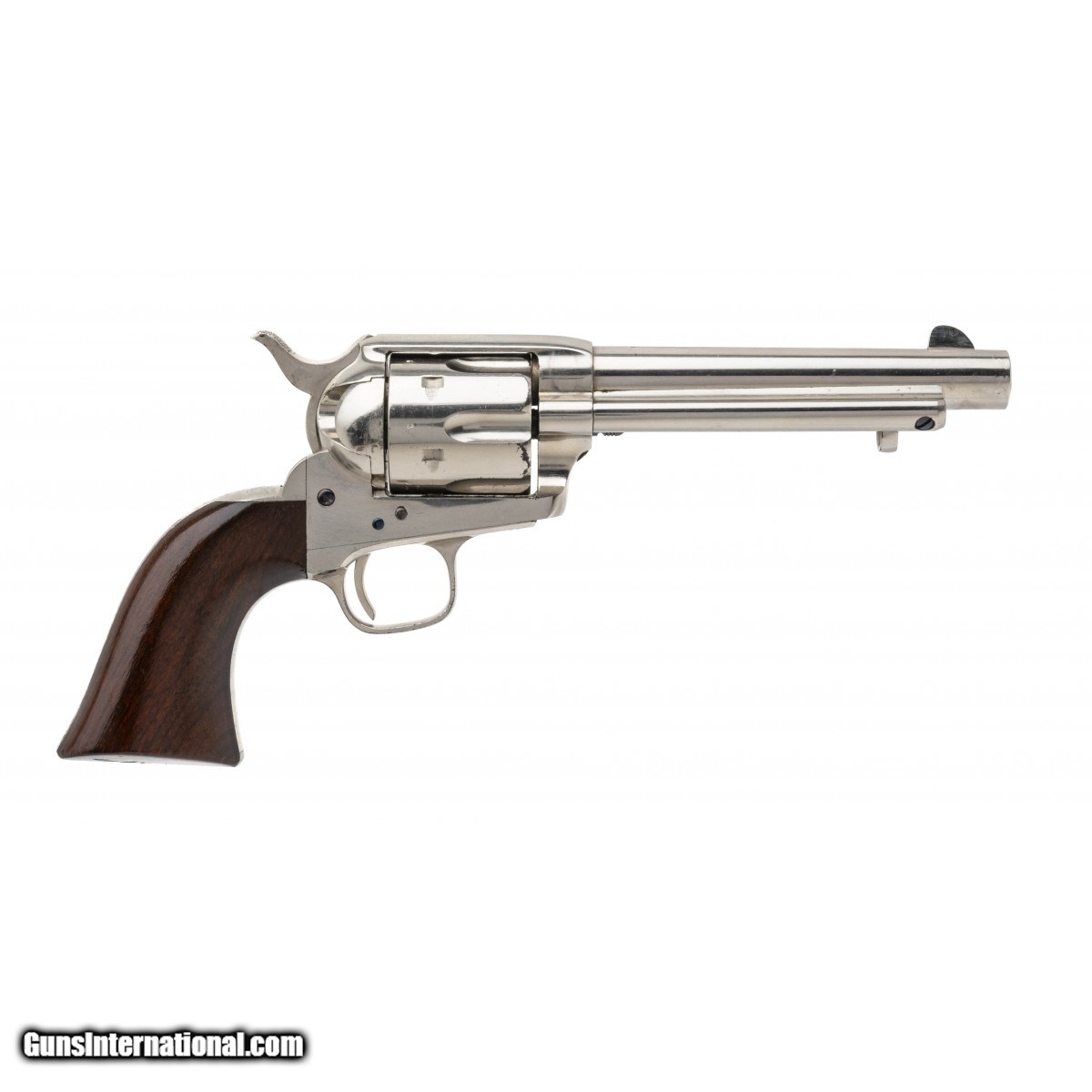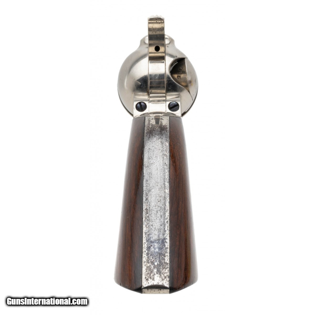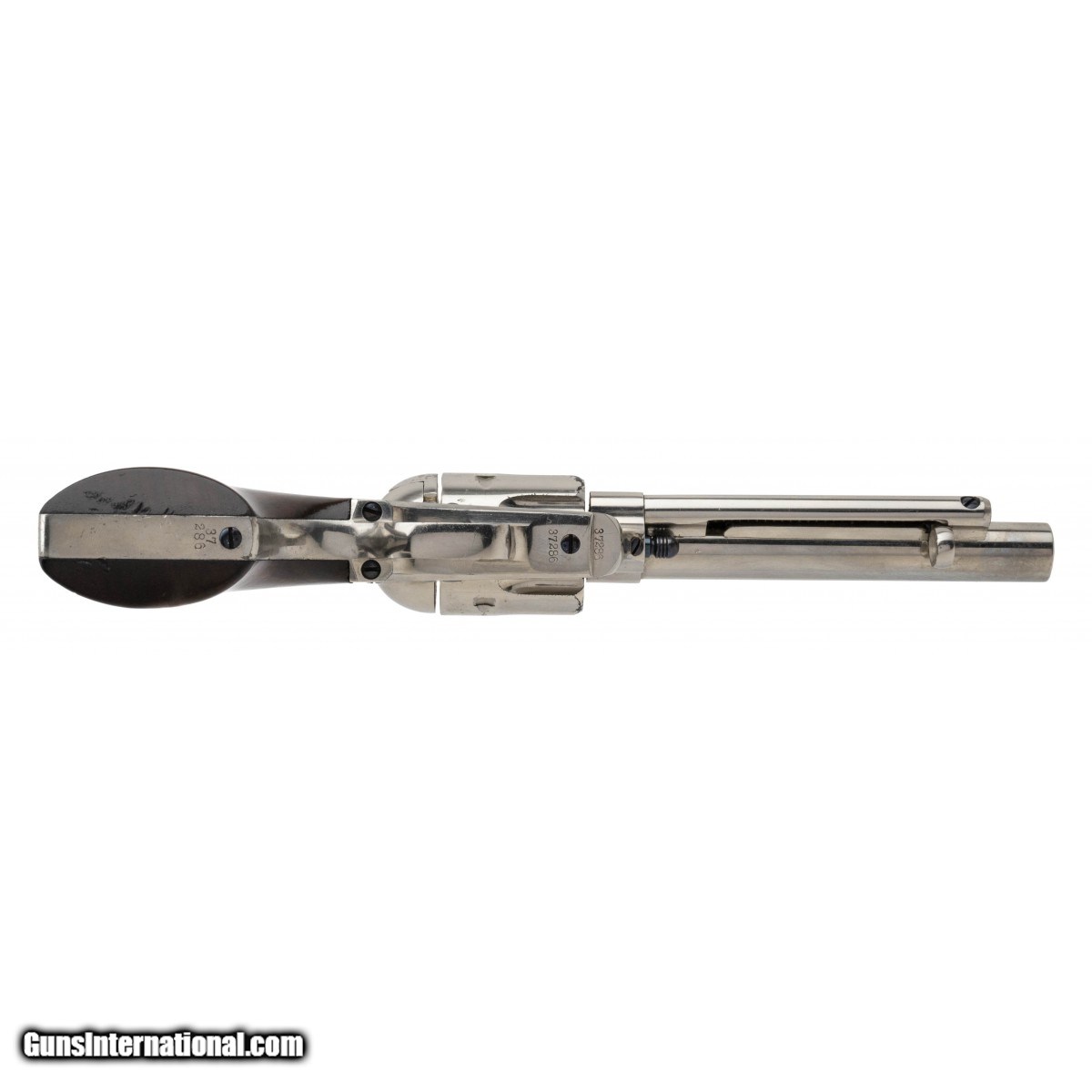 Serial number 37286. Made in 1877. 45 Boxer caliber with a 5 ½" barrel. This gun is in excellent condition with 90% of the original nickel finish. The screws still has the original fire blue . The grips are excellent with all of the original varnish. The cylinder has some of the original nickel bubbling. Excellent example of a early original Colt Single Action Army!