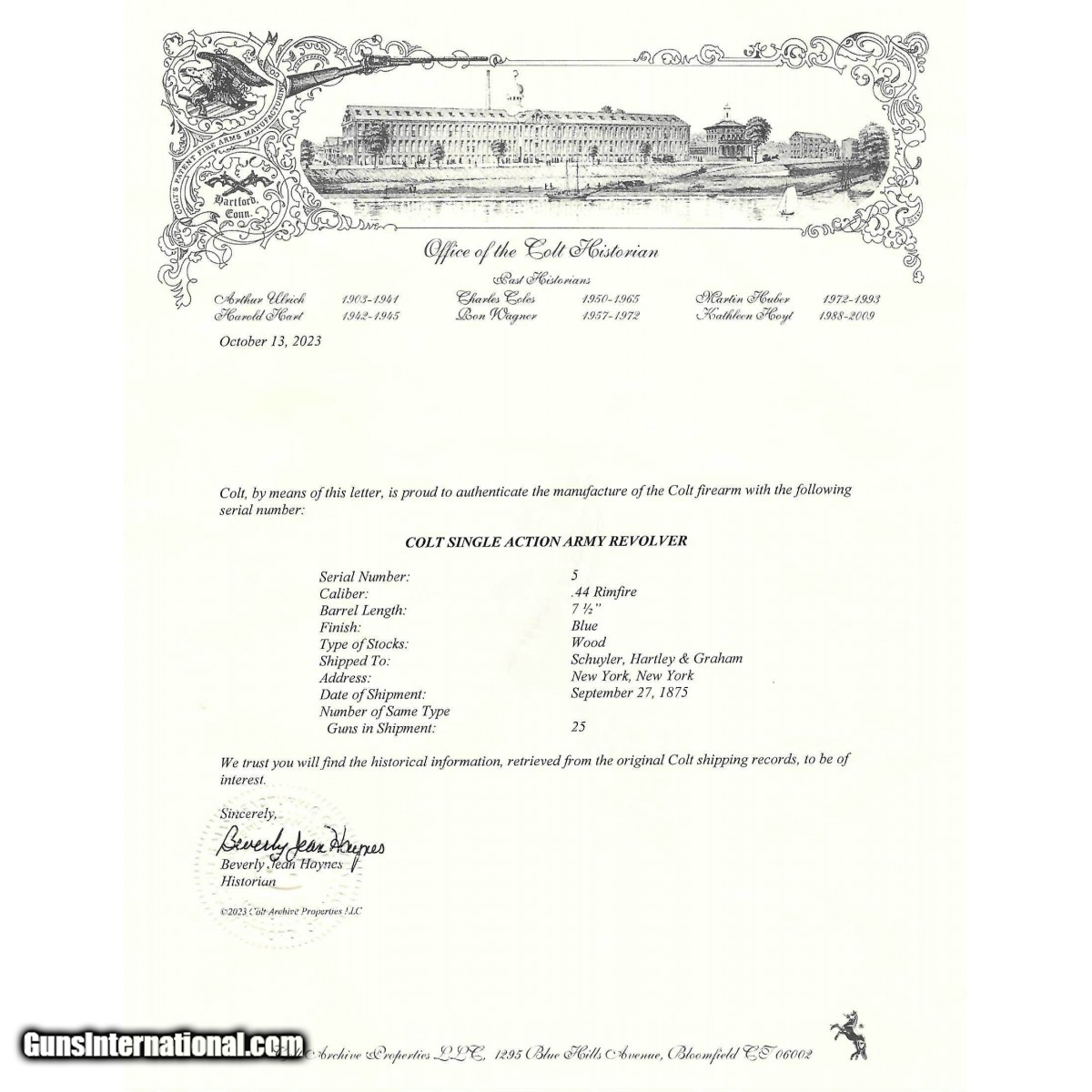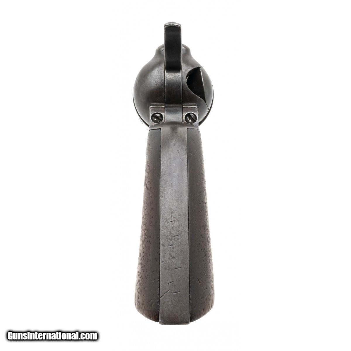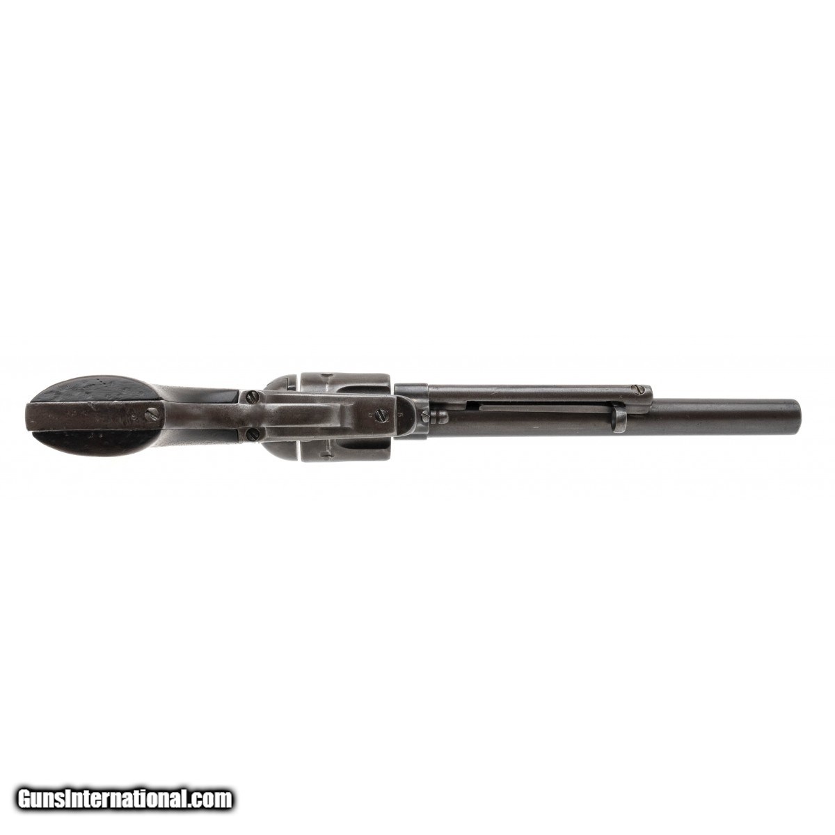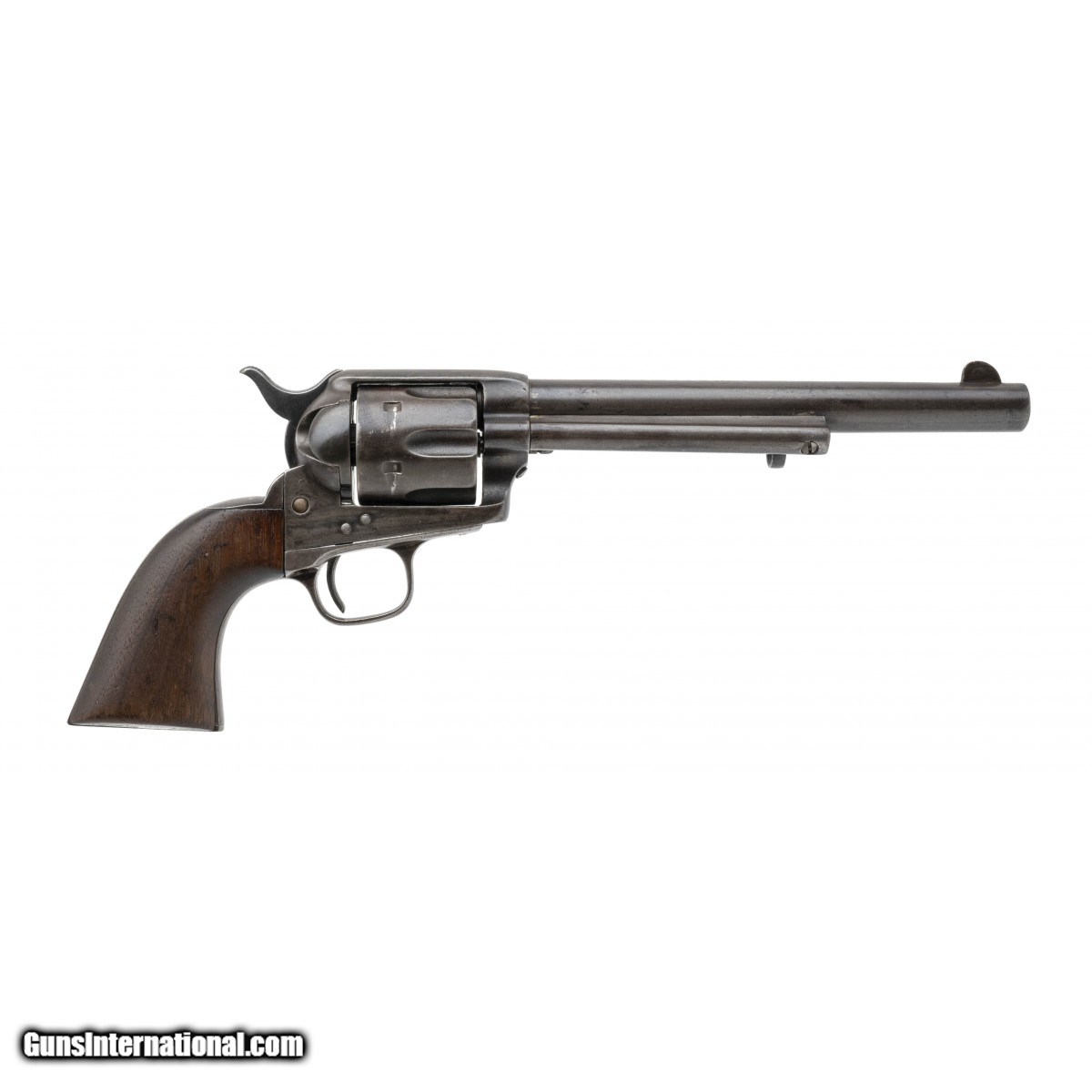Description: " Serial number 5. Made 1875. 44RF caliber with a 7 ½" barrel. This is a 44 RF caliber Colt Single Action which were numbered in their own serial range from 1 – 1863. This is the fifth gun made. This gun has a even brown patina throughout the metal. The gun is partially restored with the markings have been refreshed, the patina is artificial and the channel in the hammer has been rewelded. This gun comes with a factory letter. It was shipped to Schuyler, Hardley & Graham in a shipment of 25. (Consignment) SOLD Antique: Yes |