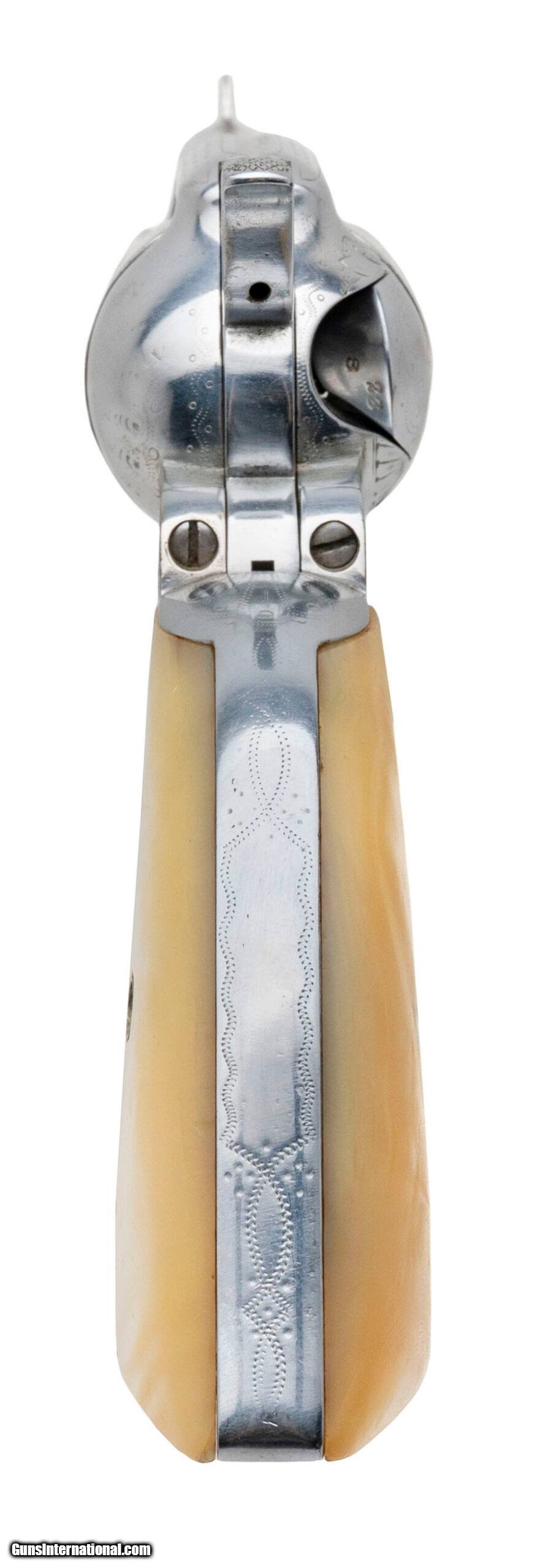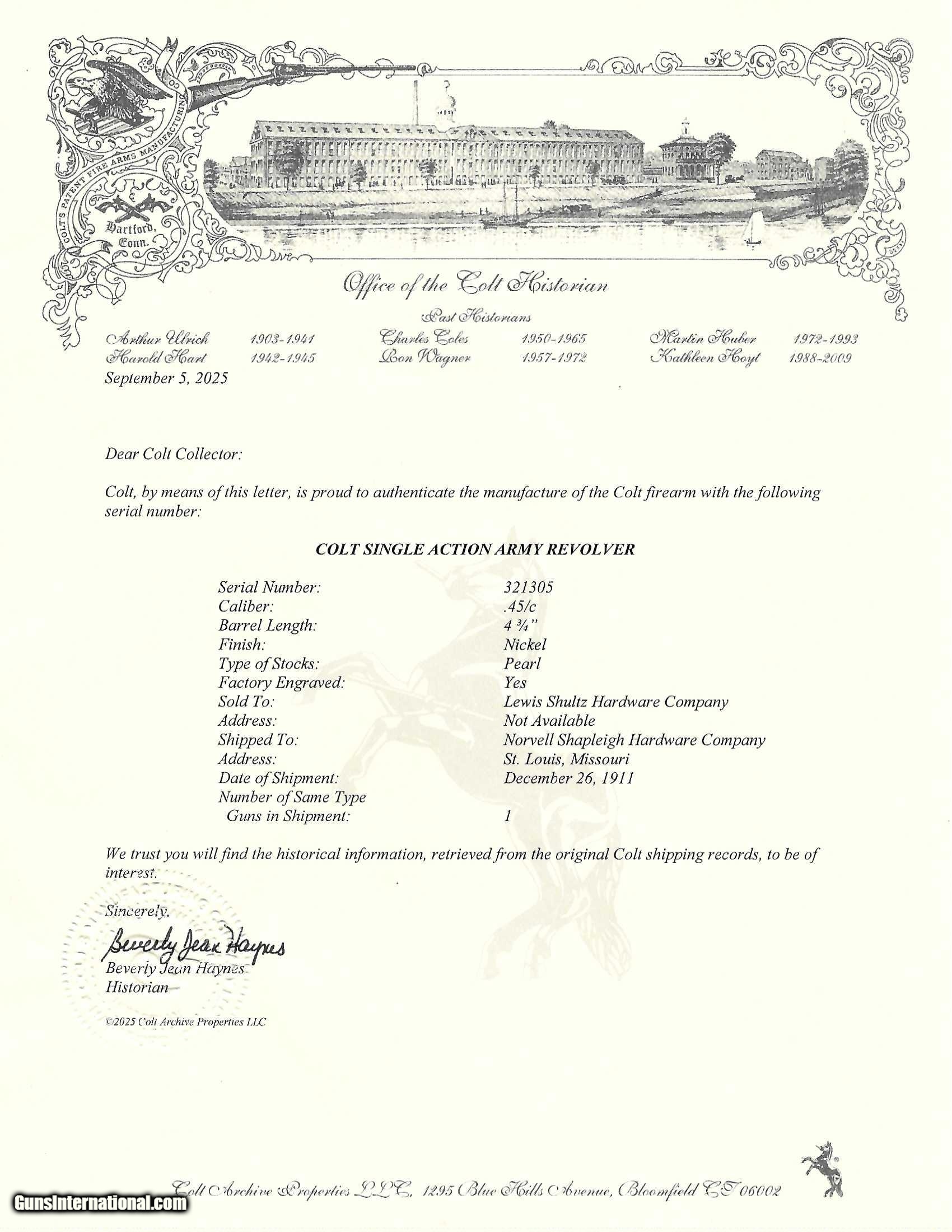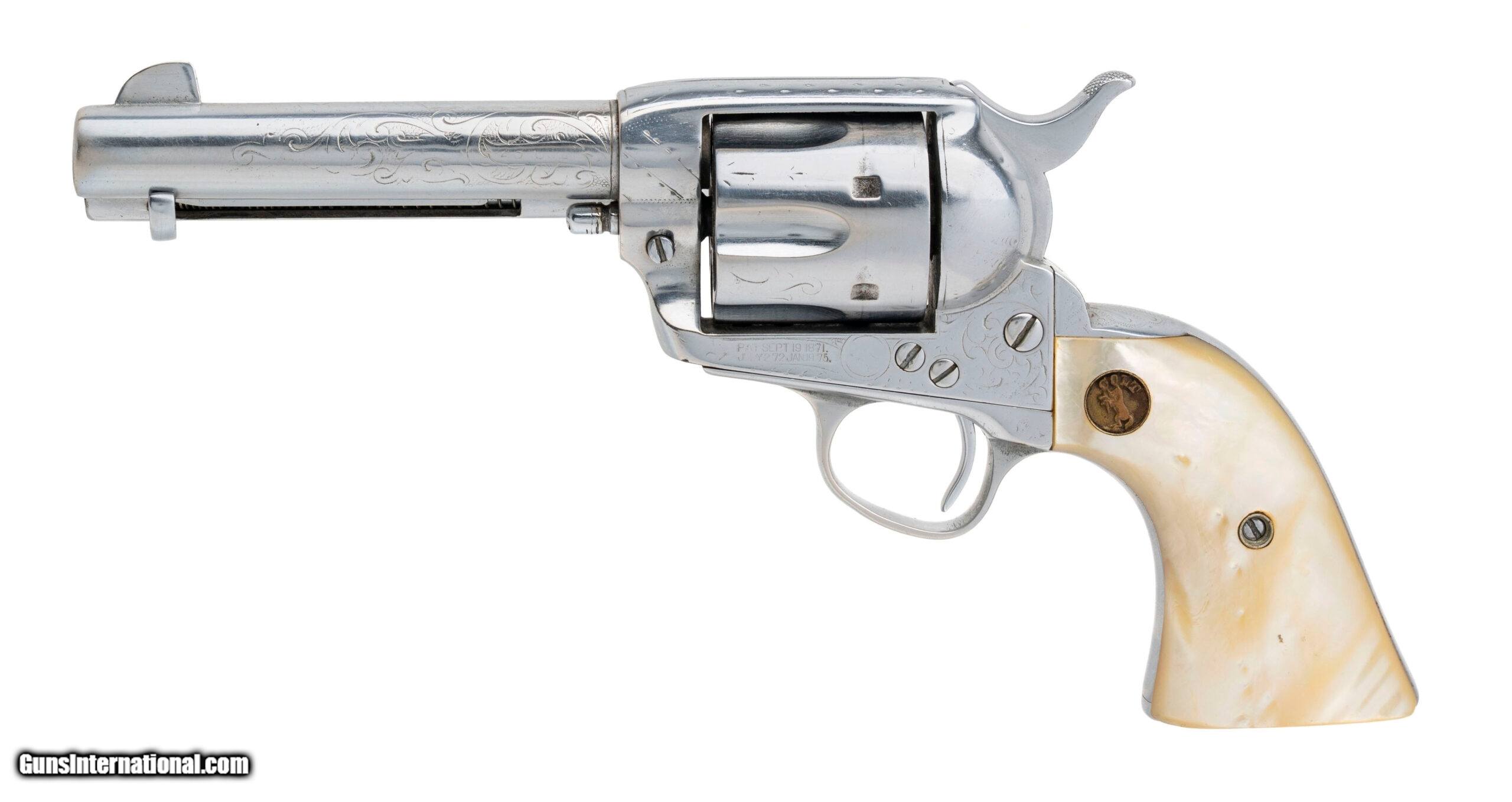 Description: "Serial number 321305. Made in 1911. 45 LC caliber with a 4.75" barrel. This is a factory engraved Cingle action that has been refinished. Unfortunately, the engraving was buffed during the refinishing process. This gun has fantastic deep dish medallion grips. Accompanying this gun is a factory letter confirming all features. It was shipped to Colt distributor Norville Shapleigh Hardware in At. Louis and then Sold to Lewis Shultz Hardware in a shipment of one. We cannot find a record of a Lewis Shultz Hardware, but there was a Lewis Shultz Lumber company in Atchison, Kansas which is probably the same company. Very neat factory engraved Colt Single action that would be perfect for a restoration! SOLD Curio/Relic: Yes |