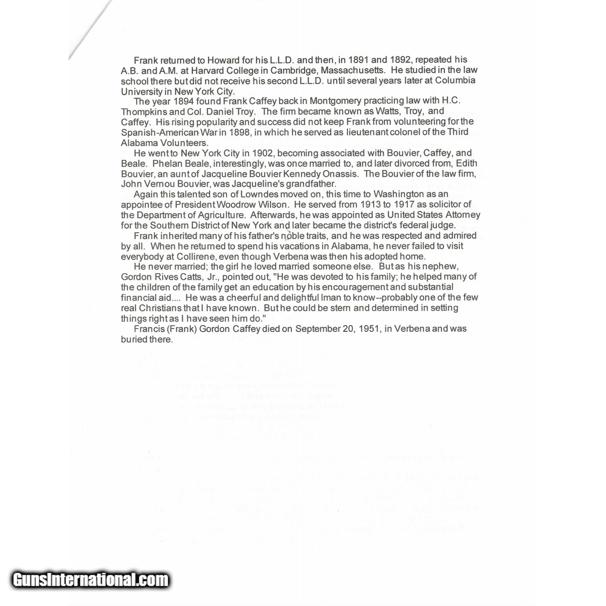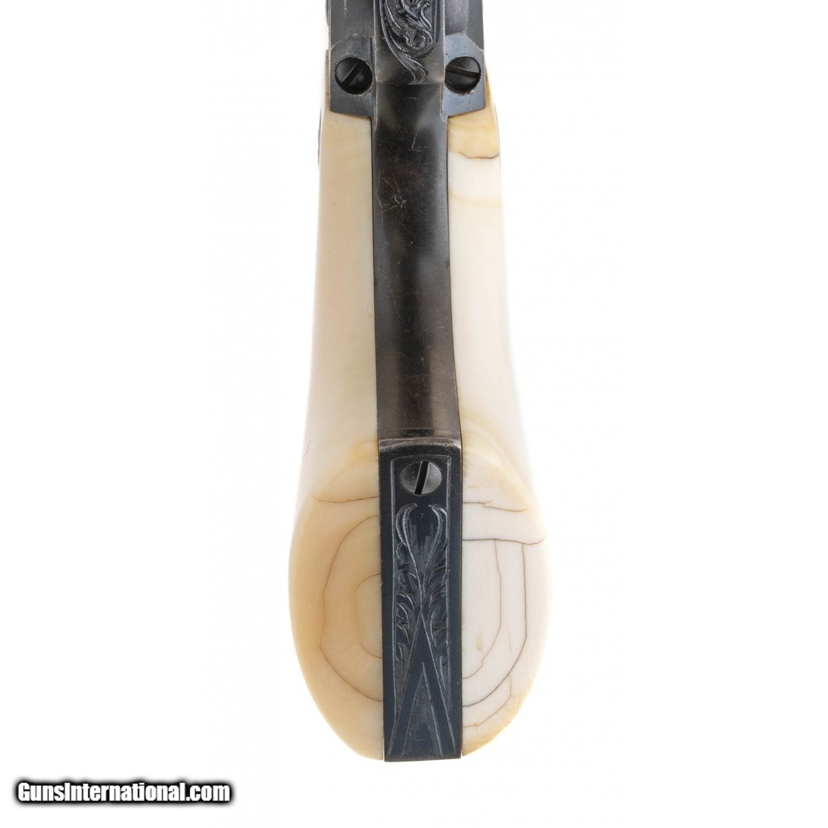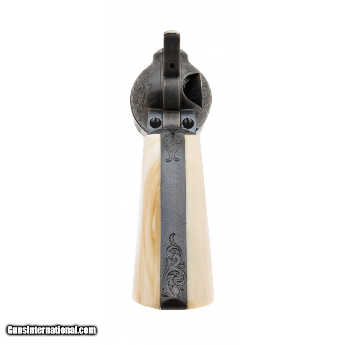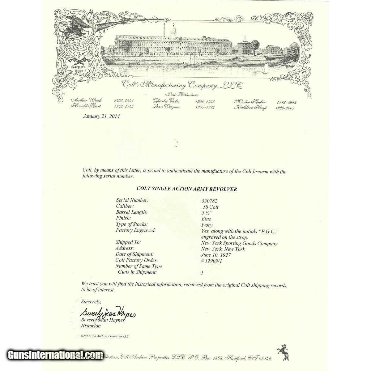 Description: "Serial number 350782. Made in 1927. 38 Colt caliber with a 5 ½" barrel. This is a fantastic factory engraved Colt Single Action Army. This gun is in excel condition with most of the original factory finish. The only alteration is the front sight. Grips are factory medallion ivory. This is a Wilber Glahn engraved gun who was the master engraver for Colt during the 1920s. The backstrap behind the hammer is engraved with the initials “F.G.C." The initials stand for Frances Gordon Caffey who was a Senior Judge of the United States District Court for the Southern District of New York. This gun comes with a Factory letter confirming all features except the front sight which is a period replacement. SOLD Curio/Relic: Yes |