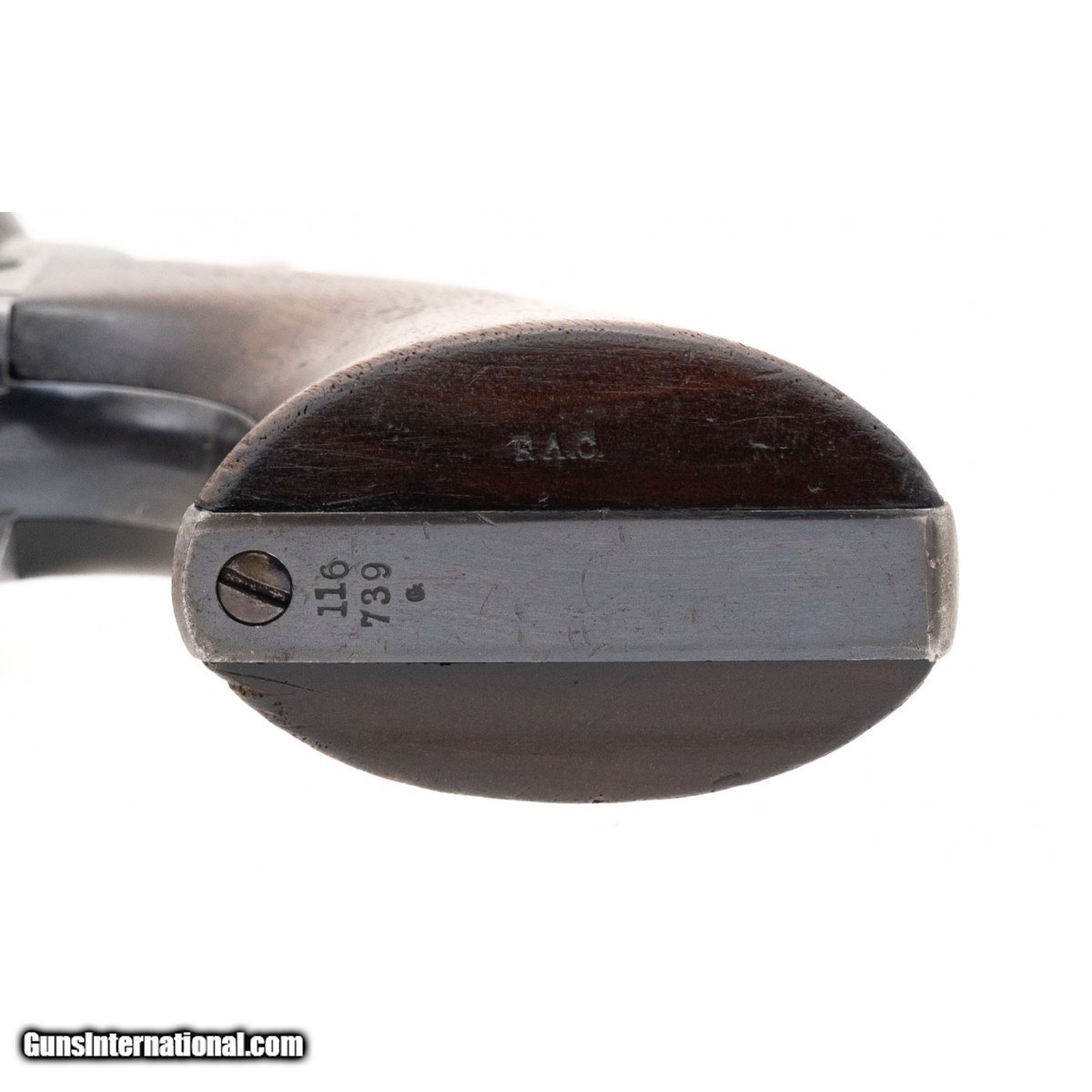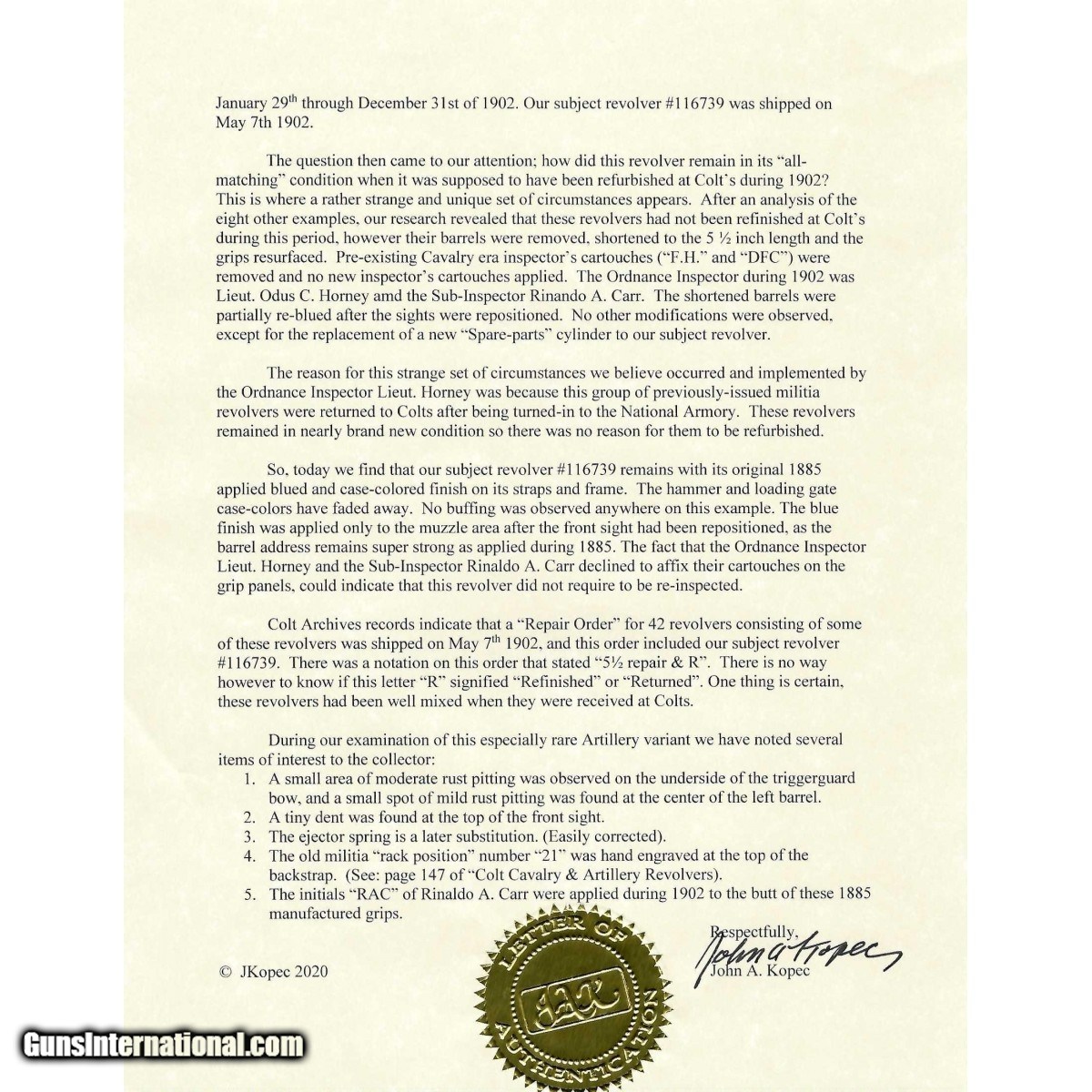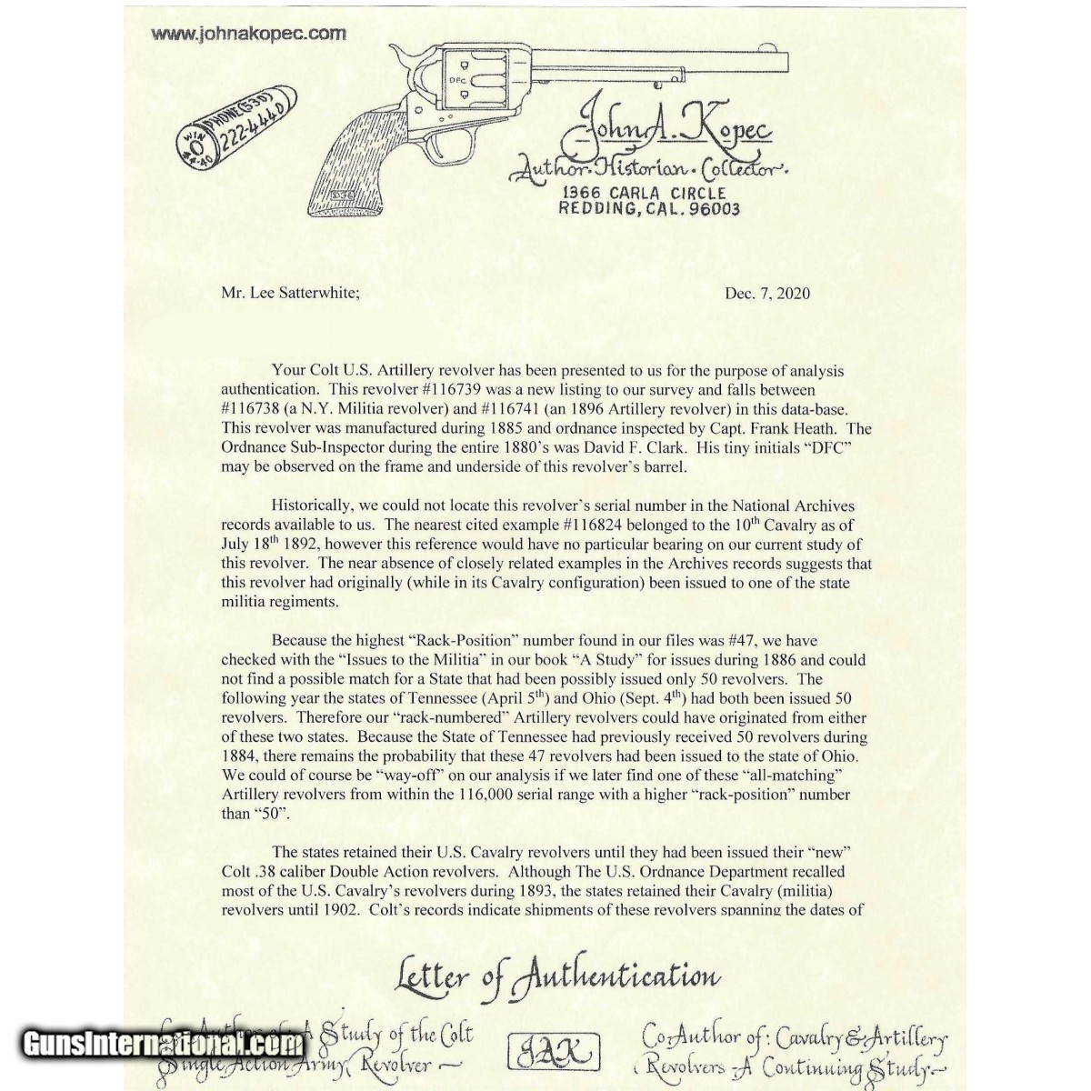 Description: "Serial number 116739. Made in 1885. 45 LC caliber with a 5 ½" barrel. This is a fantastic all matching artillery model. Almost all of the artillery models consist of non matching parts. This is one of only a handful that is all matching. This gun is in excellent condition with 95%+ of the original blue on the barrel and almost all of the case colors on the frame. Grips are excellent. This gun comes with a letter of authentication from noted Colt Single Action expert John Kopec. He declares it all original and awarded this gun the coveted Golden seal reserved for only the original and finest guns at Mr. Kopec’s discretion. This gun is also accompanied by an unpublished article on these rare all matching Colt Artillery models. SOLD Antique: Yes |