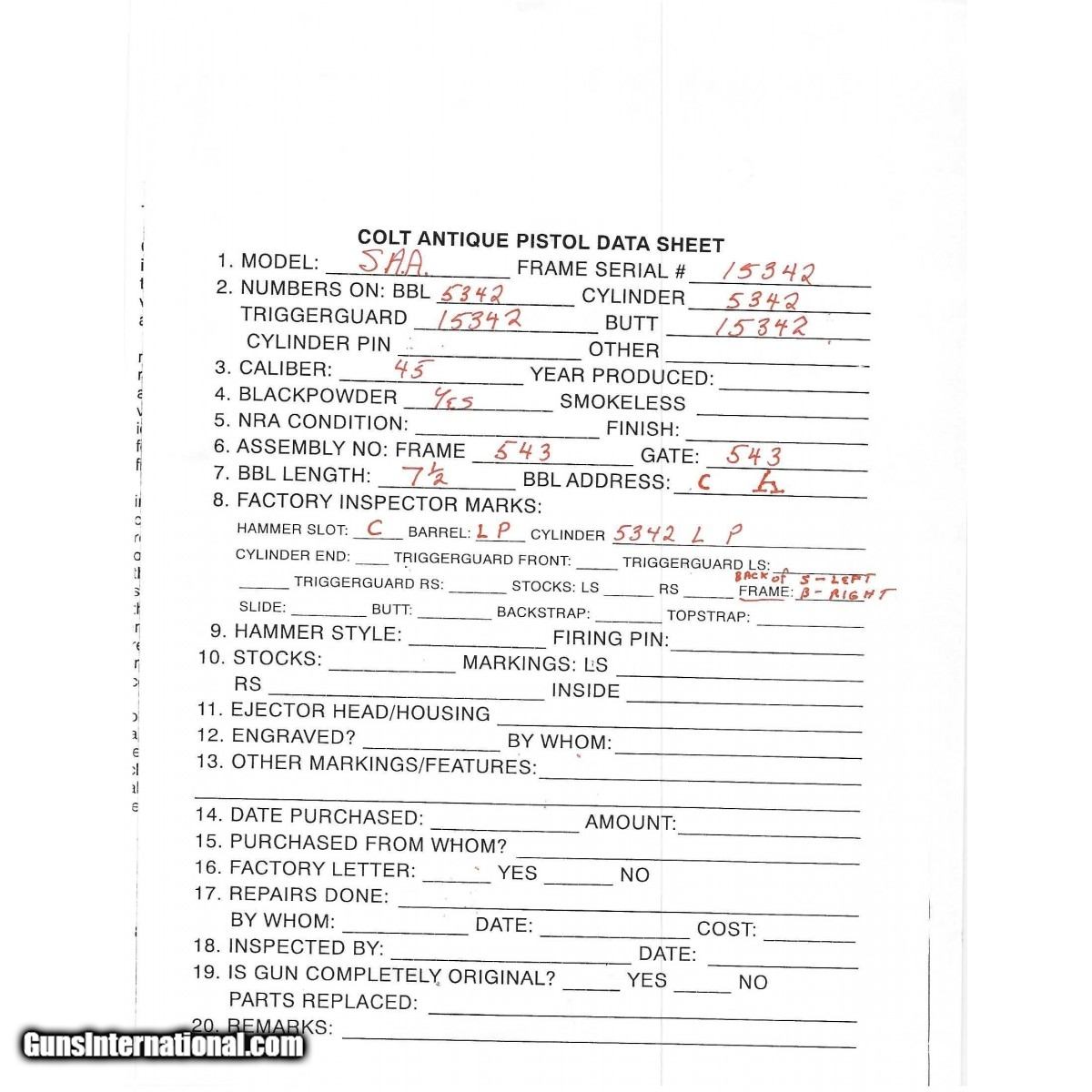 Description: " Serial number 15342. Made in 1875. 45LC caliber with a 7 ½" barrel. This gun has a dark brown artificial patina. This is a scarce Lewis inspected gun. He is one of the rarest US Martial inspectors. This gun has had a lot of restoration. Numerous small parts are replacements and most of the markings have been reapplied. CONSIGNMENT. SOLD Antique: Yes |