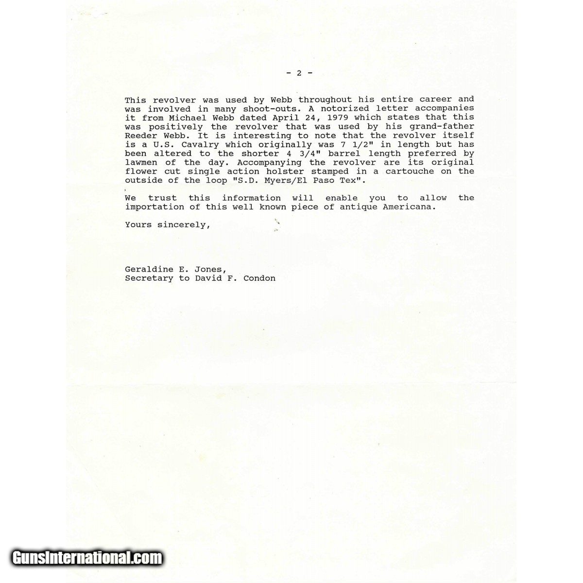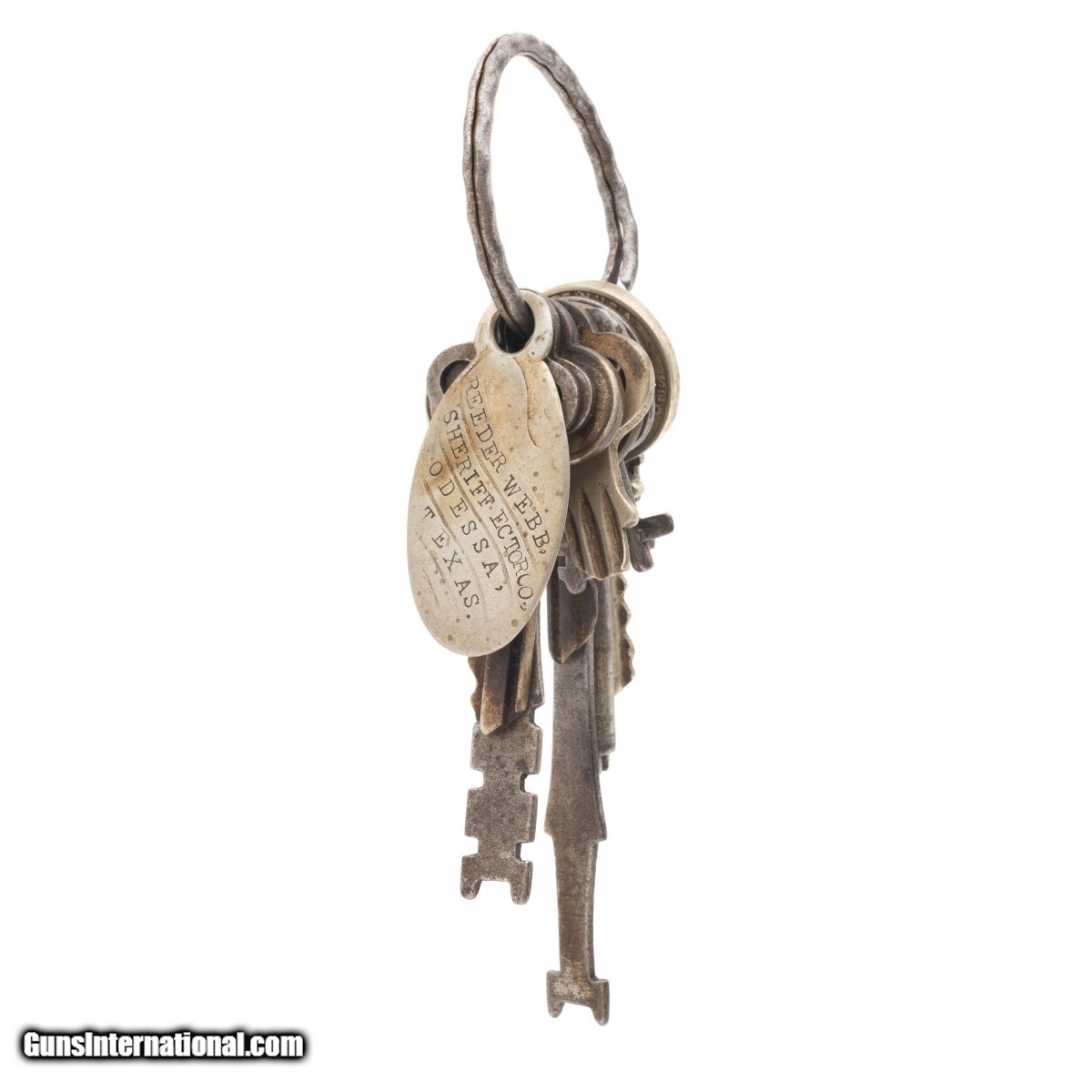 Description: " Famous Sheriff Reeder Webb's Colt Single Army revolver serial number 121135 with a 4 ¾" barrel chambered in .45lc. Serial numbers are matching, and frame is U.S. marked with D.F.C and H.N. noted underside of the barrel. Frame looks to have been refinished some time ago with pin-prick surface oxidation visible. Cylinder and barrel are a light grey patina with shallow pitting present in some areas. Action functions and indexes properly with a tight lock up. Bore is good with strong rifling visible. Reeder Webb served as Sheriff of Odessa, Texas and Ector County from January 1923- January 1941. Sheriff Webb was involved in numerous shoot-outs over the years, with the most famous one happening in 1927 when he slayed two bank robbers. Also included is a S.D. Myres, El Paso, Texas tooled leather holster with “Jan. 1923 Reeder Webb, Sheriff Ector County, Odessa, Texas". A set of 13 keys that were carried by the Sheriff and include keys to the jail. Lastly are a small leather billy club and knuckle duster. SOLD Antique: Yes |