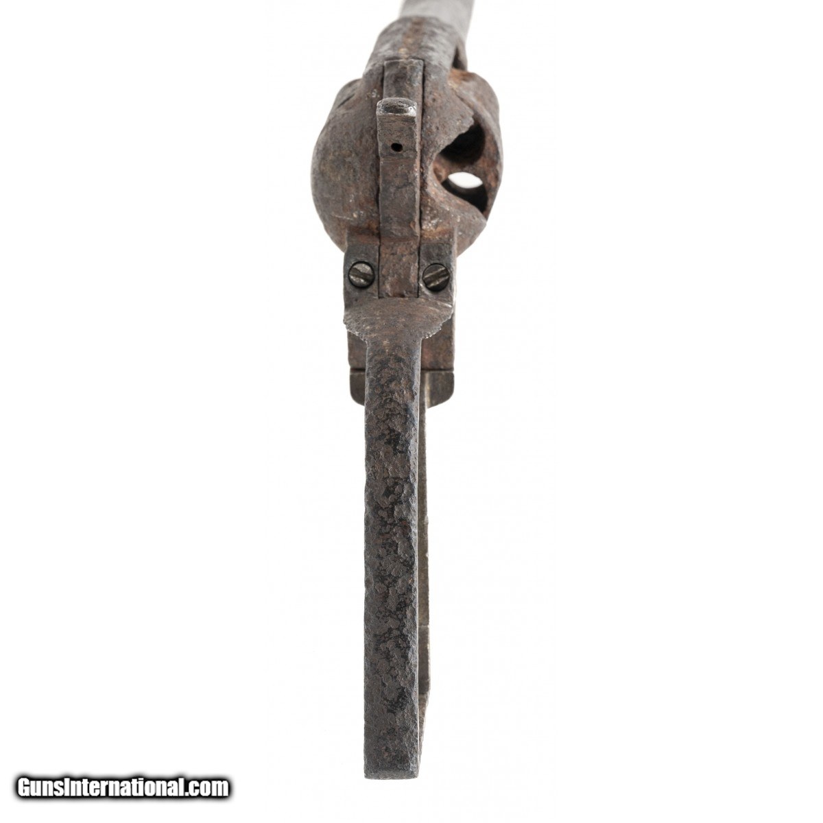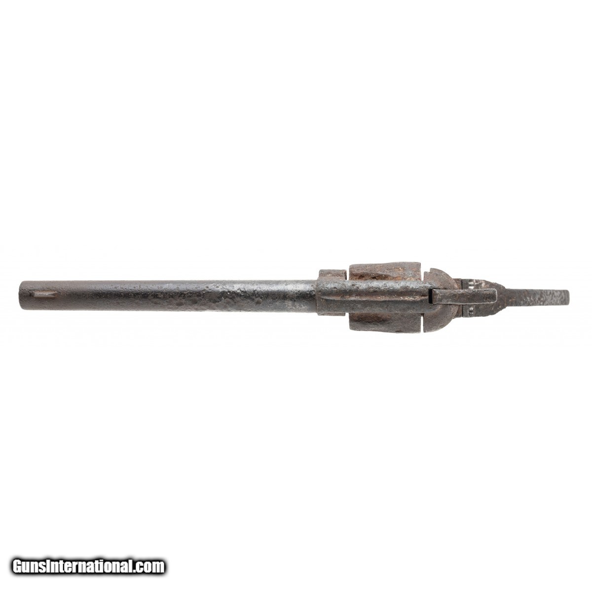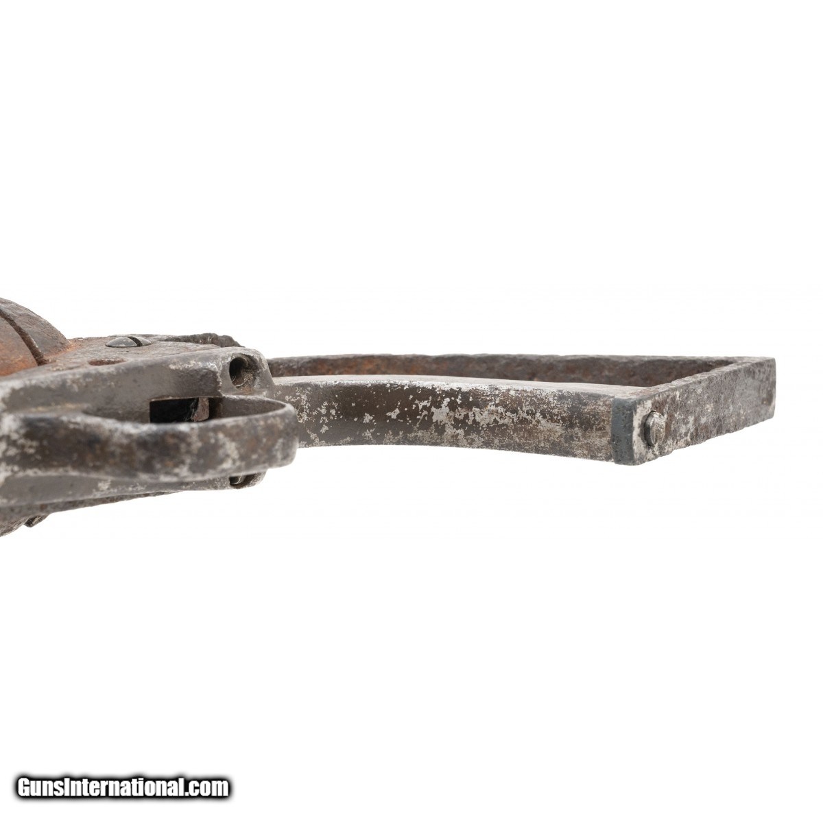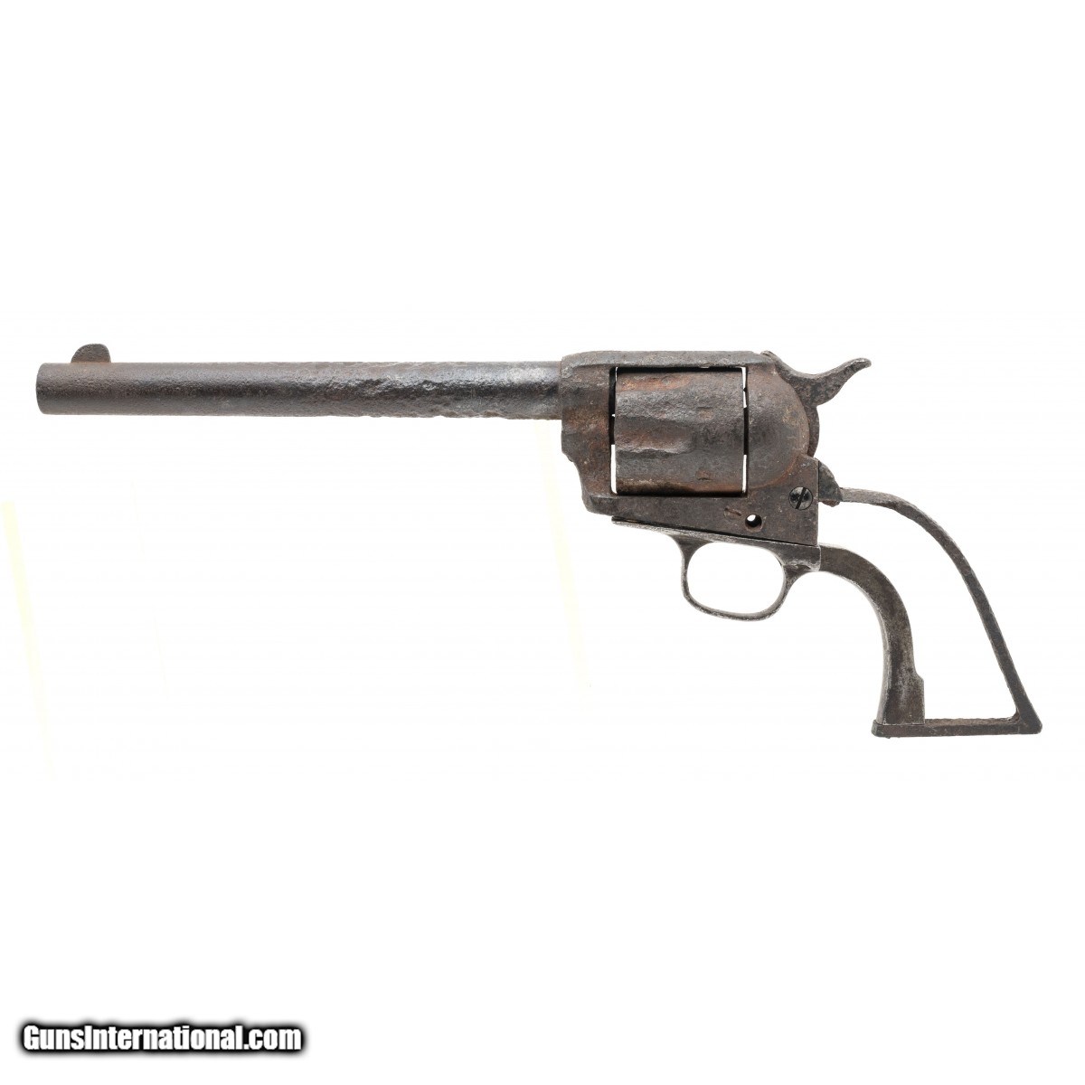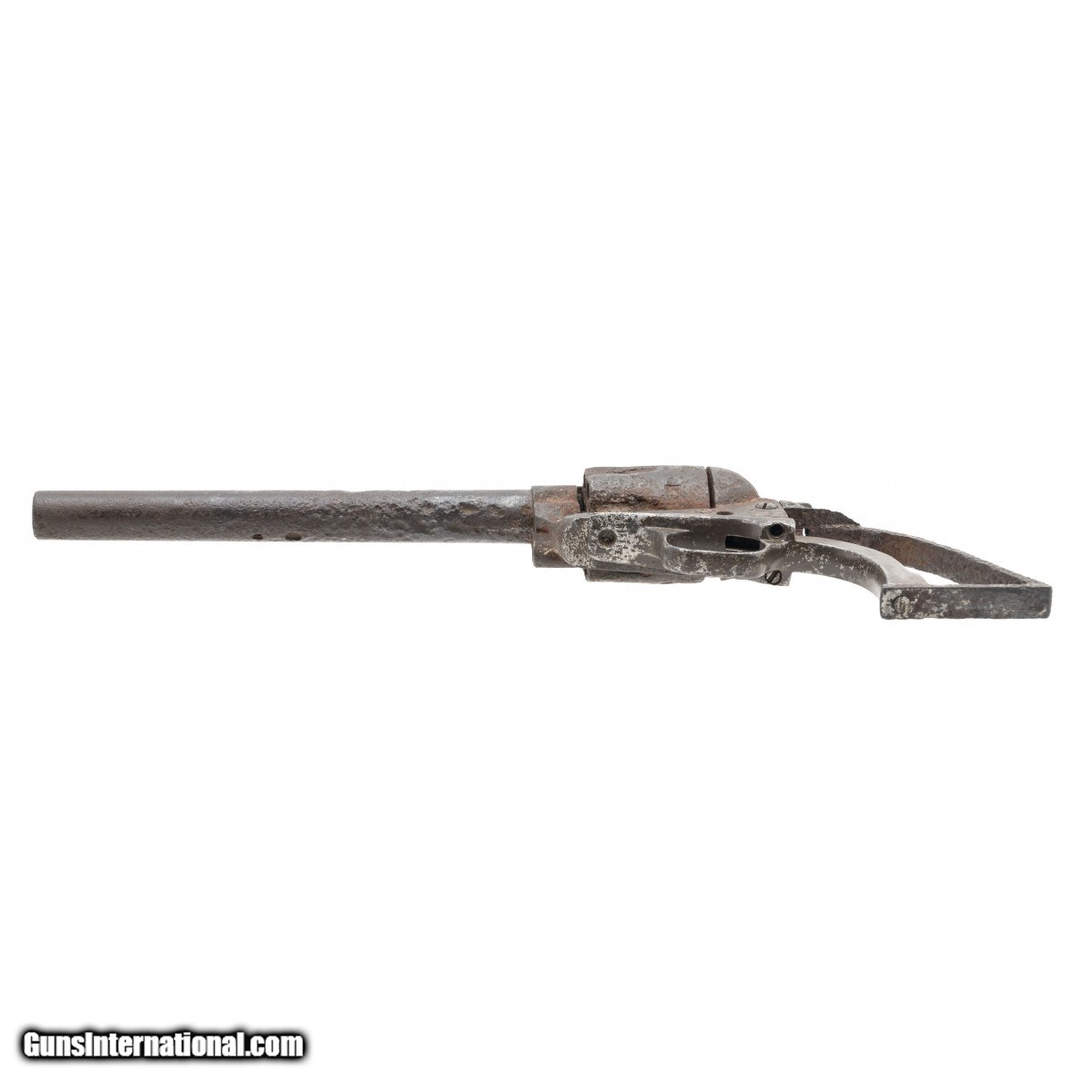 Description: " SN: 96190. Made in 1883. 45LC caliber with a 7 ½" barrel. This gun is heavily pitted and in “as found" relic condition. There is a tag from a previous collector that identifies this gun as “Dug up in Uvalde Texas" Obviously, the tag’s author meant Uvalde, Texas. We cannot guarantee the provenance. What is interesting is this gun has an earlier barrel with the extra cut for the ejector rod housing retainer stud. The frame and cylinder, and the barrel have different appearing patinas. We believe this gun was assembled from several dug parts. SOLD Antique: Yes |
