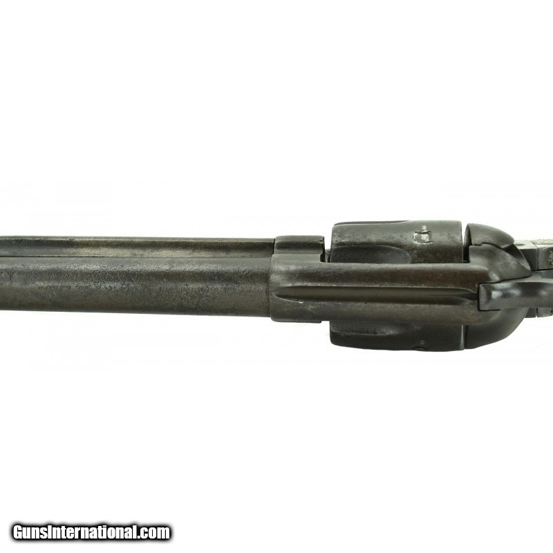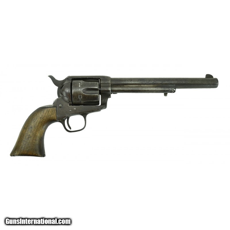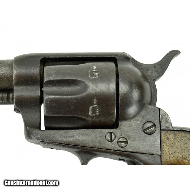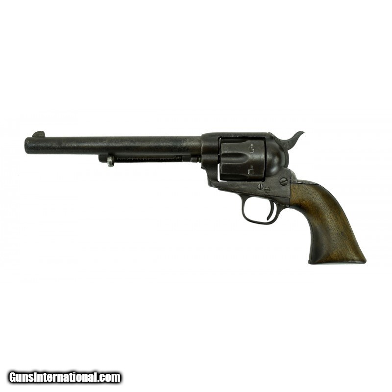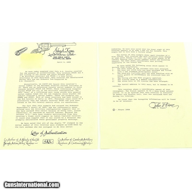 Description: "U.S. Martial Colt Single Action Army Ainsworth Revolver. Made in 1874. Metal has a dark brown patina with spots of pitting throughout. All Ainsworth markings are present. The “U.S." on the left hand side of the frame has been obliterated during the time of use. John Kopec suggests the gun was captured by Indians which is not something you normally find in one of his letters. This gun comes with a Kopec letter that mentions minor modifications that were done in the period of use and Kopec calls this gun “an honest old Cavalry Colt". This gun was found in Texas a number of years ago and we can write a letter stating that if the buyer wishes. SOLD Antique: Yes |