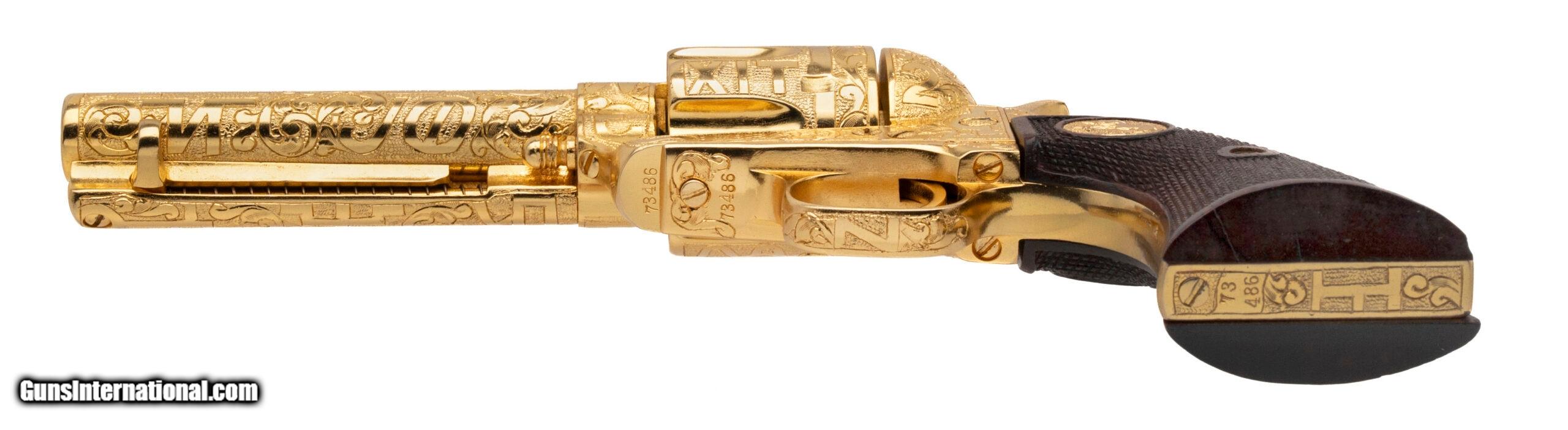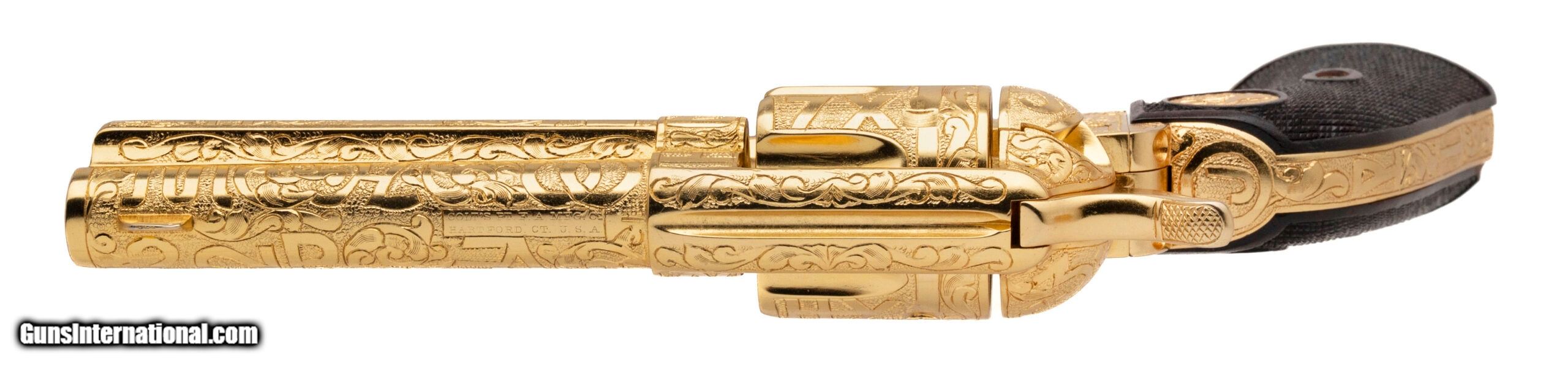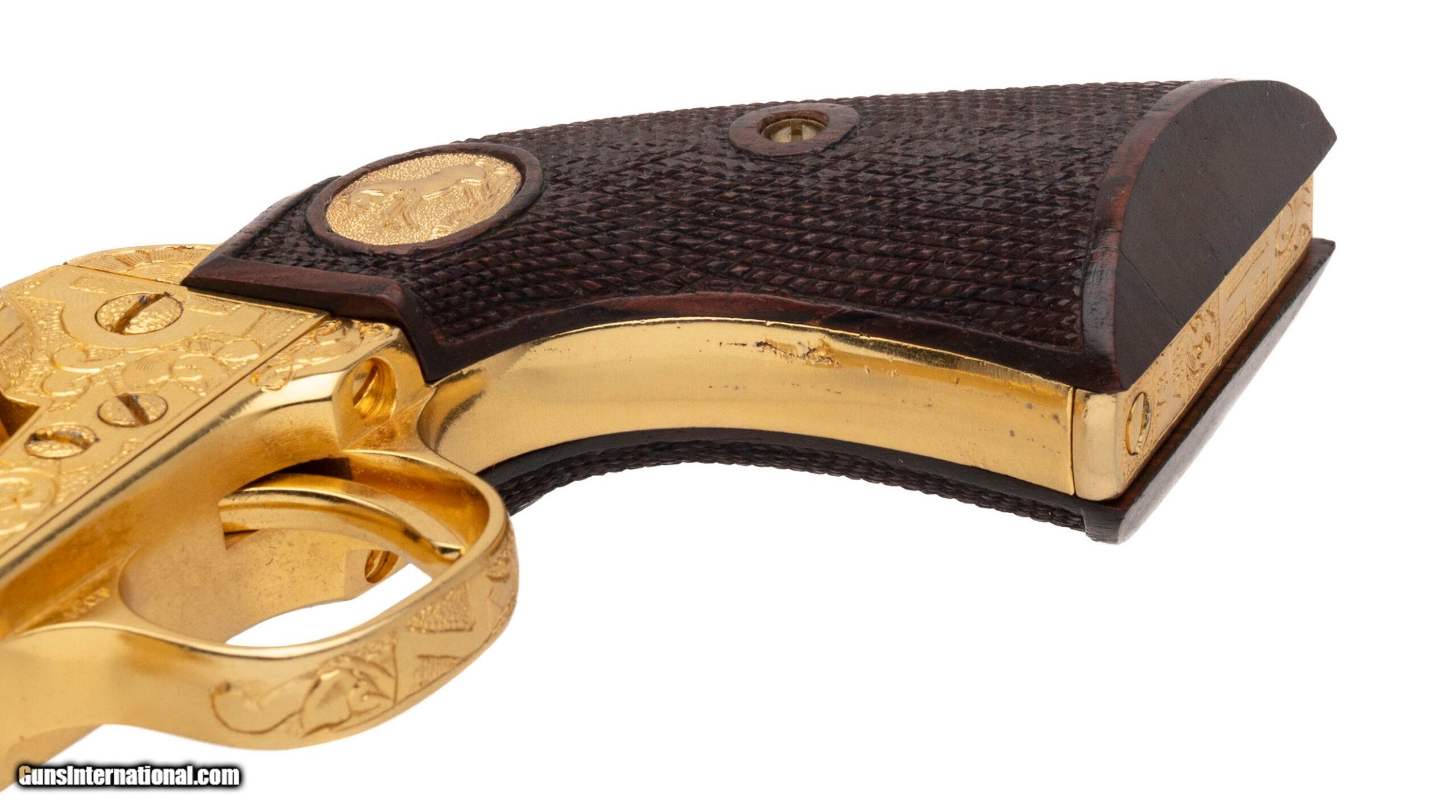 Description: "Serial number 73486. Made in 1881. 44-40 caliber with a 4.75" barrel. This gun is in like new condition as engraved and gold inlaid by legendary engraver Weldon Bledsoe. The left hand side of the barrel has the 2 LAZY 2 P brand that both Cole Agee and Bledsoe used. Mr. Bledsoe was trained by Cole Agee. This gun has a factory letter we believe is a factory error. It lists this gun as a US Cavalry model, but this gun is a 4 ¾"" barrel in 44-40 and all parts are matching and do not appear modified. The right hand side of the frame has the Weldon Bledsoe engraving mark. The grips are nicely checkered and have gold plated medallions. These guns have a velvet lined case accompanying this gun with a label describing this gun. Very fine Texas engraved Colt Single Action Army by well known Texas engraver Weldon Bledsoe. SOLD Antique: Yes |