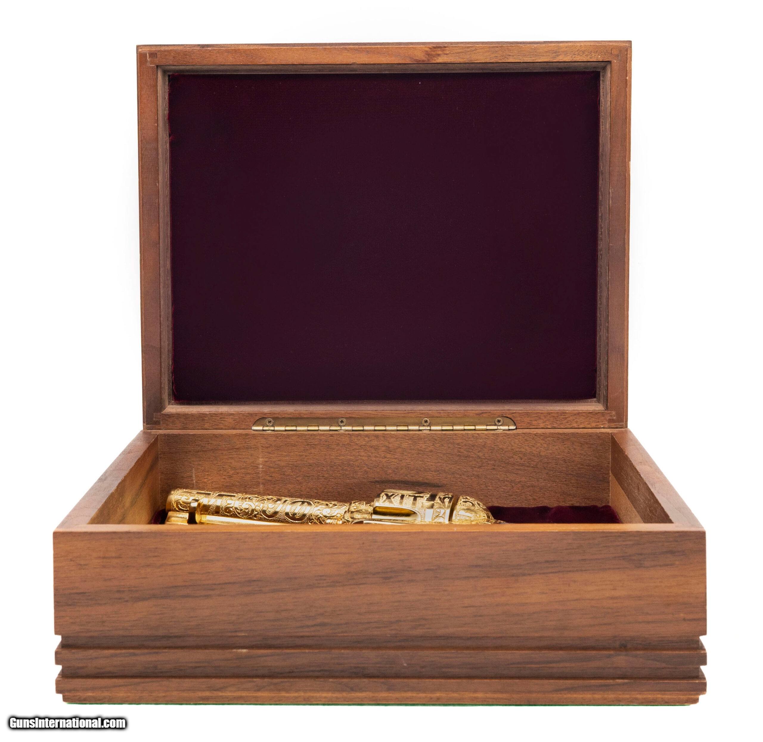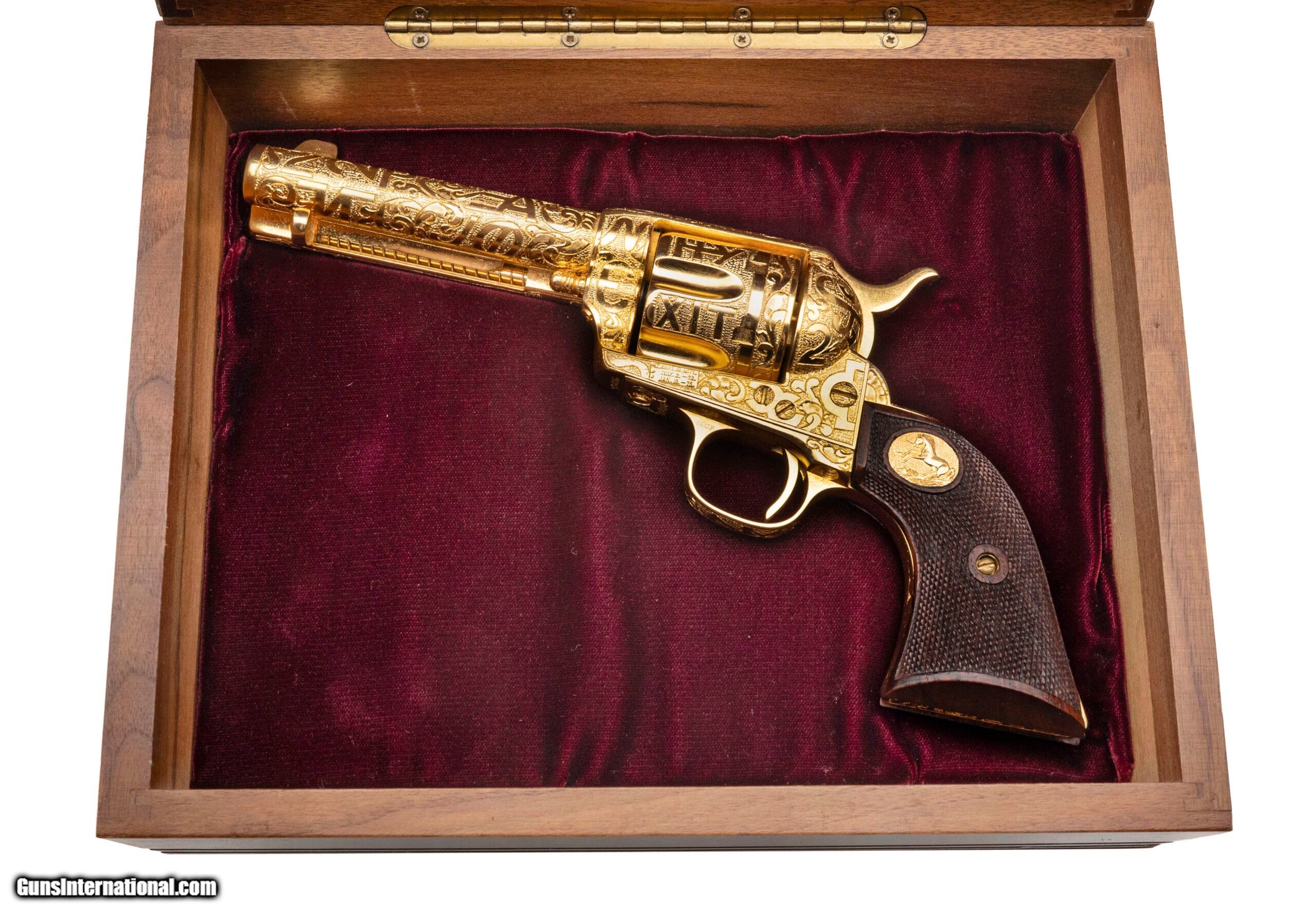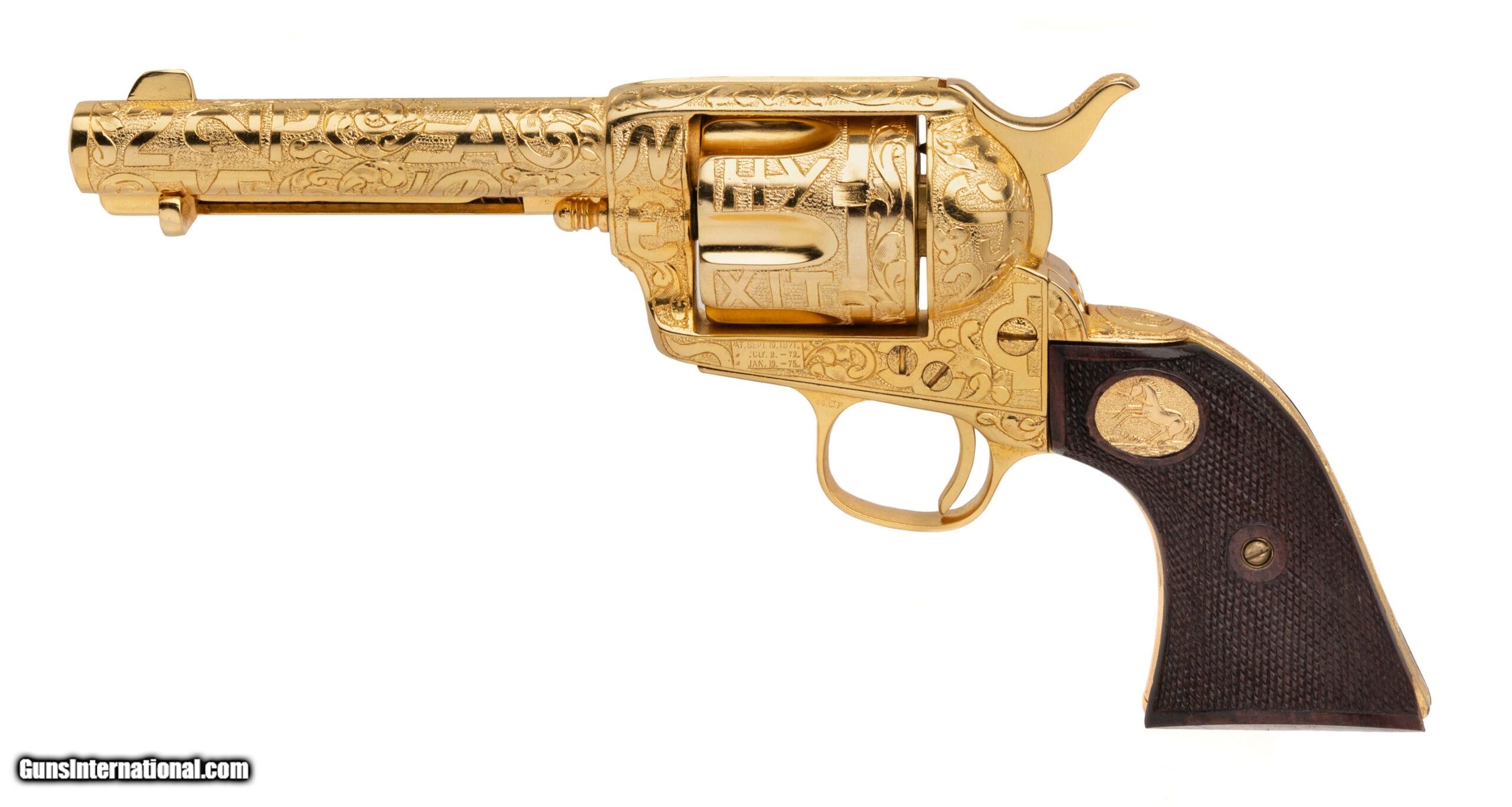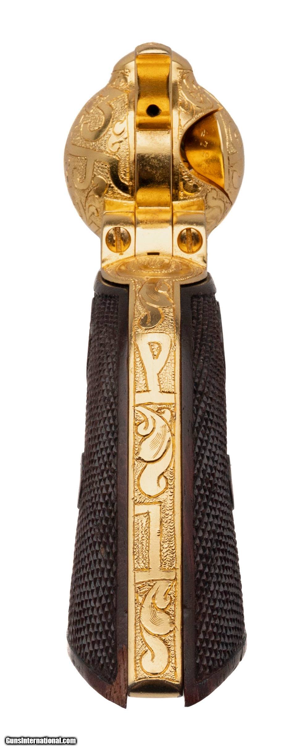 Description: "Serial number 73486. Made in 1881. 44-40 caliber with a 4.75" barrel. This gun is in like new condition as engraved and gold inlaid by legendary engraver Weldon Bledsoe. The left hand side of the barrel has the 2 LAZY 2 P brand that both Cole Agee and Bledsoe used. Mr. Bledsoe was trained by Cole Agee. This gun has a factory letter we believe is a factory error. It lists this gun as a US Cavalry model, but this gun is a 4 ¾"" barrel in 44-40 and all parts are matching and do not appear modified. The right hand side of the frame has the Weldon Bledsoe engraving mark. The grips are nicely checkered and have gold plated medallions. These guns have a velvet lined case accompanying this gun with a label describing this gun. Very fine Texas engraved Colt Single Action Army by well known Texas engraver Weldon Bledsoe. SOLD Antique: Yes |