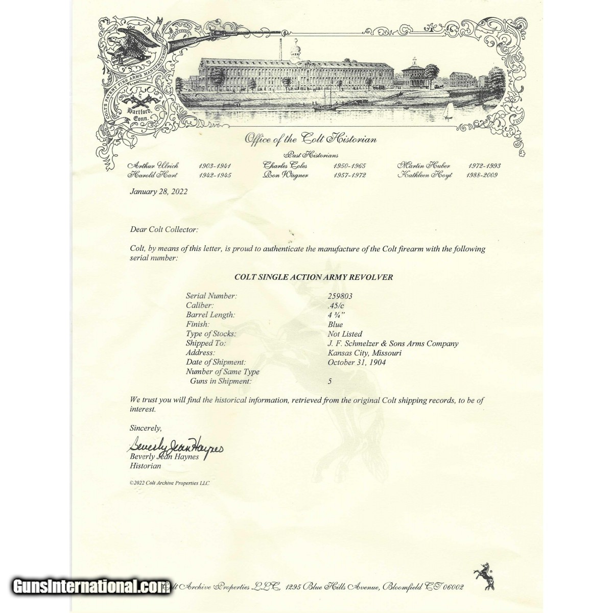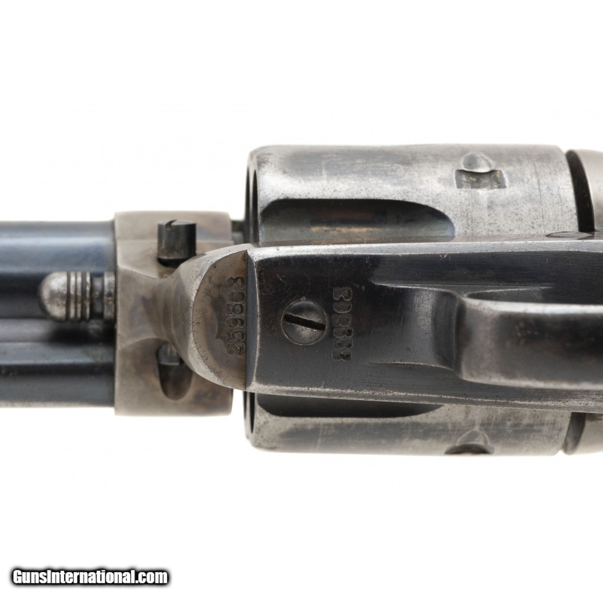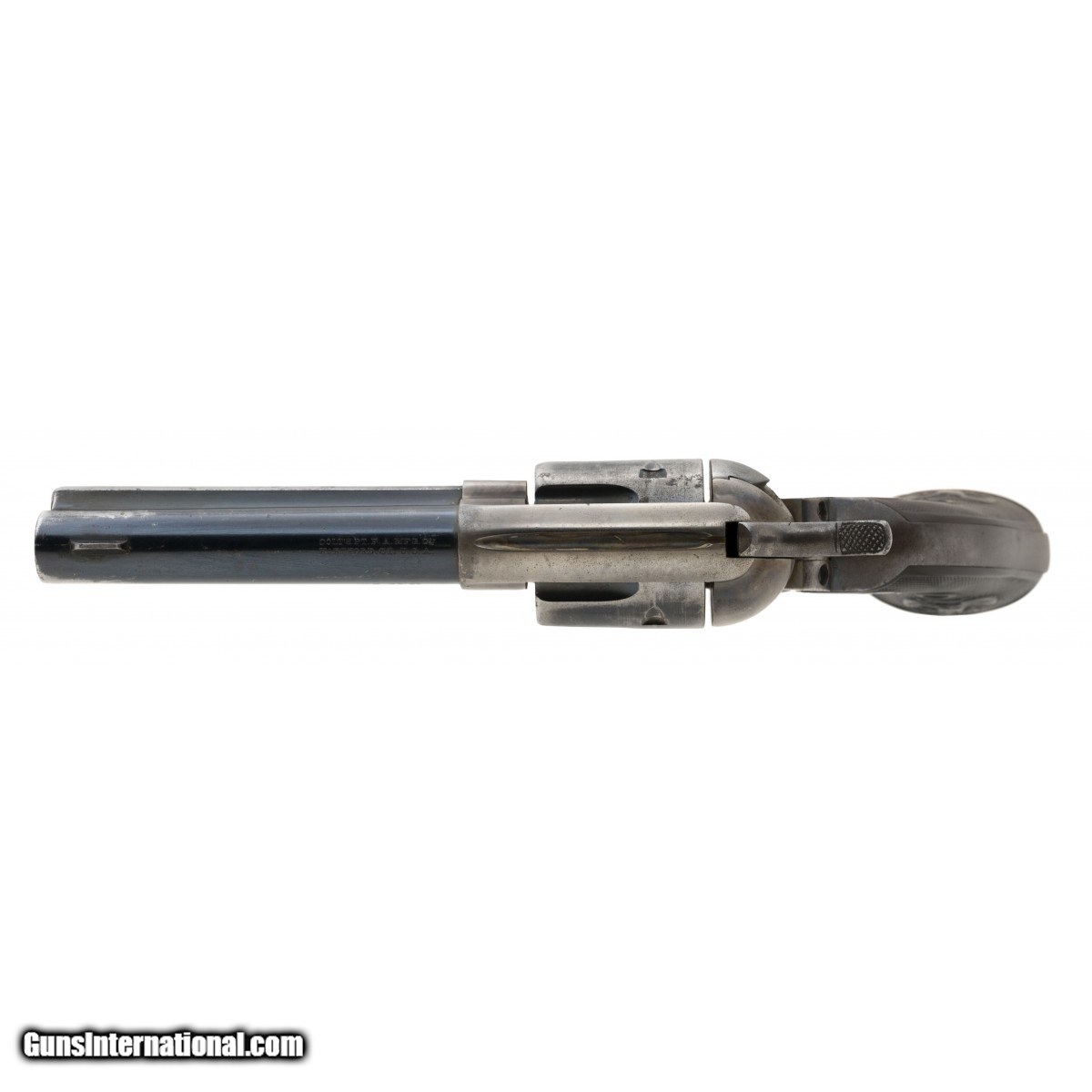 Description: "Serial number 259803. Made in 1904. 45 LC with a 4 ¾" barrel. This is a very fine gun with approximately 50% of the original blue. The case colors are very good. Grips are good as well, but are off an earlier gun. They match the condition of this gun however. The right hand side of the frame has the Wells Fargo Marking. It is no0t typical from the standard Wells Fargo marking and this gun was not shipped to the Wells Fargo Purchasing Agent William Ashton. We do not guarantee the marking. This gun comes with a Factory letter confirming the configuration and it was shipped to J. F. Schmelzer & Sons Arms Company in Kansas City, Mo. SOLD Curio/Relic: Yes |