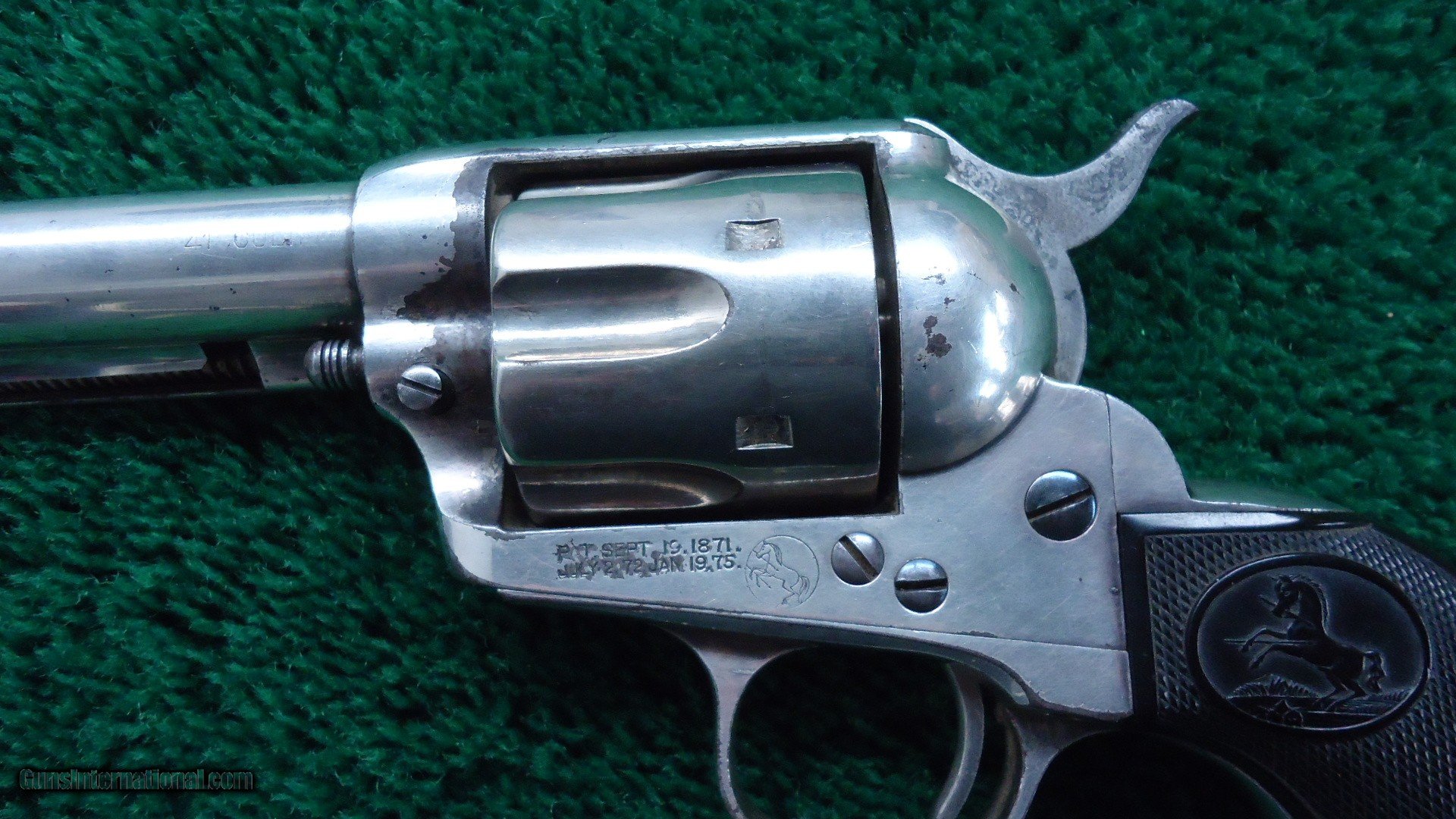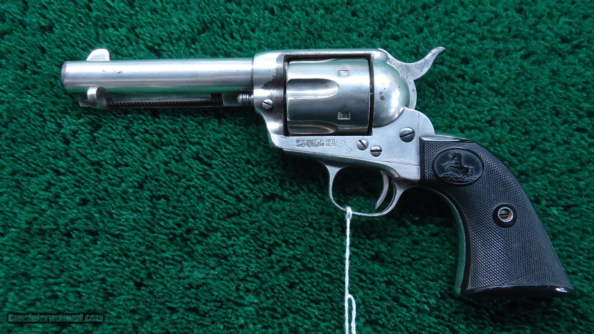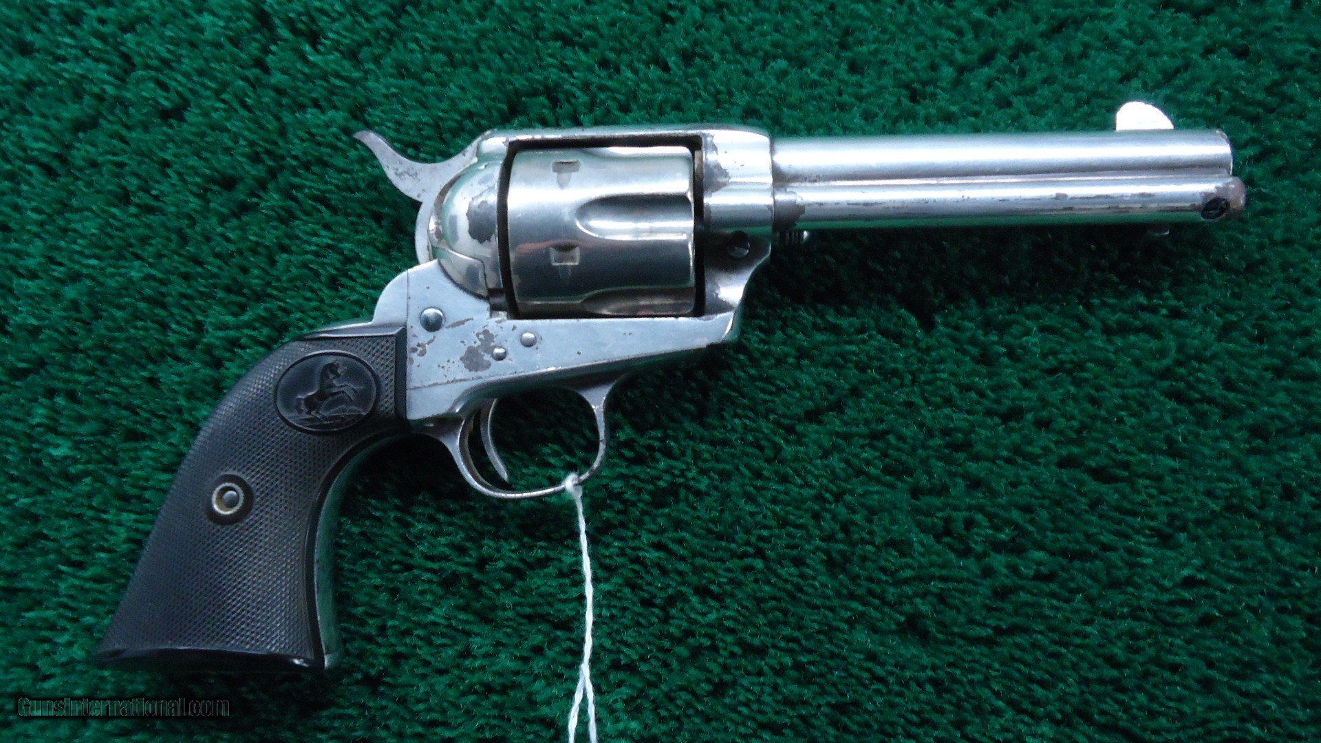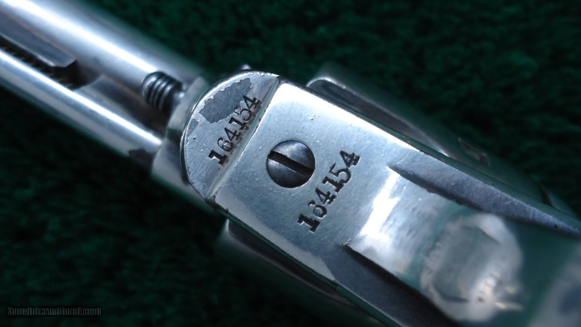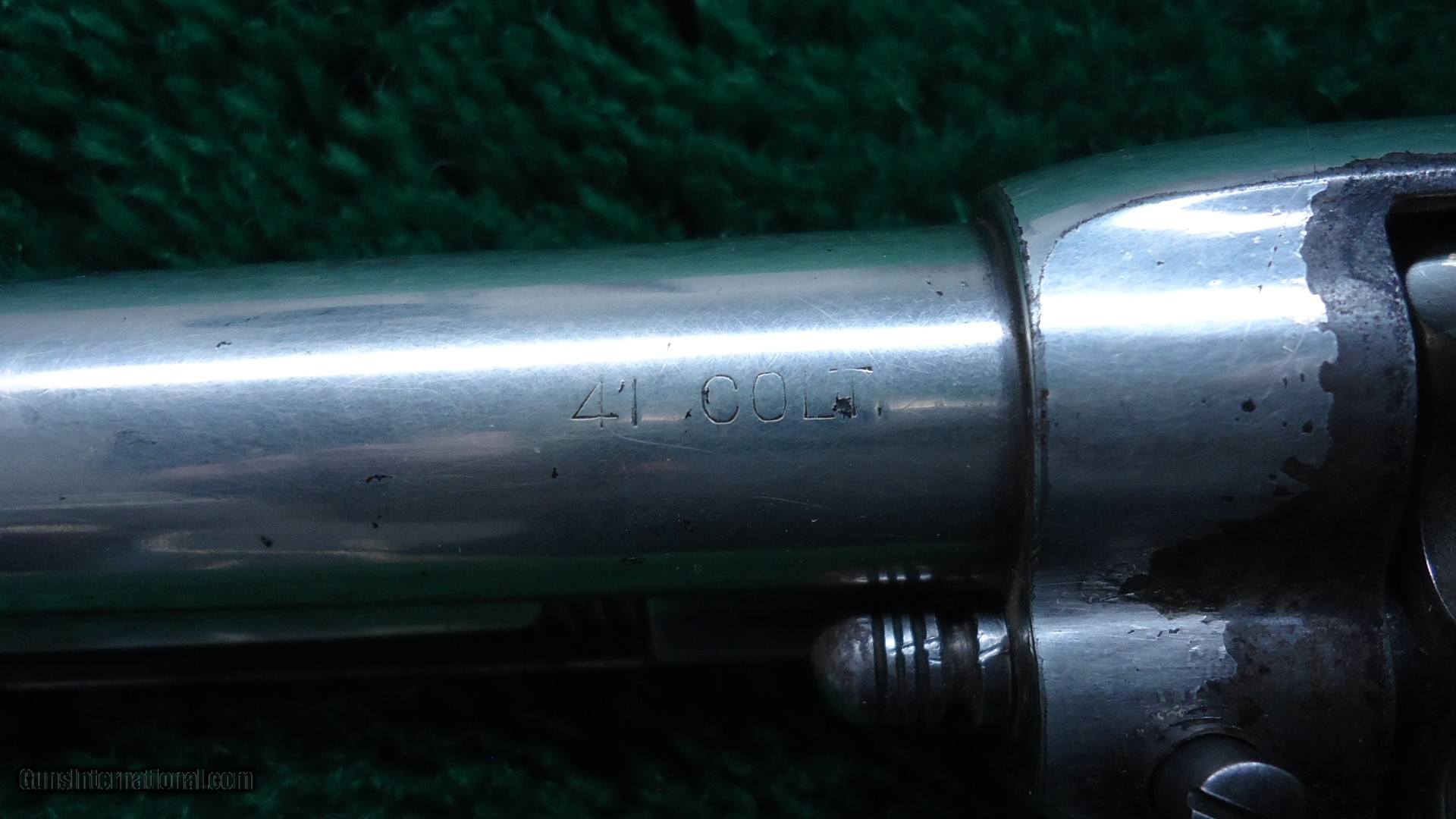 Description: 4-3/4 inch barrel with correct 2 line barrel address chambered in 41 Colt caliber. Bright shiny bore with sharp rifling. This gun appears to have been re-nickeled at some time and retains a good amount of that finish. It is starting to flake in some areas. Markings are light. Crisp tight action. Just a few light pits. Hard rubber grips fit very well and show little wear. All matching exterior numbers. Bright blue screw heads. This is a very attractive Colt made in 1896. Leroy Merz Antique Firearms specializes in antique and vintage Winchesters and other fine American firearms. Since 1965 Mr. Merz has taken part in the world of firearms and has been a contributor to many well known reference books. We have hundreds of additional guns in every price range at our home online. Search for Merz Antiques in google. SOLD Antique: Yes Handgun Caliber: .41 Long Colt (.41 Colt, .41 LC) |