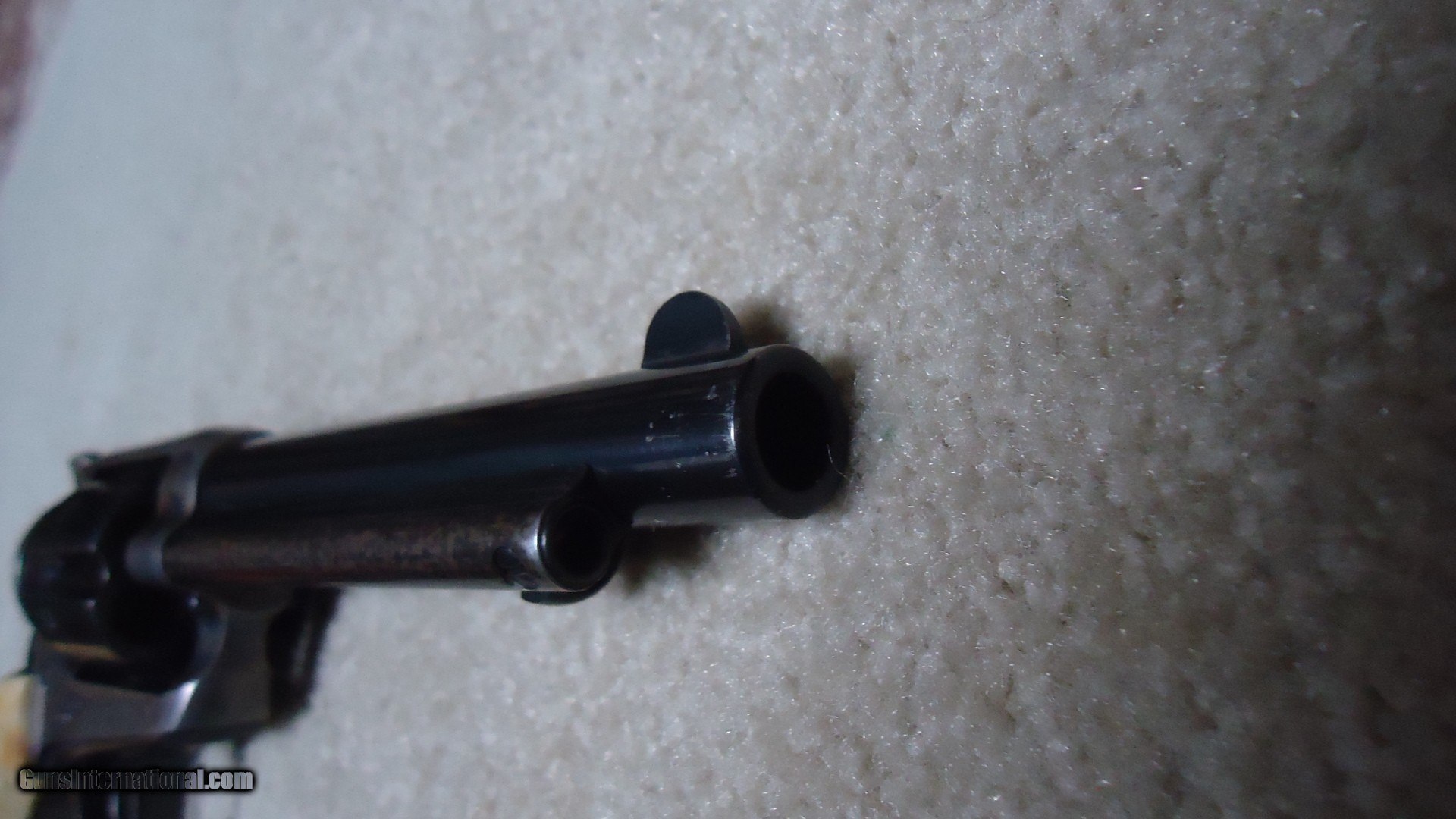 Description: SINGLE ACTION ARMY .45 COLT, 5 1/2" BARREL, #345XXX, MADE 1923. Nice Roaring Twenties vintage revolver that retains most of the deep blue overall with only some flaking/thinning on the outside portion of the ejector housing and some minor edge wear to the usual parts and light cylinder ring. Fine case colored frame shows vivid color in the more protected areas and lighter (but still good) case color on the balance and hammer (looks better than photos show). Good fire blue on the screws, un-marred cylinder pin, locks tight, exc. bright bore. this one was period fitted with thick stag grips that are showing some attractive age-yellowing. Matching numbers on the frame and correctly stamped under the grips on the trigger guard and back strap. Excellent sharp markings including the one line barrel address, "45 COLT" on the barrel side and patent dates with rampant colt on the left receiver side. During this time period the Wild West was still very much alive in areas of Montana, Wyoming, Arizona, Texas and New Mexico. SOLD Curio/Relic: Yes Handgun Caliber: .45 Colt Manufacturer: COLT Model: SAA FIRST GENERATION Serial Number: 345XXX Barrel Length: 5 Condition: EXCELLENT Bore Condition: EXCELLENT |