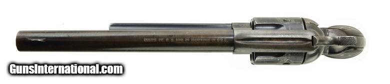 Very Fine Colt Single Action Army .45 Colt caliber revolver. Made in 1893. This gun has a 7½” barrel in .45 LC. This is a very nice gun with lots of finish. The barrel has 50 – 60 % of the original finish while the frame has 70% of the original case colors that have faded dark. Grips are excellent. This gun comes with a factory letter. The letter says this gun has a 4¾” barrel. Since this is a gun that was shipped along with 50 others, it is very possible this is a factory error since both the frame, barrel, grips and other small parts match in condition. This gun was shipped to E.C. Meacham in St. Louis. Meacham was a dealer and outfitter. Nice sharp black powder frame gun!