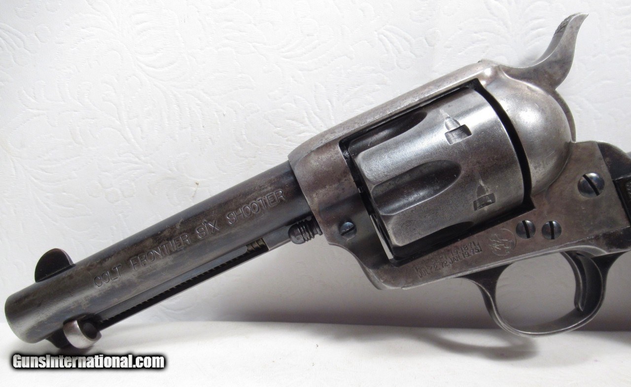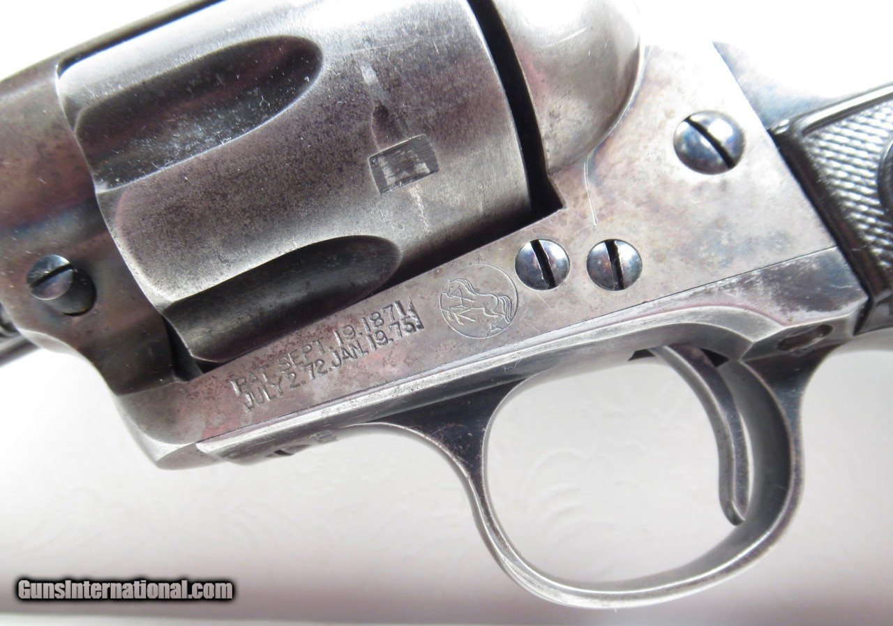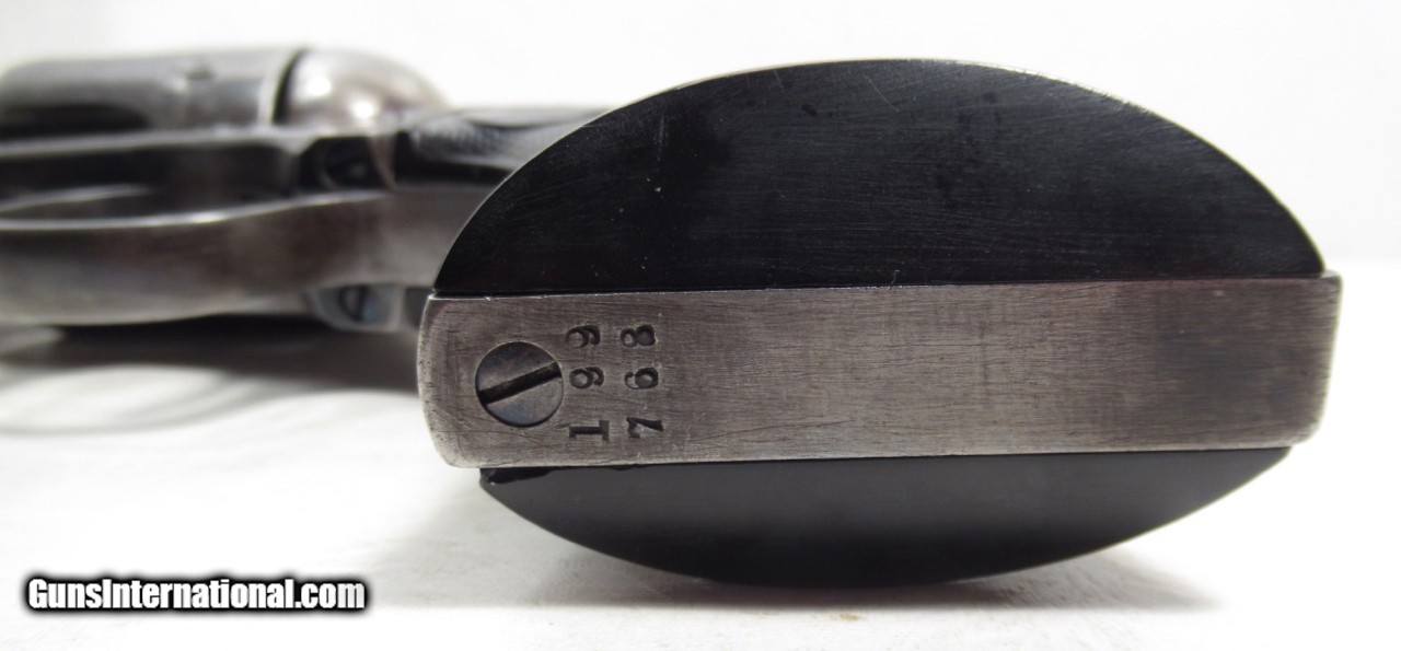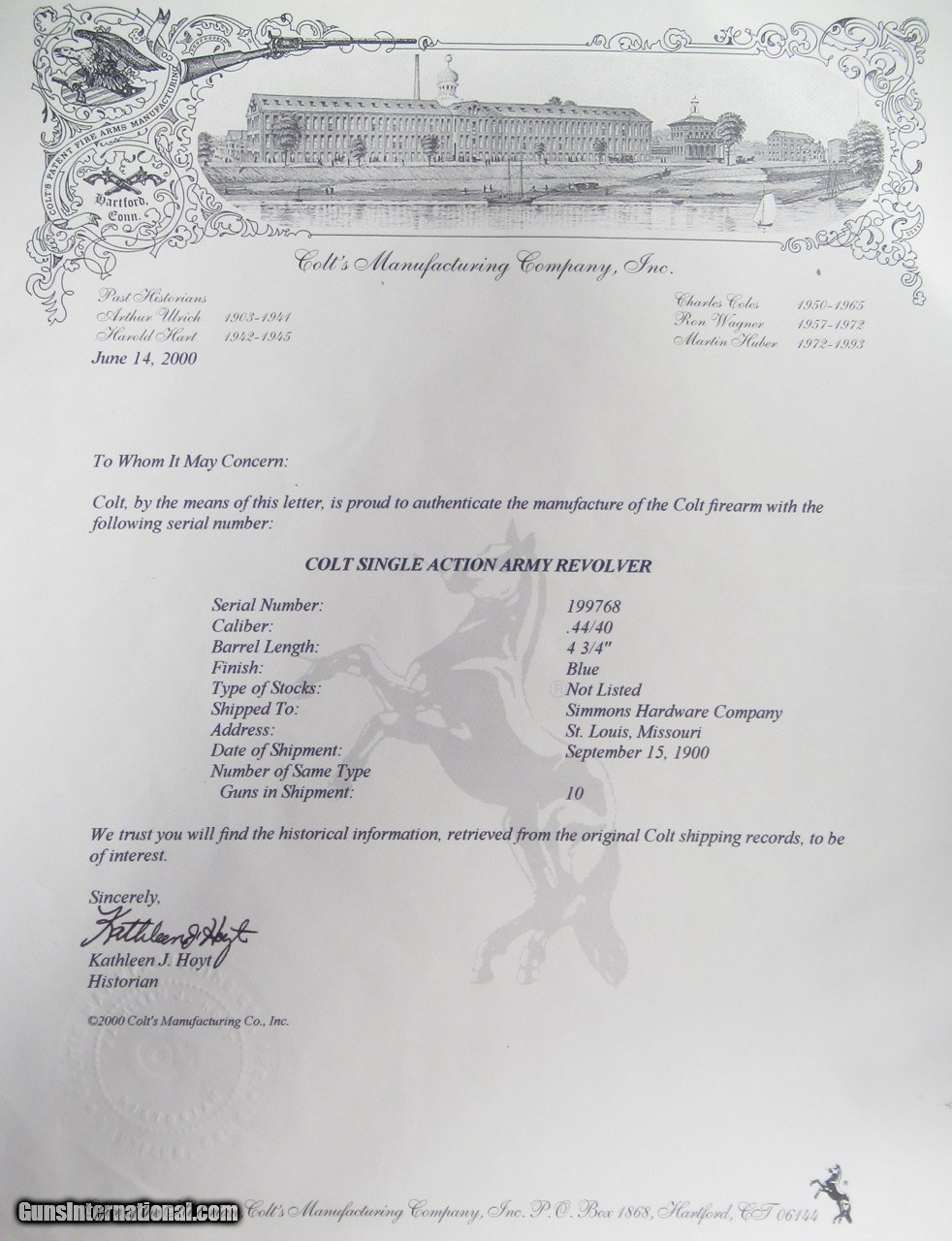 Description: Colt Single Action Army Revolver; Serial No. 199768; Per Included Factory Letter: .44/40 Caliber with 4 ¾” Barrel and Blue Finish; Shipped to Colt’s Largest Distributor Simmons Hardware Company of St. Louis, Missouri on September 15, 1900 as Part of a 10 Gun Shipment; “Colt Frontier Six Shooter” Roll Die Barrel; Simmons Shipped Many Colts to Smaller Dealers; Lots in Southwest; This Fine 122 Year-Old Colt 44/40 Came Out of Waco, Texas; Lots of Original Metal Finish Remains; Correct Original Colt Hard Rubber Grips; Perfect Screws and Full Front Sight; Perfect Strong Action; Very Strong Bore with light even chattering; These Original Not Altered 122 Year-Old Colts are Scarce; See All Photos for Condition; No Texts; Call (254)541-5765 or Email Only; PERSONAL PROPERTY of Harold Wieser; Price: $6,975 + $45 S&H Via USPS PRIORITY MAIL; Payment Address: Harold Wieser - 1466 U.S. Hwy 77 - Rosebud, TX 76570; SEND PAYMENTS VIA USPS PRIORITY MAIL; BEWARE of SCAMS!!! – DO NOT SEND MONEY or CORRESPONDENTS ELECTRONICALLY UNLESS YOU HAVE SPOKEN to HAROLD WIESER FIRST! 254-541-5765 SOLD Manufacturer: Colt Model: 1873 Serial Number: 199768 |