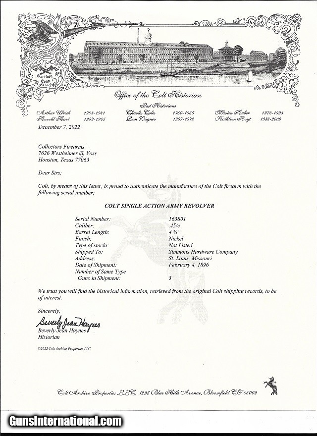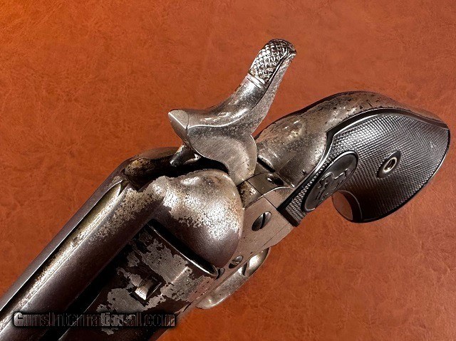 Description: *SOLD* Fine Untouched Model 1873 Colt Single Action Army Revolver, Nickel Plated with Factory Letter, .45 Cal, mfg. 1896 with 4 3/4" bbl. I cannot overstate how original and unmolested this Colt is. It has never been altered in any way and remains totally untouched inside and out. It is also worth noting that this is one of the very last blackpowder frame Single Actions ever made with smokeless frames first appearing over serial number 164000. Overall the pistol retains 70% bright factory original nickel finish turning frosty with fine oxidation crazing scattered throughout. The majority of finish loss is around the cylinder and sides and top of the frame due to heat from firing. These areas have turned a deep plum/chocolate patina and otherwise the gun shows little evidence of having actually been carried. There is essentially no wear on the front sight or trigger, nor typical index finger wear on the triggerguard. The checkered hard rubber grips fit perfect and show only very light wear with no cracks. There is one small surface chip on the right rear lower edge. Matching serial number "163801" is stamped on the frame, triggerguard, and backstrap, and very faintly visible scratched into the backside of the grips. All screws are original and all retain traces of fire bluing. Original hammer, trigger, loading gate, cartridge extractor with brass spring, and perfect full blade front sight. The sight retains all it's original finish with factory milling marks still visible and has never been touched with a file. Sharp original rampant horse logo, patent dates, "45 COLT" marking, and two-line address. The action is smooth and crisp and functions flawlessly. One of the best actions I've felt in a long time - this is how an original Colt should feel! Clearly it's never been fooled with. Lockup is fair with typical slight pay and tight cylinder gap. Bright bore with strong rifling and light to moderate fine blackpowder frosting scattered throughout. Factory letter is included which confirms the gun's configuration and shipment to Simmons Hardware in St. Louis, Missouri, one of Colt's top retailers. When you hold this gun it really feels like a time capsule. Obviously it was fired a bit but I think it spent the majority of it's life sitting in a drawer. A super honest original blackpowder Colt that will make a choice addition to any collection. Jeremiah Johnson Trading sells antique arms manufactured prior to 1899 and muzzleloading blackpowder reproductions only. For the purpose of these conditions the term "antique arms" will also include muzzleloading blackpowder reproductions. Buyers must be 21 years of age or older and have no felony convictions to purchase antique arms. Antique arms do not require Federal licensing and may be shipped directly to the buyer with the following exceptions. No antique arms will be shipped to Washington D. C. or any of the five boroughs of New York City (or residents thereof). Some restrictions may apply to antique firearms shipped to California and will be noted in the item description if applicable. Any antique arm shipped to New Jersey must ship to a licensed FFL holder, no exceptions. Any muzzleloading blackpowder reproduction rifle, shotgun, or handgun shipped to Illinois must ship to an FFL holder. Items containing antique ivory will not be sold or shipped to residents of California, Hawaii, Illinois, Nevada, New Hampshire, New Jersey, New York, Oregon, or Washington. Antique muzzleloaders and antiques which fire obsolete cartridges may be shipped internationally however it is the responsibility of the buyer to know and abide by their local laws and provide proof that the antique arm is legal to receive and own. Payment can be made by money order, banker's check, personal check, credit card (no additional fees), or bank wire. Please allow 7-10 business days for clearance on personal checks. If paying by credit card please call us directly to process your order. Items are professionally packed and shipped USPS Priority Mail with insurance coverage for the sale price and signature required for delivery. Items valued over $5,000.00 are shipped Registered Mail. Buyer pays actual shipping costs with no added charge for packing materials or handling. We describe items accurately and thoroughly. If an item has been misrepresented or significant defect overlooked you may return it for a full refund (minus return shipping costs) within 3 days of having received it. This timeframe begins once the package is delivered by the carrier. Buyer's remorse or concerns over issues noted in the description and/or pictures is not a valid excuse for return. Returned items must be received in the same condition as originally shipped - cleaning, disassembly, alteration, or damage of any kind will void inspection privileges. Occasionally a post-1898 firearm from my personal collection may be sold under this account and any such transaction is a personal sale in no way affiliated with Jeremiah Johnson Trading. Any such arm will be shipped to a licensed FFL or C&R holder in accordance with Federal law. All antique arms are sold as collector's items and are not warranted safe for shooting. Please consult a competent gunsmith prior to shooting any firearm. SOLD Antique: Yes Handgun Caliber: .45 Colt Manufacturer: Colt Model: 1873 Single Action Army Serial Number: 163801 Barrel Length: 4 3/4 Finish: Nickel Manufacture Date: 1896 Extras: Factory Letter |