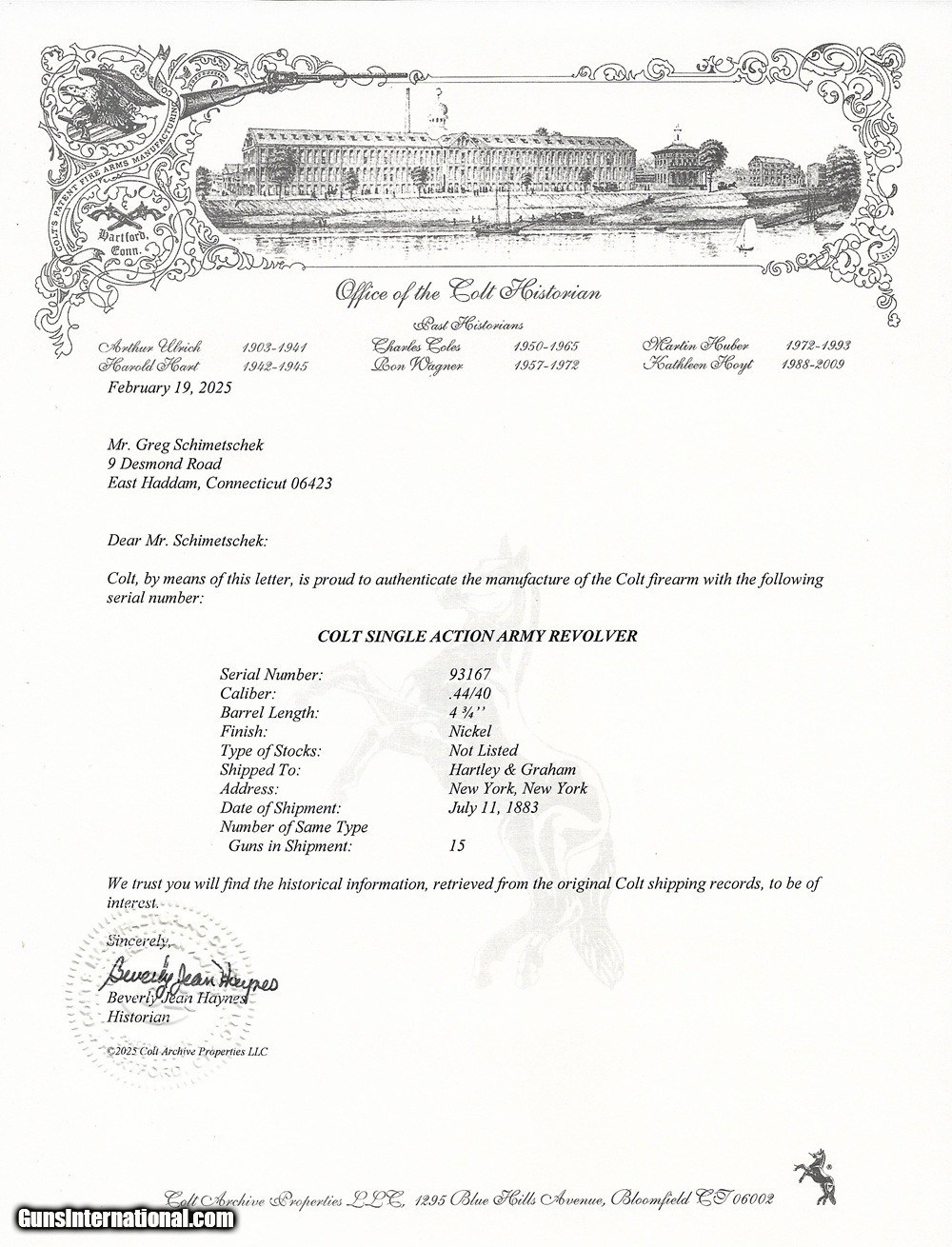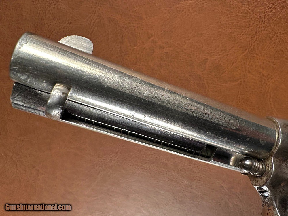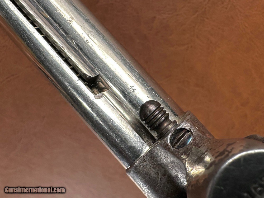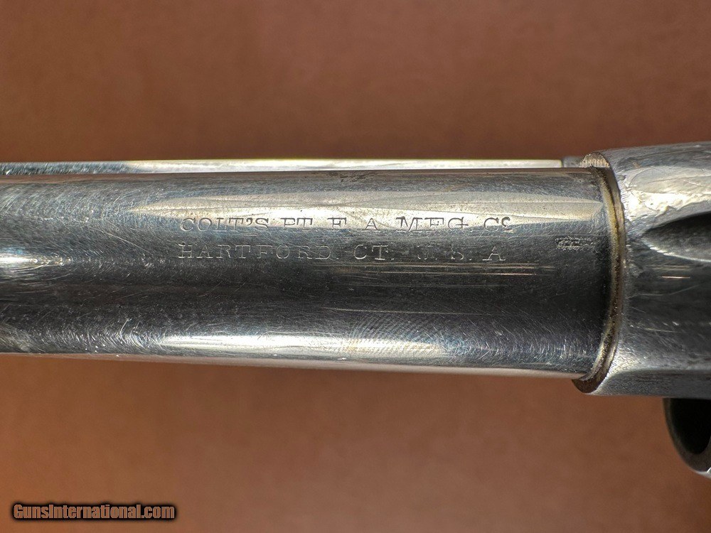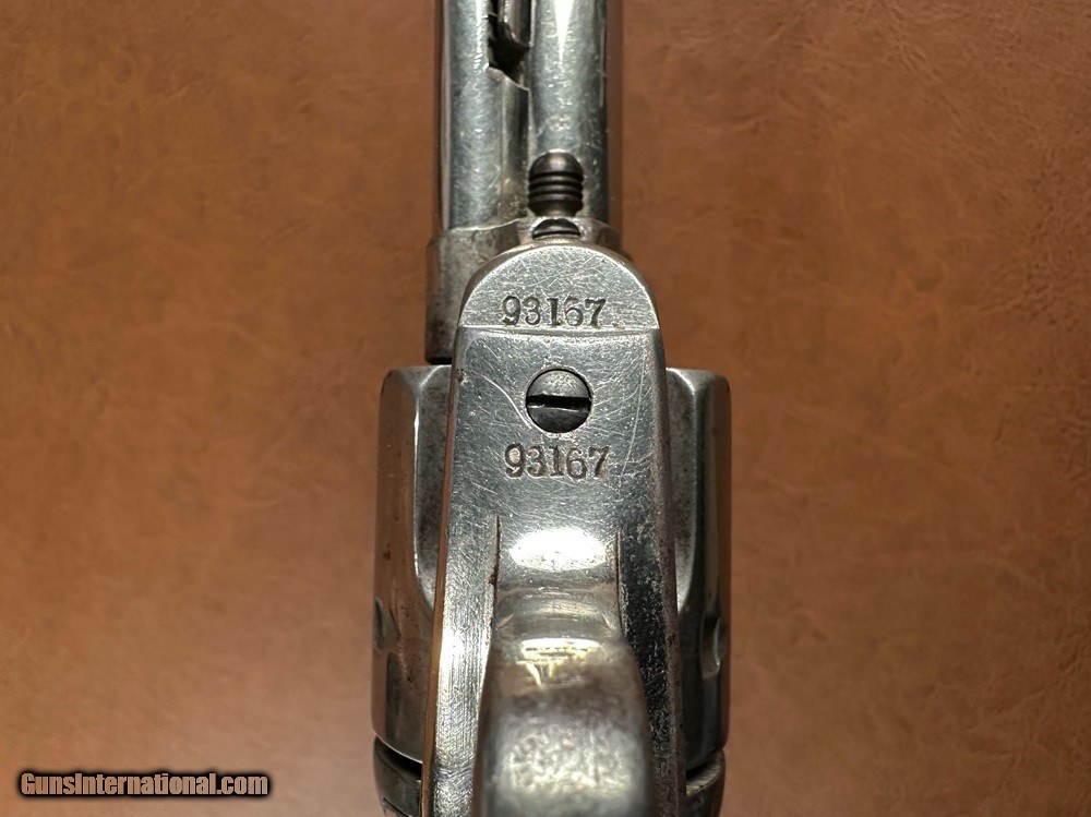 Description: High Condition Model 1873 Colt Single Action Army Frontier Six Shooter Revolver, Nickel Plated with Carved Steer Head Ivory Grips & Factory Letter, .44-40 WCF, mfg. 1883 with 4 ¾" barrel. This is a stunning Wild West era blackpowder frame Colt Single Action in excellent condition. The overwhelming majority of etched panel .44's made during this period had 7 ½" barrels making those with shorter 5 ½" and 4 ¾" lengths quite rare. Overall the pistol retains 80%+ bright factory original nickel finish with notable fire bluing visible on all screws. Colt factory carved steer head ivory grips are from a later vintage dating to about the 1920's but are spectacular in their own right and fit the gun amazingly well. They feature original silver rampant horse medallions and the steer head is fitted with ruby eyes and a gold nose ring. Grips have a wonderful creamy yellow color with attractive natural age checking and no chips or cracks. Clear two-line barrel address, patent dates, “44” barrel marking, “44 CF” marked triggerguard, and fully intact legible “COLT FRONTIER SIX SHOOTER” acid etched panel. Matching original serial number “93167” stamped on frame, triggerguard, and backstrap. Original hammer, trigger, loading gate, ejector assembly with brass spring, full blade front sight, fire blued cylinder pin, and all original fire blued screws. The first safety click sits low but otherwise the action is incredibly strong and crisp and functions flawlessly with four clicks. One of the best actions I've felt in some time. Cylinder locks up like a vault with little to no play. Great bore with clean sharp rifling and only light blackpowder frosting. Included factory letter confirms the gun's original configuration as .44-40, 4 ¾" barrel, nickel finish, grips not listed (standard rubber), shipped to Hartley & Graham, New York, New York, July 11th 1883. Hartley & Graham was one of the premier suppliers of Colts across the country and to the American West in particular through their popular mail order catalog. A very hard gun to find in this condition with an absolutely classic cowboy look! *NOTE* Due to ivory restrictions this pistol will not be sold or shipped to residents of California, Hawaii, Illinois, Nevada, New Hampshire, New Jersey, New York, Oregon, or Washington. No international sales. Jeremiah Johnson Trading sells antique arms manufactured prior to 1899 and muzzleloading blackpowder reproductions only. For the purpose of these conditions the term "antique arms" will also include muzzleloading blackpowder reproductions. Buyers must be 21 years of age or older and have no felony convictions to purchase antique arms. Antique arms do not require Federal licensing and may be shipped directly to the buyer with the following exceptions. No antique arms will be shipped to Washington D. C. or any of the five boroughs of New York City (or residents thereof). Some restrictions may apply to antique firearms shipped to California and will be noted in the item description if applicable. Any antique arm shipped to New Jersey or Ohio must ship to a licensed FFL holder, no exceptions. Any muzzleloading blackpowder reproduction rifle, shotgun, or handgun shipped to Illinois must ship to an FFL holder. Items containing antique ivory will not be sold or shipped to residents of California, Hawaii, Illinois, Nevada, New Hampshire, New Jersey, New York, Oregon, or Washington. Antique muzzleloaders and antiques which fire obsolete cartridges may be shipped internationally however it is the responsibility of the buyer to know and abide by their local laws and provide proof that the antique arm is legal to receive and own. Payment can be made by money order, banker's check, personal check, credit card (no additional fees), or bank wire. Please allow 7-10 business days for clearance on personal checks. If paying by credit card please call us directly to process your order. Items are professionally packed and shipped USPS Priority Mail with insurance coverage for the sale price and signature required for delivery. Items valued over $5,000.00 are shipped Registered Mail. Buyer pays actual shipping costs with no added charge for packing materials or handling. We describe items accurately and thoroughly. If an item has been misrepresented or significant defect overlooked you may return it for a full refund (minus return shipping costs) within 3 days of having received it. This timeframe begins once the package is delivered by the carrier. Buyer's remorse or concerns over issues noted in the description and/or pictures is not a valid excuse for return. Returned items must be received in the same condition as originally shipped - cleaning, disassembly, alteration, or damage of any kind will void inspection privileges. Occasionally a post-1898 firearm from my personal collection may be sold under this account and any such transaction is a personal sale in no way affiliated with Jeremiah Johnson Trading. Any such arm will be shipped to a licensed FFL or C&R holder in accordance with Federal law. All antique arms are sold as collector's items and are not warranted safe for shooting. Please consult a competent gunsmith prior to shooting any firearm. SOLD Antique: Yes Handgun Caliber: .44-40 Winchester (.44 WCF) Manufacturer: Colt Model: Single Action Army Serial Number: 93167 Barrel Length: 4 3/4 Finish: Nickel Manufacture Date: 1883 Extras: Factory Letter |