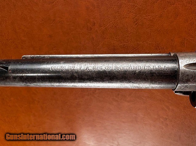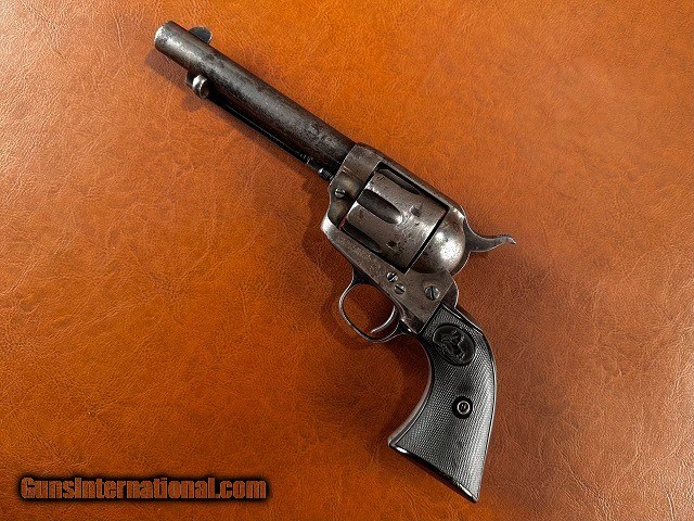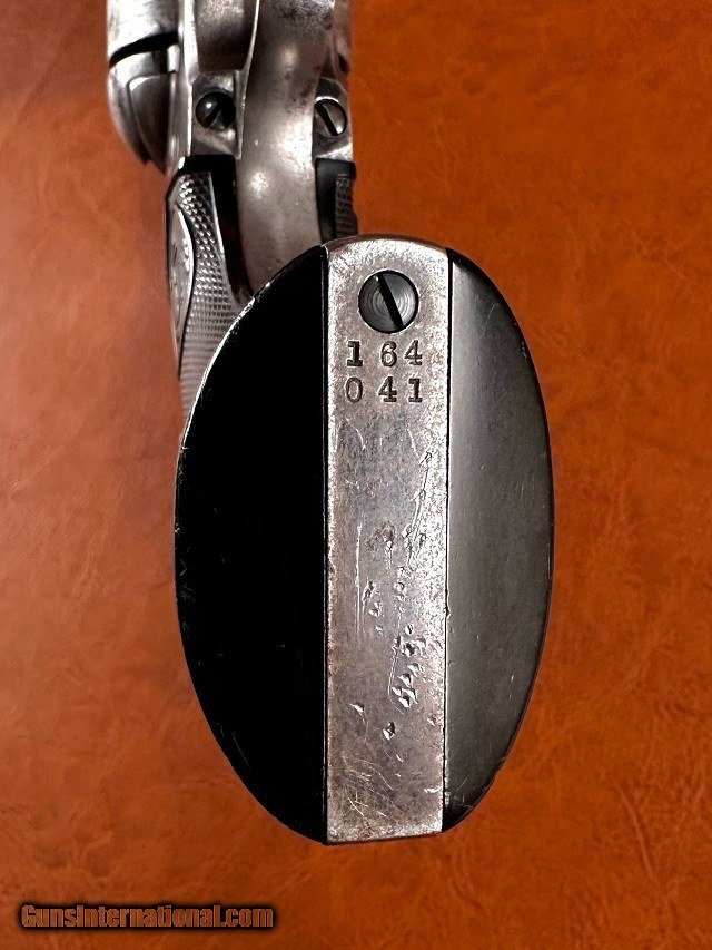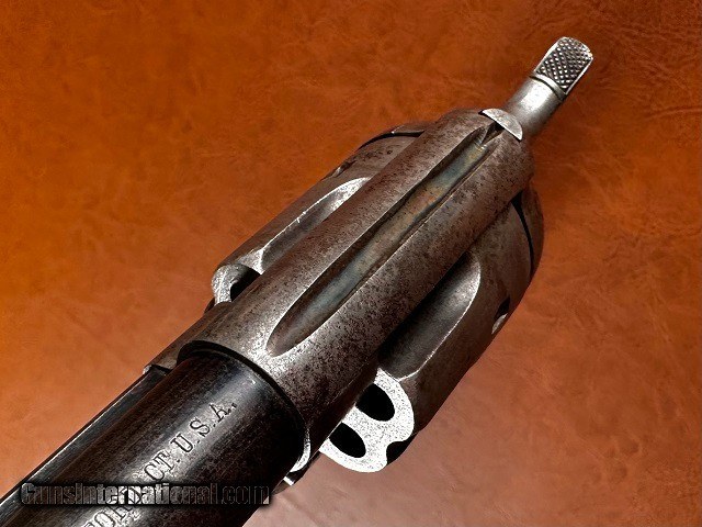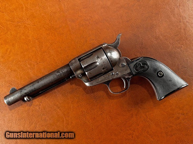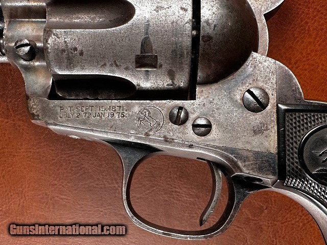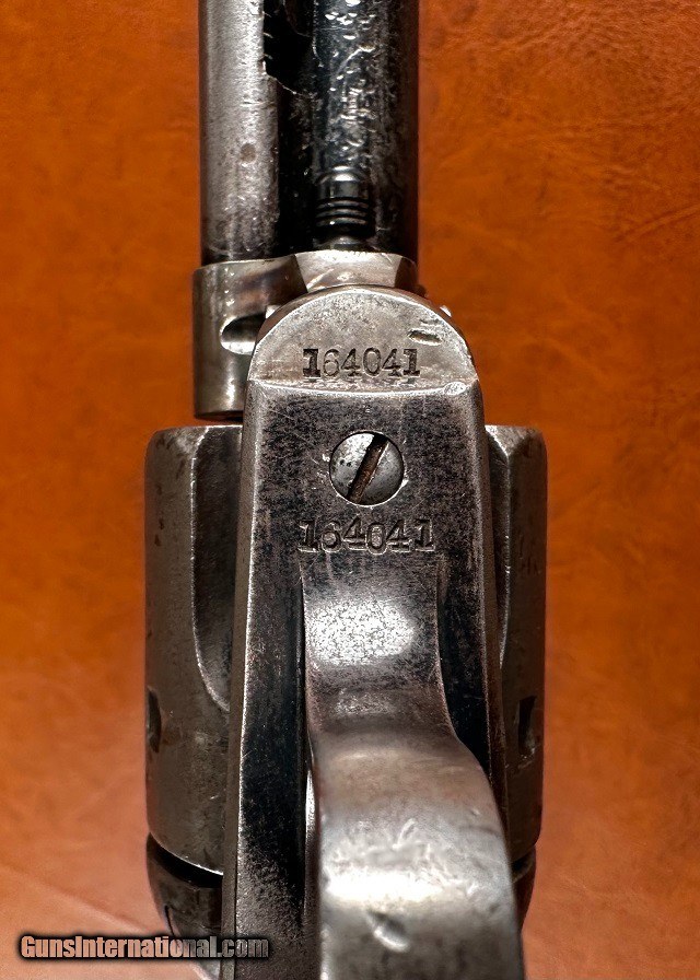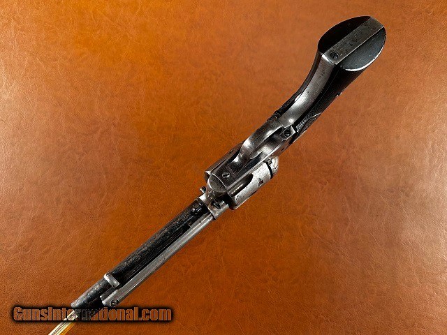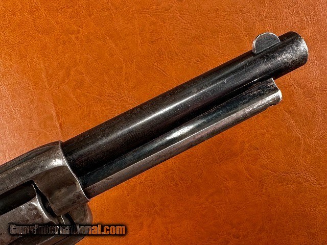 Description: Model 1873 Colt Single Action Army Revolver, .32-20 WCF, mfg. 1896 with 5 1/2" barrel. This is a nice sharp antique Colt with a fair amount of original finish remaining and interestingly it is one of the very first ever manufactured with the "smokeless" style frame. The change from the original "blackpowder" frame to "smokeless" is generally credited to have occurred around serial number 165,000 which would make this gun, number 164041, certainly one of the earliest to have it. It should be noted that Colt Single Actions were not officially proofed for smokeless charges until a couple years later however and while the term "smokeless" is applied to this frame type it is still intended for blackpowder loads. The barrel and ejector housing retain 65-70% bright original bluing while the gripstraps show approximately 40% original finish. The cylinder has some dark bluing remaining within the flutes while the balance has worn to gray with light surface marring scattered around. The frame and hammer have largely toned to a nickel/silver patina with 50% mottled case color swirled throughout, some of which is quite vivid in areas ahead of the cylinder and within the sighting groove. Original checkered hard rubber grips fit perfect showing only very light wear with no chips or cracks. Matching original serial number "164041" stamped on the frame, backstrap, and triggerguard with partial number "41" marked on rear face of cylinder. Sharp original two-line patent marking, rampant horse logo, "32 W.C.F." marked barrel and Colt address. Full original blade front sight with original hammer, trigger, loading gate, and ejector rod assembly with brass spring. All screws are original except for the backstrap butt screw and the cylinder pin may be a replacement. The hammer does not hold the first safety click but otherwise the action is tight and crisp and functions smoothly. The cylinder locks up well with only very slight typical play. Fair bore with good strong rifling and moderate to heavy blackpowder frosting and fine pinprick pitting scattered throughout. Overall a solid antique Single Action! Jeremiah Johnson Trading sells antique arms manufactured prior to 1899 and muzzleloading blackpowder reproductions only. For the purpose of these conditions the term "antique arms" will also include muzzleloading blackpowder reproductions. Buyers must be 21 years of age or older and have no felony convictions to purchase antique arms. Antique arms do not require Federal licensing and may be shipped directly to the buyer with the following exceptions. No antique arms will be shipped to Washington D. C. or any of the five boroughs of New York City (or residents thereof). Some restrictions may apply to antique firearms shipped to California and will be noted in the item description if applicable. Any antique arm shipped to New Jersey must ship to a licensed FFL holder, no exceptions. Any muzzleloading blackpowder reproduction rifle, shotgun, or handgun shipped to Illinois must ship to an FFL holder. Items containing antique ivory will not be sold or shipped to residents of California, Hawaii, Illinois, Nevada, New Hampshire, New Jersey, New York, Oregon, or Washington. Antique muzzleloaders and antiques which fire obsolete cartridges may be shipped internationally however it is the responsibility of the buyer to know and abide by their local laws and provide proof that the antique arm is legal to receive and own. Payment can be made by money order, banker's check, personal check, credit card (no additional fees), or bank wire. Please allow 7-10 business days for clearance on personal checks. If paying by credit card please call us directly to process your order. Items are professionally packed and shipped USPS Priority Mail with insurance coverage for the sale price and signature required for delivery. Items valued over $5,000.00 are shipped Registered Mail. Buyer pays actual shipping costs with no added charge for packing materials or handling. We describe items accurately and thoroughly. If an item has been misrepresented or significant defect overlooked you may return it for a full refund (minus return shipping costs) within 3 days of having received it. This timeframe begins once the package is delivered by the carrier. Buyer's remorse or concerns over issues noted in the description and/or pictures is not a valid excuse for return. Returned items must be received in the same condition as originally shipped - cleaning, disassembly, alteration, or damage of any kind will void inspection privileges. Occasionally a post-1898 firearm from my personal collection may be sold under this account and any such transaction is a personal sale in no way affiliated with Jeremiah Johnson Trading. Any such arm will be shipped to a licensed FFL or C&R holder in accordance with Federal law. All antique arms are sold as collector's items and are not warranted safe for shooting. Please consult a competent gunsmith prior to shooting any firearm. SOLD Antique: Yes Handgun Caliber: .32-20 Winchester (.32 WCF, .32-20 Marlin, .32 Colt Lightning ) Manufacturer: Colt Model: 1873 Single Action Army Serial Number: 164041 Barrel Length: 5 1/2 Manufacture Date: 1896 |