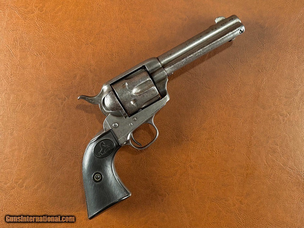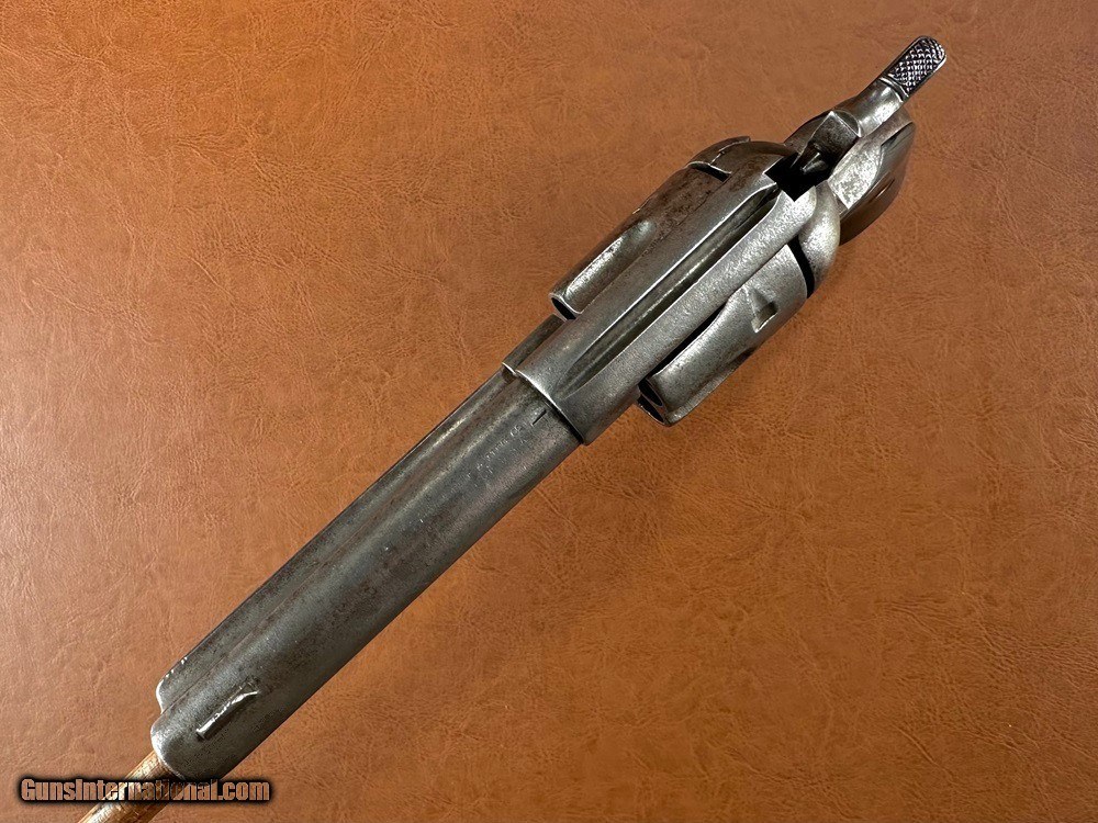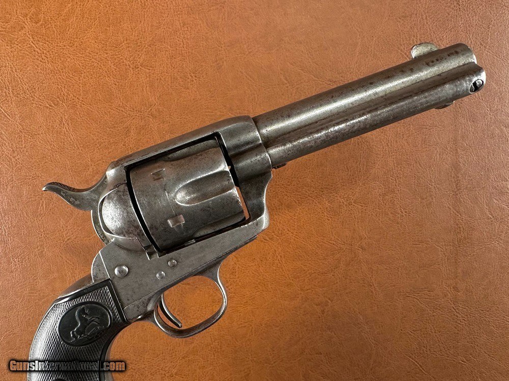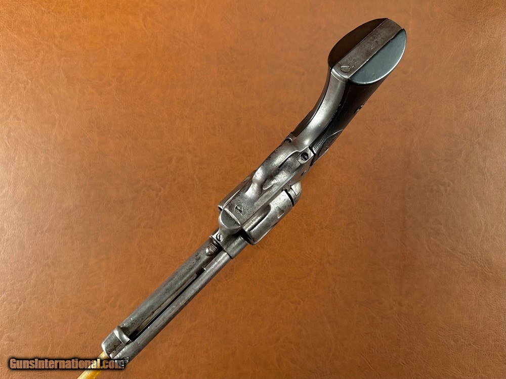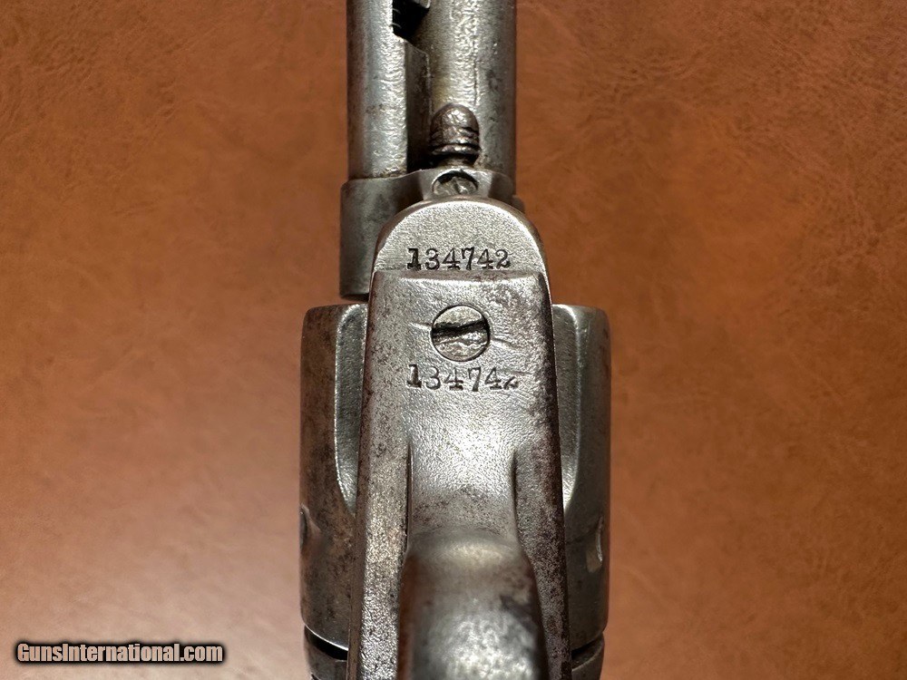 Description: Model 1873 Colt "Frontier Six Shooter" Single Action Army Revolver with Factory Letter, .44-40 WCF, mfg. 1890 with 4 3/4" barrel. This is a good honest cowboy gun in a desirable configuration. The .44-40 cartridge was favored on the Western frontier since it could be used interchangeably between the Colt Single Action Army and the immensely popular Model 1873 and 1892 Winchester rifles. Overall the metal has a worn silvery salt & pepper patina with superfine texturing throughout and heavy holster wear at the muzzle. Checkered hard rubber grips fit very well with moderate wear and no cracks (a few TINY scattered nicks and chips along edges). Clear original serial number "134742" stamped on frame, triggerguard, and backstrap with clear three-line patent marking, "44CAL" stamped triggerguard, and legible two-line barrel address. The first half of the "COLT FRONTIER SIX SHOOTER" marking on the left side of barrel has worn away. There is period stamped rack number "23" on the butt which is likely an indication of police, guard, or law enforcement use at one time. Blackpowder frame with original hammer, trigger, loading gate, blade front sight, cylinder pin, and ejector assembly. A couple small screws may be old replacements but most appear original. The action is very crisp and strong and functions perfectly with five clicks. Cylinder locks up on time with typical light/moderate play. Bore has good rifling worn at muzzle with moderate/heavy fine pinprick pitting throughout. A Colt factory letter is included confirming the gun's original configuration as .44-40, 4 3/4" barrel, blue finish, stocks not listed (standard rubber), shipped to Simmons Hardware Company, St. Louis, Missouri, August 27 1890. Simmons Hardware Company was a premier manufacturer and retailer of hardware including sporting goods and supplied countless firearms to individuals across the nation through their popular catalog. A really cool old Colt! Jeremiah Johnson Trading sells antique arms manufactured prior to 1899 and muzzleloading blackpowder reproductions only. For the purpose of these conditions the term "antique arms" will also include muzzleloading blackpowder reproductions. Buyers must be 21 years of age or older and have no felony convictions to purchase antique arms. Antique arms do not require Federal licensing and may be shipped directly to the buyer with the following exceptions. No antique arms will be shipped to Washington D. C. or any of the five boroughs of New York City (or residents thereof). Some restrictions may apply to antique firearms shipped to California and will be noted in the item description if applicable. Any antique arm shipped to New Jersey or Ohio must ship to a licensed FFL holder, no exceptions. Any muzzleloading blackpowder reproduction rifle, shotgun, or handgun shipped to Illinois must ship to an FFL holder. Items containing antique ivory will not be sold or shipped to residents of California, Hawaii, Illinois, Nevada, New Hampshire, New Jersey, New York, Oregon, or Washington. Antique muzzleloaders and antiques which fire obsolete cartridges may be shipped internationally however it is the responsibility of the buyer to know and abide by their local laws and provide proof that the antique arm is legal to receive and own. Payment can be made by money order, banker's check, personal check, credit card (no additional fees), or bank wire. Please allow 7-10 business days for clearance on personal checks. If paying by credit card please call us directly to process your order. Items are professionally packed and shipped USPS Priority Mail with insurance coverage for the sale price and signature required for delivery. Items valued over $5,000.00 are shipped Registered Mail. Buyer pays actual shipping costs with no added charge for packing materials or handling. We describe items accurately and thoroughly. If an item has been misrepresented or significant defect overlooked you may return it for a full refund (minus return shipping costs) within 3 days of having received it. This timeframe begins once the package is delivered by the carrier. Buyer's remorse or concerns over issues noted in the description and/or pictures is not a valid excuse for return. Returned items must be received in the same condition as originally shipped - cleaning, disassembly, alteration, or damage of any kind will void inspection privileges. Occasionally a post-1898 firearm from my personal collection may be sold under this account and any such transaction is a personal sale in no way affiliated with Jeremiah Johnson Trading. Any such arm will be shipped to a licensed FFL or C&R holder in accordance with Federal law. All antique arms are sold as collector's items and are not warranted safe for shooting. Please consult a competent gunsmith prior to shooting any firearm. SOLD Antique: Yes Handgun Caliber: .44-40 Winchester (.44 WCF) Manufacturer: Colt Model: Single Action Army Serial Number: 134742 Barrel Length: 4 3/4 Manufacture Date: 1890 Extras: Factory Letter |