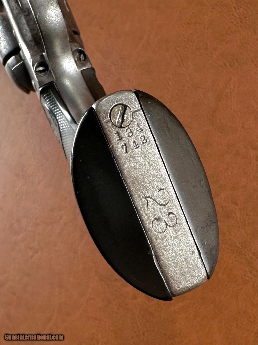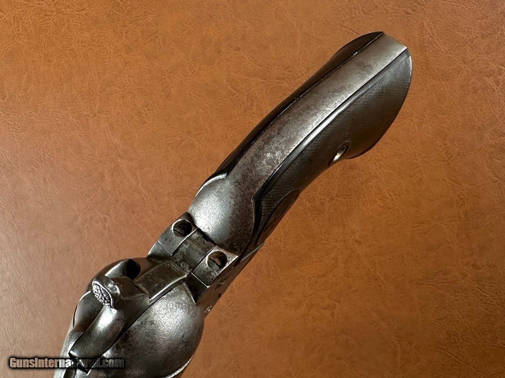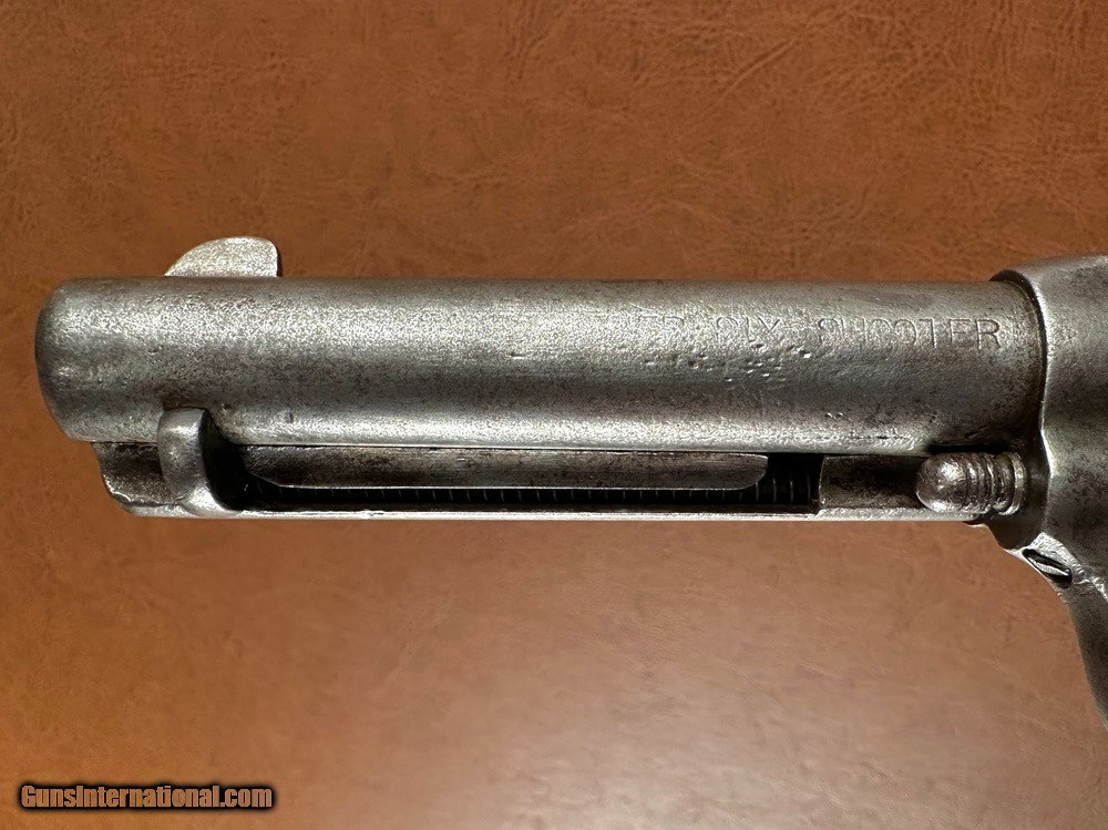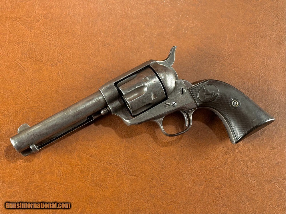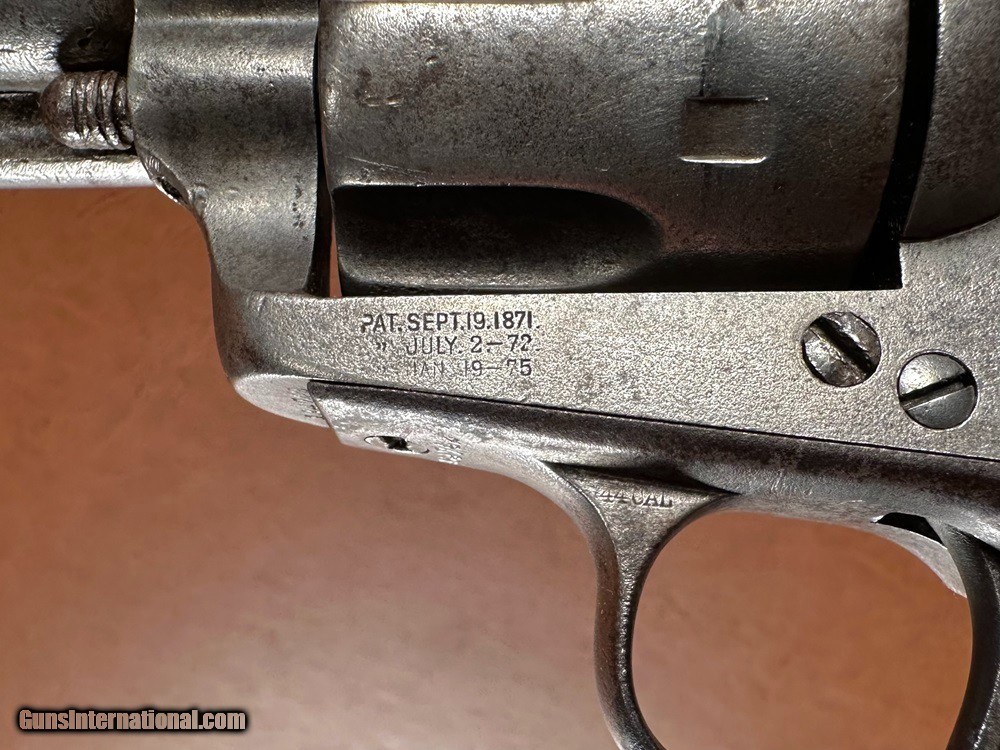 Description: Model 1873 Colt "Frontier Six Shooter" Single Action Army Revolver with Factory Letter, .44-40 WCF, mfg. 1890 with 4 3/4" barrel. This is a good honest cowboy gun in a desirable configuration. The .44-40 cartridge was favored on the Western frontier since it could be used interchangeably between the Colt Single Action Army and the immensely popular Model 1873 and 1892 Winchester rifles. Overall the metal has a worn silvery salt & pepper patina with superfine texturing throughout and heavy holster wear at the muzzle. Checkered hard rubber grips fit very well with moderate wear and no cracks (a few TINY scattered nicks and chips along edges). Clear original serial number "134742" stamped on frame, triggerguard, and backstrap with clear three-line patent marking, "44CAL" stamped triggerguard, and legible two-line barrel address. The first half of the "COLT FRONTIER SIX SHOOTER" marking on the left side of barrel has worn away. There is period stamped rack number "23" on the butt which is likely an indication of police, guard, or law enforcement use at one time. Blackpowder frame with original hammer, trigger, loading gate, blade front sight, cylinder pin, and ejector assembly. A couple small screws may be old replacements but most appear original. The action is very crisp and strong and functions perfectly with five clicks. Cylinder locks up on time with typical light/moderate play. Bore has good rifling worn at muzzle with moderate/heavy fine pinprick pitting throughout. A Colt factory letter is included confirming the gun's original configuration as .44-40, 4 3/4" barrel, blue finish, stocks not listed (standard rubber), shipped to Simmons Hardware Company, St. Louis, Missouri, August 27 1890. Simmons Hardware Company was a premier manufacturer and retailer of hardware including sporting goods and supplied countless firearms to individuals across the nation through their popular catalog. A really cool old Colt! Jeremiah Johnson Trading sells antique arms manufactured prior to 1899 and muzzleloading blackpowder reproductions only. For the purpose of these conditions the term "antique arms" will also include muzzleloading blackpowder reproductions. Buyers must be 21 years of age or older and have no felony convictions to purchase antique arms. Antique arms do not require Federal licensing and may be shipped directly to the buyer with the following exceptions. No antique arms will be shipped to Washington D. C. or any of the five boroughs of New York City (or residents thereof). Some restrictions may apply to antique firearms shipped to California and will be noted in the item description if applicable. Any antique arm shipped to New Jersey or Ohio must ship to a licensed FFL holder, no exceptions. Any muzzleloading blackpowder reproduction rifle, shotgun, or handgun shipped to Illinois must ship to an FFL holder. Items containing antique ivory will not be sold or shipped to residents of California, Hawaii, Illinois, Nevada, New Hampshire, New Jersey, New York, Oregon, or Washington. Antique muzzleloaders and antiques which fire obsolete cartridges may be shipped internationally however it is the responsibility of the buyer to know and abide by their local laws and provide proof that the antique arm is legal to receive and own. Payment can be made by money order, banker's check, personal check, credit card (no additional fees), or bank wire. Please allow 7-10 business days for clearance on personal checks. If paying by credit card please call us directly to process your order. Items are professionally packed and shipped USPS Priority Mail with insurance coverage for the sale price and signature required for delivery. Items valued over $5,000.00 are shipped Registered Mail. Buyer pays actual shipping costs with no added charge for packing materials or handling. We describe items accurately and thoroughly. If an item has been misrepresented or significant defect overlooked you may return it for a full refund (minus return shipping costs) within 3 days of having received it. This timeframe begins once the package is delivered by the carrier. Buyer's remorse or concerns over issues noted in the description and/or pictures is not a valid excuse for return. Returned items must be received in the same condition as originally shipped - cleaning, disassembly, alteration, or damage of any kind will void inspection privileges. Occasionally a post-1898 firearm from my personal collection may be sold under this account and any such transaction is a personal sale in no way affiliated with Jeremiah Johnson Trading. Any such arm will be shipped to a licensed FFL or C&R holder in accordance with Federal law. All antique arms are sold as collector's items and are not warranted safe for shooting. Please consult a competent gunsmith prior to shooting any firearm. SOLD Antique: Yes Handgun Caliber: .44-40 Winchester (.44 WCF) Manufacturer: Colt Model: Single Action Army Serial Number: 134742 Barrel Length: 4 3/4 Manufacture Date: 1890 Extras: Factory Letter |