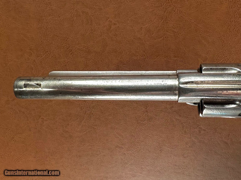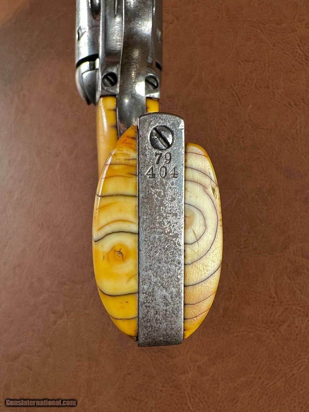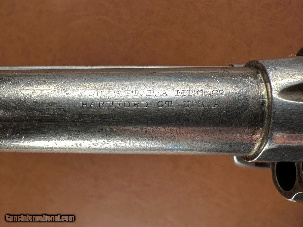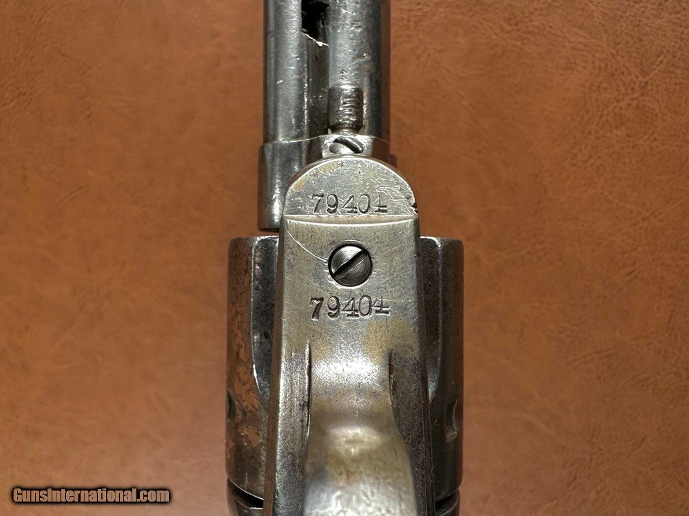 Description: Very Rare Documented Factory Error Two-Line Address Etched Panel 5 ½" Model 1873 Colt Frontier Six-Shooter Single Action Army Revolver, Nickel Plated with Ivory Grips, .44-40 WCF, mfg. 1882. This is a really special Colt in an extremely unusual configuration. First off any etched panel Frontier Six Shooter with a 5 ½" barrel is rare. They simply did not make many 5 ½" guns during the period in which the acid etched Colt Frontier Six Shooter logo was in use. Throughout the Colt Single Action Army's manufacture from 1873-1940 standard 5 ½" and 7 ½" barrels received the long single-line Colt address while the 4 ¾" barrels were stamped with the smaller two-line address however there were a couple very small windows of time during production, likely only days or even hours, where these were mixed up due to human error. This error is noted in Keith Cochran's “Colt Peacemaker Encyclopedia Volume 1” page 144 & 145 (see last photos). In all our years of collecting Colts this is probably only the second or third example we have ever seen and those were 7 ½" guns. The included factory letter confirms the gun's original configuration as .44-40 caliber, 5 ½" barrel, nickel plated, stocks not listed, shipped to Hartley & Graham, New York, New York, on June 7th, 1882. Hartley & Graham was one of the premier firearms retailers in the country and sold countless guns to dealers and individuals across the nation through their popular catalogs. The ivory grips would have been fitted by them in New York prior to resale. Overall the gun retains approximately 35-40% bright original nickel finish with the balance worn and well blended to a smooth silver patina. Original retailer installed ivory grips have a fantastic swirled yellow/brown color with natural grain checking and a thin worn over 1" long chip at the left lower front corner. They have a great look and feel and fit perfectly flush on the butt with shrinkage and undersized wear along the gripstraps. Clear two-line address, patent dates, “44" marked barrel, “44 CF” marked triggerguard, and matching serial number “79404” stamped on the frame, triggerguard, and backstrap. The acid etched Colt Frontier Six Shooter marking is worn and they usually are with only “COLT FRONTIER..” and some of the boarder visible. Original blade front sight, bullseye ejector with brass spring, loading gate, trigger, cylinder pin, and screws excepting for one triggerguard screw which may be a replacement. The long-knurled hammer is of the correct vintage but appears to have been case colored as opposed to nickeled or fire blued so it may or may not be original to this gun. The first safety position is absent but otherwise the action functions crisp and smooth with four clicks and a little extra hammer travel at full cock. Cylinder locks up perfectly on time with little to no play. Nice bore for a Colt of this age showing very sharp and relatively bright rifling front to back with light/moderate blackpowder frosting and superfine pinprick pitting scattered throughout. A super rare Colt Single Action that would be a fascinating addition to even the most advanced collection. I highly doubt you will ever see another. *NOTE* Due to ivory restrictions this pistol will not be sold or shipped to residents of California, Hawaii, Illinois, Nevada, New Hampshire, New Jersey, New York, Oregon, or Washington. No international sales. Jeremiah Johnson Trading sells antique arms manufactured prior to 1899 and muzzleloading blackpowder reproductions only. For the purpose of these conditions the term "antique arms" will also include muzzleloading blackpowder reproductions. Buyers must be 21 years of age or older and have no felony convictions to purchase antique arms. Antique arms do not require Federal licensing and may be shipped directly to the buyer with the following exceptions. No antique arms will be shipped to Washington D. C. or any of the five boroughs of New York City (or residents thereof). Some restrictions may apply to antique firearms shipped to California and will be noted in the item description if applicable. Any antique arm shipped to New Jersey or Ohio must ship to a licensed FFL holder, no exceptions. Any muzzleloading blackpowder reproduction rifle, shotgun, or handgun shipped to Illinois must ship to an FFL holder. Items containing antique ivory will not be sold or shipped to residents of California, Hawaii, Illinois, Nevada, New Hampshire, New Jersey, New York, Oregon, or Washington. Antique muzzleloaders and antiques which fire obsolete cartridges may be shipped internationally however it is the responsibility of the buyer to know and abide by their local laws and provide proof that the antique arm is legal to receive and own. Payment can be made by money order, banker's check, personal check, credit card (no additional fees), or bank wire. Please allow 7-10 business days for clearance on personal checks. If paying by credit card please call us directly to process your order. Items are professionally packed and shipped USPS Priority Mail with insurance coverage for the sale price and signature required for delivery. Items valued over $5,000.00 are shipped Registered Mail. Buyer pays actual shipping costs with no added charge for packing materials or handling. We describe items accurately and thoroughly. If an item has been misrepresented or significant defect overlooked you may return it for a full refund (minus return shipping costs) within 3 days of having received it. This timeframe begins once the package is delivered by the carrier. Buyer's remorse or concerns over issues noted in the description and/or pictures is not a valid excuse for return. Returned items must be received in the same condition as originally shipped - cleaning, disassembly, alteration, or damage of any kind will void inspection privileges. Occasionally a post-1898 firearm from my personal collection may be sold under this account and any such transaction is