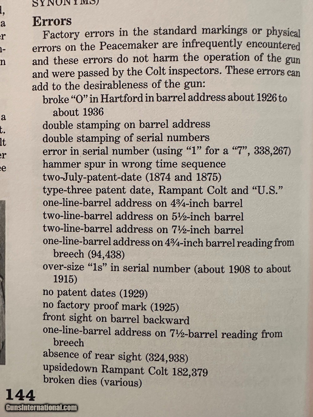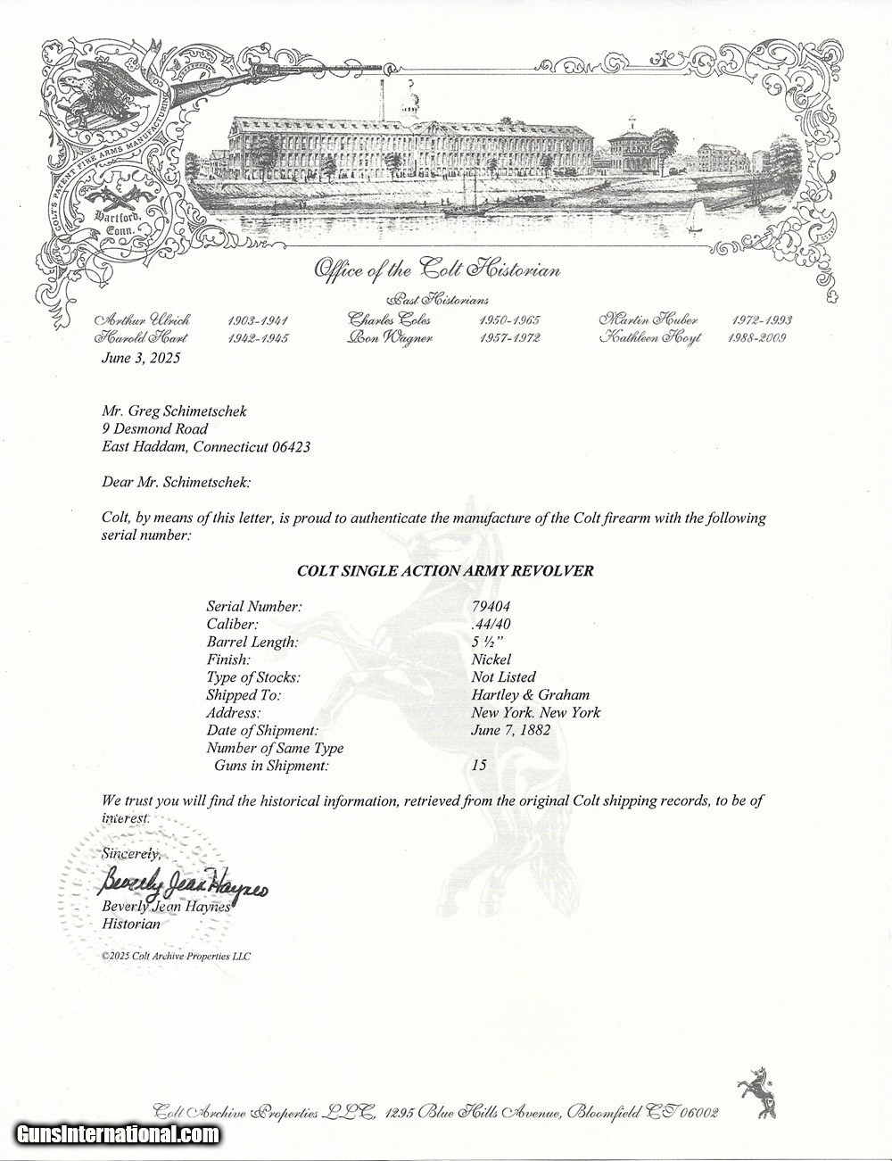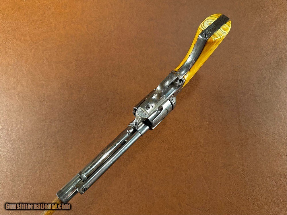 Description: Very Rare Documented Factory Error Two-Line Address Etched Panel 5 ½" Model 1873 Colt Frontier Six-Shooter Single Action Army Revolver, Nickel Plated with Ivory Grips, .44-40 WCF, mfg. 1882. This is a really special Colt in an extremely unusual configuration. First off any etched panel Frontier Six Shooter with a 5 ½" barrel is rare. They simply did not make many 5 ½" guns during the period in which the acid etched Colt Frontier Six Shooter logo was in use. Throughout the Colt Single Action Army's manufacture from 1873-1940 standard 5 ½" and 7 ½" barrels received the long single-line Colt address while the 4 ¾" barrels were stamped with the smaller two-line address however there were a couple very small windows of time during production, likely only days or even hours, where these were mixed up due to human error. This error is noted in Keith Cochran's “Colt Peacemaker Encyclopedia Volume 1” page 144 & 145 (see last photos). In all our years of collecting Colts this is probably only the second or third example we have ever seen and those were 7 ½" guns. The included factory letter confirms the gun's original configuration as .44-40 caliber, 5 ½" barrel, nickel plated, stocks not listed, shipped to Hartley & Graham, New York, New York, on June 7th, 1882. Hartley & Graham was one of the premier firearms retailers in the country and sold countless guns to dealers and individuals across the nation through their popular catalogs. The ivory grips would have been fitted by them in New York prior to resale. Overall the gun retains approximately 35-40% bright original nickel finish with the balance worn and well blended to a smooth silver patina. Original retailer installed ivory grips have a fantastic swirled yellow/brown color with natural grain checking and a thin worn over 1" long chip at the left lower front corner. They have a great look and feel and fit perfectly flush on the butt with shrinkage and undersized wear along the gripstraps. Clear two-line address, patent dates, “44" marked barrel, “44 CF” marked triggerguard, and matching serial number “79404” stamped on the frame, triggerguard, and backstrap. The acid etched Colt Frontier Six Shooter marking is worn and they usually are with only “COLT FRONTIER..” and some of the boarder visible. Original blade front sight, bullseye ejector with brass spring, loading gate, trigger, cylinder pin, and screws excepting for one triggerguard screw which may be a replacement. The long-knurled hammer is of the correct vintage but appears to have been case colored as opposed to nickeled or fire blued so it may or may not be original to this gun. The first safety position is absent but otherwise the action functions crisp and smooth with four clicks and a little extra hammer travel at full cock. Cylinder locks up perfectly on time with little to no play. Nice bore for a Colt of this age showing very sharp and relatively bright rifling front to back with light/moderate blackpowder frosting and superfine pinprick pitting scattered throughout. A super rare Colt Single Action that would be a fascinating addition to even the most advanced collection. I highly doubt you will ever see another. *NOTE* Due to ivory restrictions this pistol will not be sold or shipped to residents of California, Hawaii, Illinois, Nevada, New Hampshire, New Jersey, New York, Oregon, or Washington. No international sales. Jeremiah Johnson Trading sells antique arms manufactured prior to 1899 and muzzleloading blackpowder reproductions only. For the purpose of these conditions the term "antique arms" will also include muzzleloading blackpowder reproductions. Buyers must be 21 years of age or older and have no felony convictions to purchase antique arms. Antique arms do not require Federal licensing and may be shipped directly to the buyer with the following exceptions. No antique arms will be shipped to Washington D. C. or any of the five boroughs of New York City (or residents thereof). Some restrictions may apply to antique firearms shipped to California and will be noted in the item description if applicable. Any antique arm shipped to New Jersey or Ohio must ship to a licensed FFL holder, no exceptions. Any muzzleloading blackpowder reproduction rifle, shotgun, or handgun shipped to Illinois must ship to an FFL holder. Items containing antique ivory will not be sold or shipped to residents of California, Hawaii, Illinois, Nevada, New Hampshire, New Jersey, New York, Oregon, or Washington. Antique muzzleloaders and antiques which fire obsolete cartridges may be shipped internationally however it is the responsibility of the buyer to know and abide by their local laws and provide proof that the antique arm is legal to receive and own. Payment can be made by money order, banker's check, personal check, credit card (no additional fees), or bank wire. Please allow 7-10 business days for clearance on personal checks. If paying by credit card please call us directly to process your order. Items are professionally packed and shipped USPS Priority Mail with insurance coverage for the sale price and signature required for delivery. Items valued over $5,000.00 are shipped Registered Mail. Buyer pays actual shipping costs with no added charge for packing materials or handling. We describe items accurately and thoroughly. If an item has been misrepresented or significant defect overlooked you may return it for a full refund (minus return shipping costs) within 3 days of having received it. This timeframe begins once the package is delivered by the carrier. Buyer's remorse or concerns over issues noted in the description and/or pictures is not a valid excuse for return. Returned items must be received in the same condition as originally shipped - cleaning, disassembly, alteration, or damage of any kind will void inspection privileges. Occasionally a post-1898 firearm from my personal collection may be sold under this account and any such transaction is
