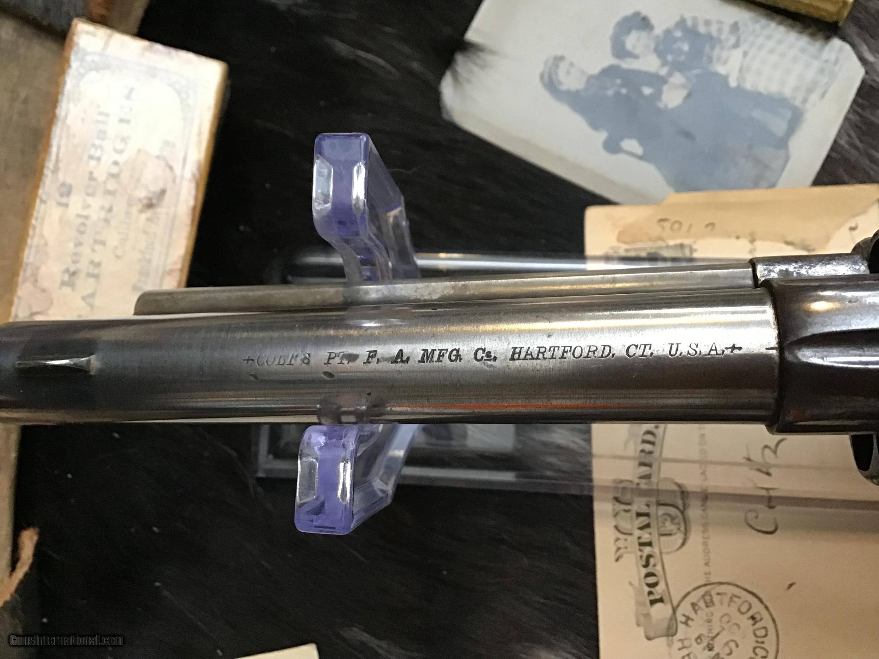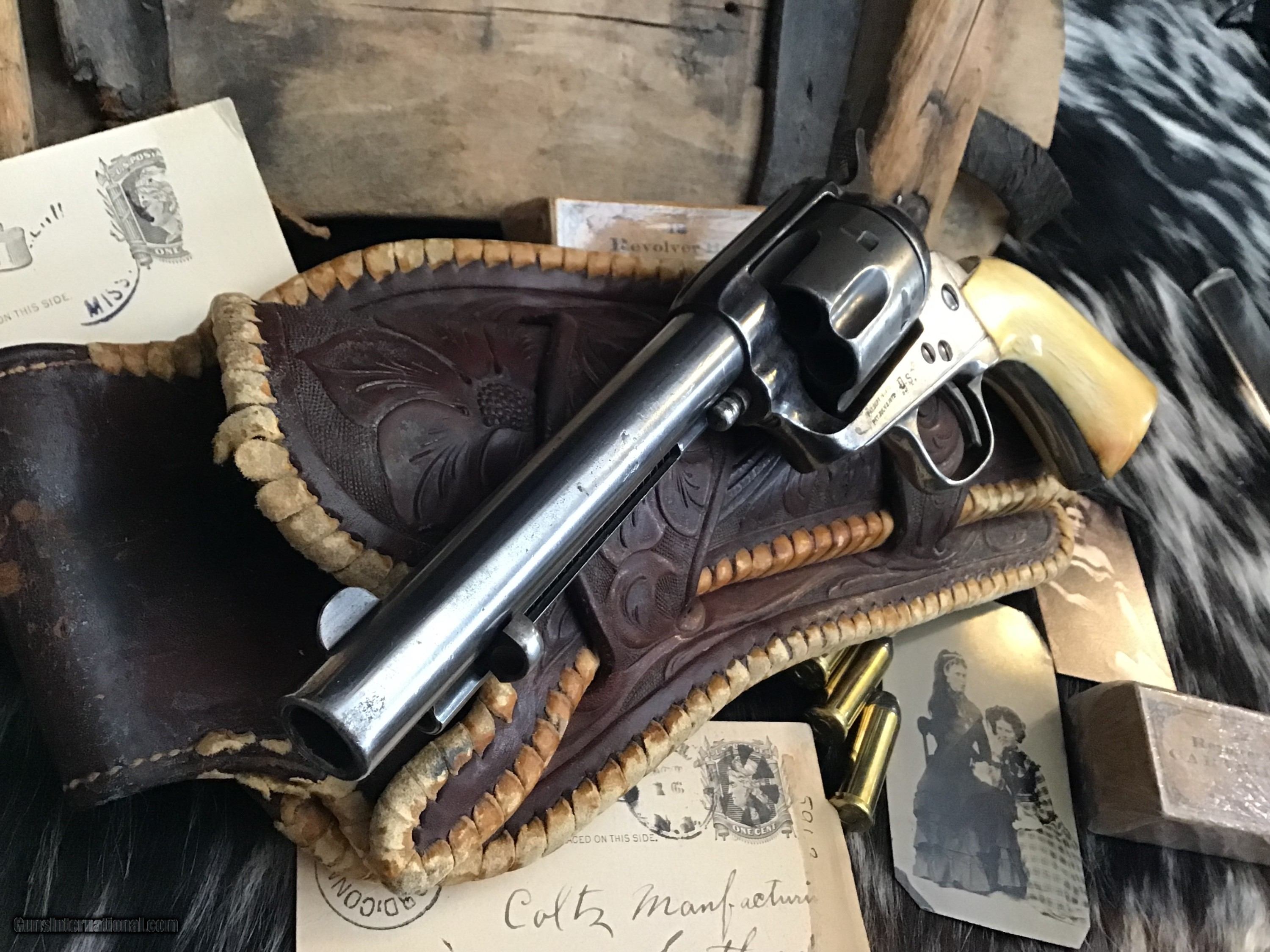 Description: 1874 Mfg. Colt SAA Artillary model wearing a 5.5 inch barrel and chambered in .45 Colt. U.S. marked frame . Gun is from first U.S. Army order of 5000 Colt SAA revolvers for U.S. troops to be used in the Indian Wars in the American West. Numbers are typical mismatched as found on Artillary Colts rearmored in the 1890s. Faint HN inspector marks on gun from US Army inspector. Antique Elephant Ivory grips. Action is smooth and tight and cycles as intended. A great piece of shooting history from our U.S. West. Ten Below Firearms is a Veteran owned and operated business. We specialize in out of production models of high quality firearms. We love to ship! We ship to all states where legal, just give us a call! Handguns normally ship for $35 and Long guns for $50 and up for extra length long guns. That's 2-3 day USPS Priority shipping, Delivery conformation and with tracking number. Optional Postal insurance is additional $1.85 per $100 and highly recommended. We are OPEN BY APPOINTMENT ONLY FOR IN PERSON VISITS, We trade, sometimes. All payments sent via USPS Priority mail must be received within FIVE DAYS of date of purchase or item will be relisted for sale. **PROPS MAY BE USED FOR PHOTOS, PROPS ARE NOT INCLUDED WITH THE SALE OF THIS FIREARM** Thank you! Layaway:If needed we offer a 60 day layaway program. We offer FREE 60-day layaway. Buyer must pay at least 1/3 down and the remaining balance in 60 days. On all uncompleted layaways, all payments made will be non-refundable. The 60 days begins the day the buyer commits to buying the gun. 90 day layaway is available with 1/2 down, via phone. All layaway sales are final. Layaway is not available on negotiated prices. SOLD Antique: Yes Handgun Caliber: .45 Colt Manufacturer: Colt Model: SAA Artillary Serial Number: 4887 Barrel Length: 5.5 inch Condition: Very Good Metal Condition: Very Good Bore Condition: Good Barrel Type: Round Action: SA Triggers: SAA Finish: Patina Sights: Fixed Manufacture Date: 1874 Item Location: Mn |