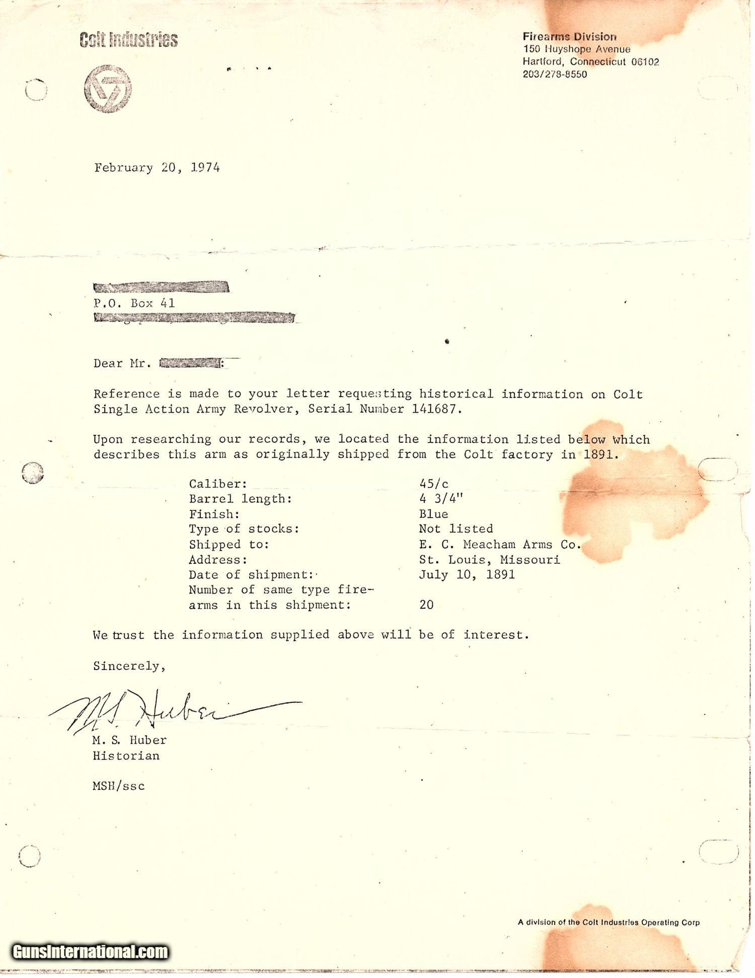 Description: 1891 MISSOURI PACIFIC RAILROAD Antique COLT SAA Revolver Single Action Army LETTERED Black Powder Frame Single Action Army! Here we present an antique Colt Black Powder Frame Single Action Army Revolver, manufactured in 1891 in Hartford, Connecticut. The Colt “Peacemaker” was introduced in 1873 and has become one of the most iconic firearms in all of history, thanks to its widespread use by the U.S. military, civilians and, more recently, in Western films. This example was shipped to E.C. Meacham Arms Co. of Saint Louis, Missouri in 1891 and subsequently sold to the Missouri Pacific Railroad Company whose headquarters were located in downtown Saint Louis. This particular Single Action Army has quite the history to go along with it. “Railroad Bulls”, a term for railroad police, was popularized by hobos and ne’er do wells riding the rails from the time of their inception. The Bulls threw off freeloaders but also protected against robberies and other such attacks. The original railroad bulls were private detectives hired typically from the agency of Allan Pinkerton. In the years before the turn of the 20th Century, most railroads took the logical step and formed their own private police agencies rather than hiring the Pinkertons for their heavy lifting. In 1878, the Santa Fe Railroad formed its own police force with 100 hired guns headed by a local town marshal who became the railroad’s first chief of police. That lawman was Bat Masterson! By the 1940s, the railway police across the country numbered more than 7,000 officers protecting over 240,000 miles of tracks. During both World Wars, railway police guarded bridges and tunnels from saboteurs. The “Bulls” were also pressed into service helping the Army look after the transport of more than 425,000 German and Italian prisoners of war that were transported to 511 camps around the country by rail during WWII. Railroad & express company owned weapons were usually marked either on the stock or the frame. This one is marked “MO. PAC RY.” on the bottom of the grip frame. The Colt Industries archive letter from 1974 confirms the configuration as you see it: .45 Colt, 4 ¾ inch barrel, blued. It was sent to E.C. Meacham Arms Co. in St. Louis, Missouri on July 10, 1891, in a shipment of 20 total revolvers. There is also a polite letter from the Union Pacific Railroad stating that they do not have any further information on this piece or the company where it was acquired. However, E.C. Meacham (c1871-1900) was a very well-known dealer, importer, and wholesaler of firearms located in St. Louis, Missouri: the “Gateway to the West”. They are also remembered for their centerfire conversions of surplus Sharps carbines into serviceable modern rifles for the West. Their shop address (306 & 308 North 4th Street) was only a few blocks from the Missouri Pacific Railway’s office address (210 North 13th Street). The overall condition is very good. Original blue finish and patina. Excellent, strong, crisp action with four definitive hammer clicks. Good, firm rampant colt trademarked grips of hard rubber. Numbers match. Bright bore with very nice rifling. This is a rare opportunity to own a piece of Missouri Pacific Railroad & Colt history! Own the original! This is a legitimate antique and not a reproduction. Barrel is 4-3/4 inches. Caliber: .45 Long Colt Overall condition as seen in photos. Very Fast. Very Safe. FREE SHIPPING WORLDWIDE. Delivered directly to your door by express mail! Guaranteed AUTHENTIC & Includes CERTIFICATE OF AUTHENTICITY. ancestryguns $7325 #210864 SOLD Antique: Yes |