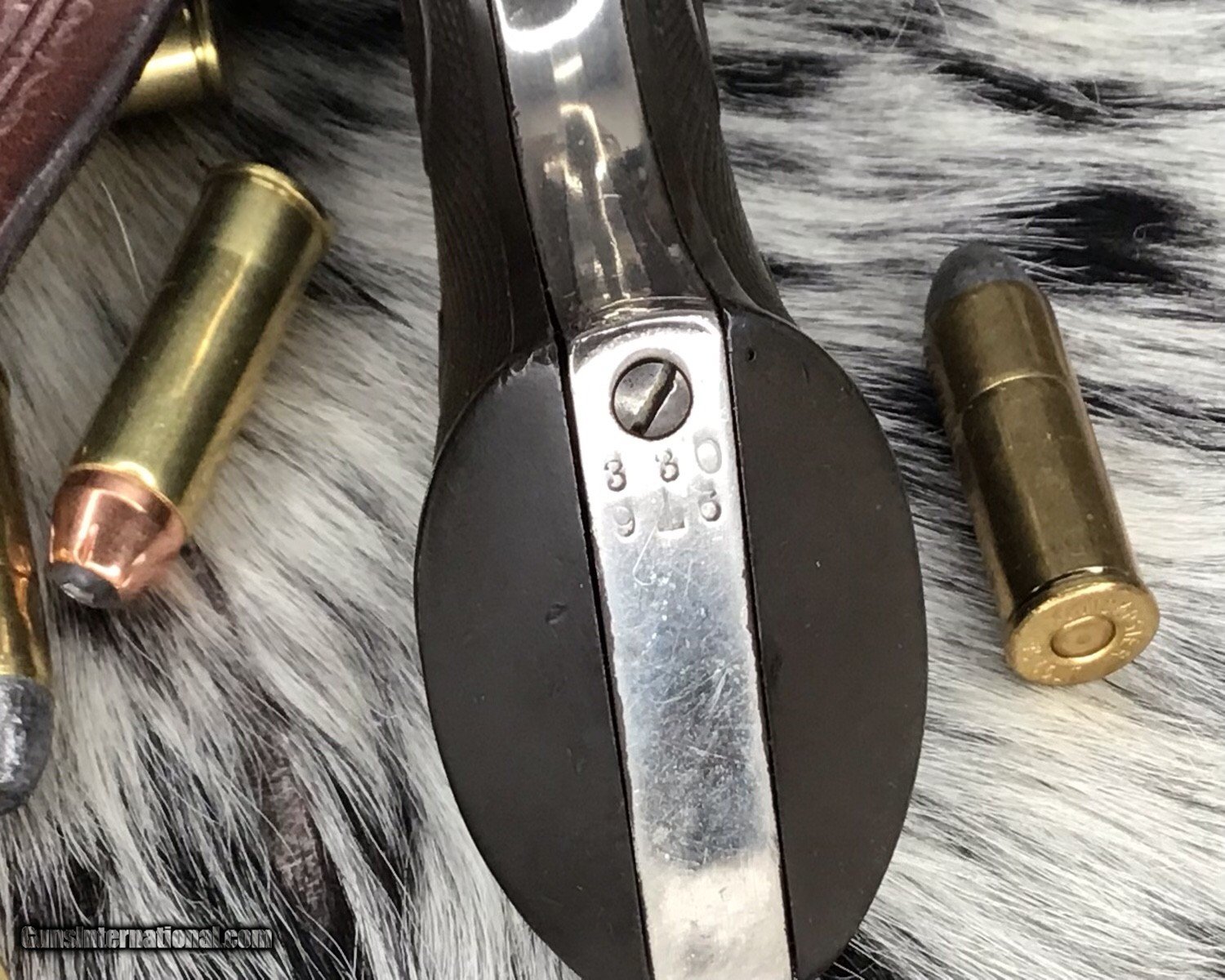 Description: Single Action Army manufactured by Colt in 1915. Metal components have been renickeled. Features include a 4 - 3/4" barrel, blade front sight, notched rear sight, long flute cylinder, and 2-piece Colt plastic grips. Barrel markings have been obliterated, with frame markings being partially legible. Frame, trigger guard, and backstrap are matching. Rear of frame and loading gate assembly numbers are matching. Included with this example is a factory letter stating the this revolver was originally shipped to Krakauer, Zork & Moyes Hardware, Ranch, Mine & Mill Supplies. Afterwards, this revolver was shipped to Shelton Payne Arms Co. in a shipment of Colt Single Action Army revolvers with long flute cylinders. Paperwork included is a letter from Krakauer detailing the shipment to Shelton Payne Arms Co., a factory letter, a photo of the Krakauer company records showing this gun by serial number, a scan of the Krakauer building, as well as a scanned short history of the Krakauer and Shelton companies' history. CONDITION: Metal components retain the majority of their reapplied nickel finish, showing some areas of wear and some superficial handling marks. Bore is bright and retains good rifling throughout. Grips show some smoothing and scattered handling marks, but are otherwise fine. Long Flute SAA we're only built for a short 1400 gun run in 1914-15. Colt was using up a supply of extra double action cylinders in stock and had two engineers do the mechanicals to make it happen. Highly collectible rare variation of the Colt SAA revolver. Add 3% if paying with credit card. God Bless America from a proud American, and a Viet Nam Vet , thankful for our freedoms.. paid for by the Blood ,Sweat and Tears of our brave men and women in uniform. Ten Below Firearms is a Veteran owned and operated business. We specialize in out of production models of high quality firearms. We love to ship! If you are out of state or can't make it to our store, just give us a call! Handguns normally ship for $30 and Long guns for $40 to $55 for extra length long guns. That's 2-3 day USPS Priority shipping, Delivery conformation and with tracking number. Optional Postal insurance is additional $1.50 per $100 and highly recommended. We are OPEN BY APPOINTMENT ONLY FOR IN PERSON VISITS. SOLD Curio/Relic: Yes Handgun Caliber: .45 Colt Manufacturer: Colt Model: SAA Long Flute Serial Number: 330916 Barrel Length: 4.75 inch Condition: Very good Metal Condition: Very good Bore Condition: Very good Action: Single action Finish: Nickel Manufacture Date: 1915 |