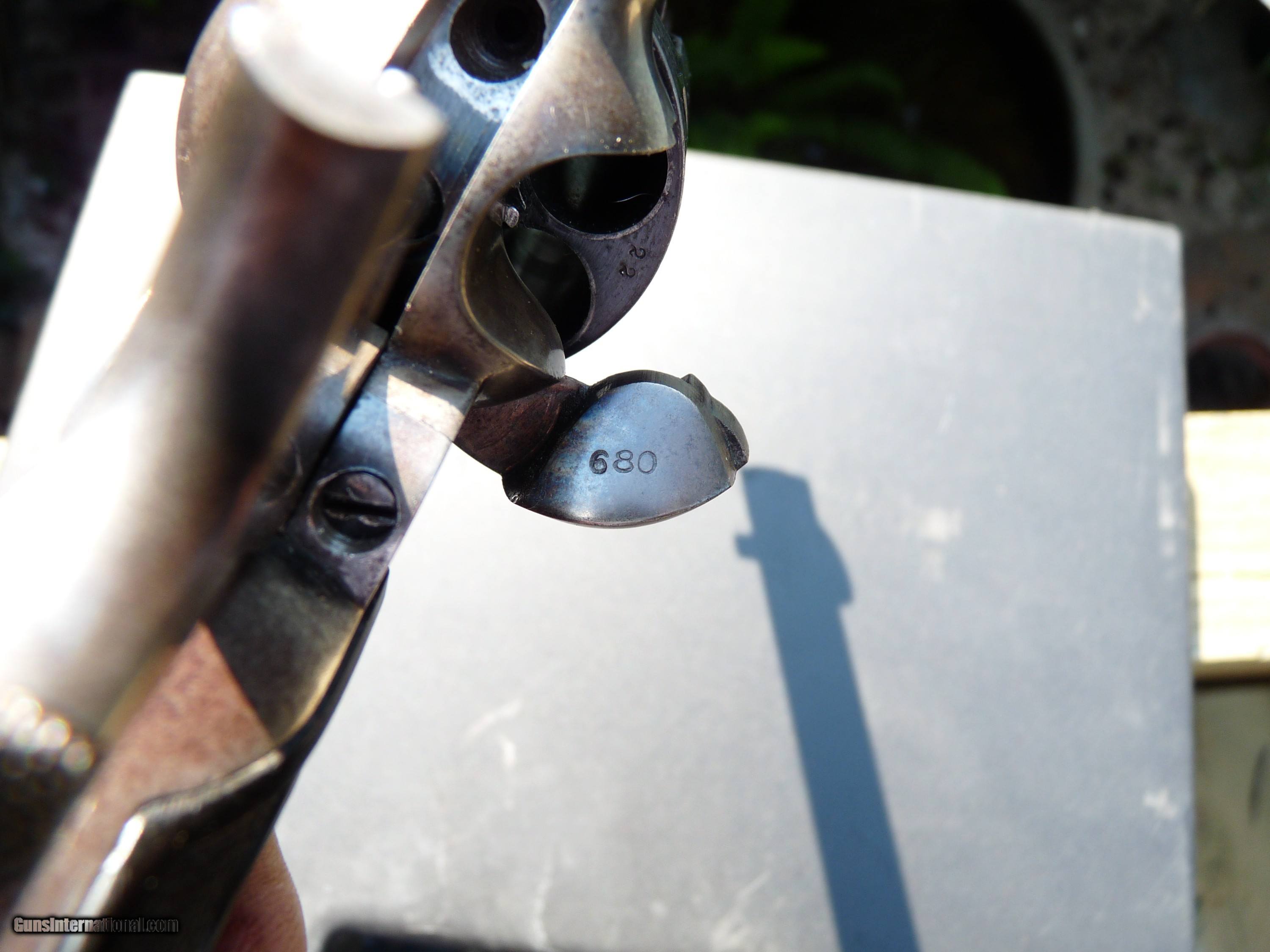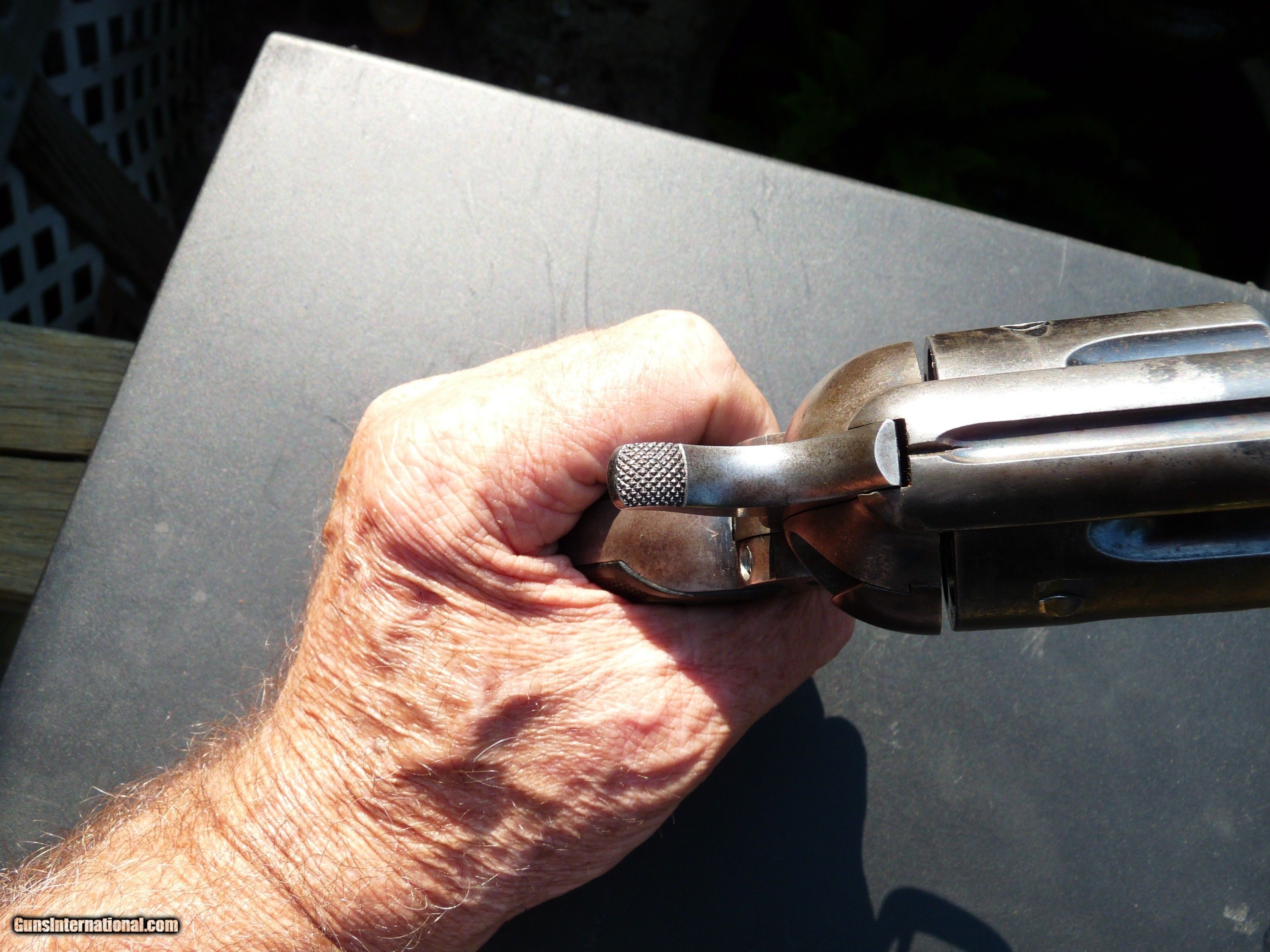 Description: Nice Colt 38 40 , good bore ,4 3/4 , 2 line barrel address lettering is clear as is 2 line pantent lettering. Has a fair amount of blue finishing on barrel & injector housing. Some case coloring on hammer ,most on reciever tuning to frost coloring, Action is crisp with 4 clicks.. Manufactured in 1923. Very nice 100 year old Colt. $50 to ship insured, Free shipping with buy it now. $2600 . SOLD Handgun Caliber: .38-40 Winchester (.38 WCF) |