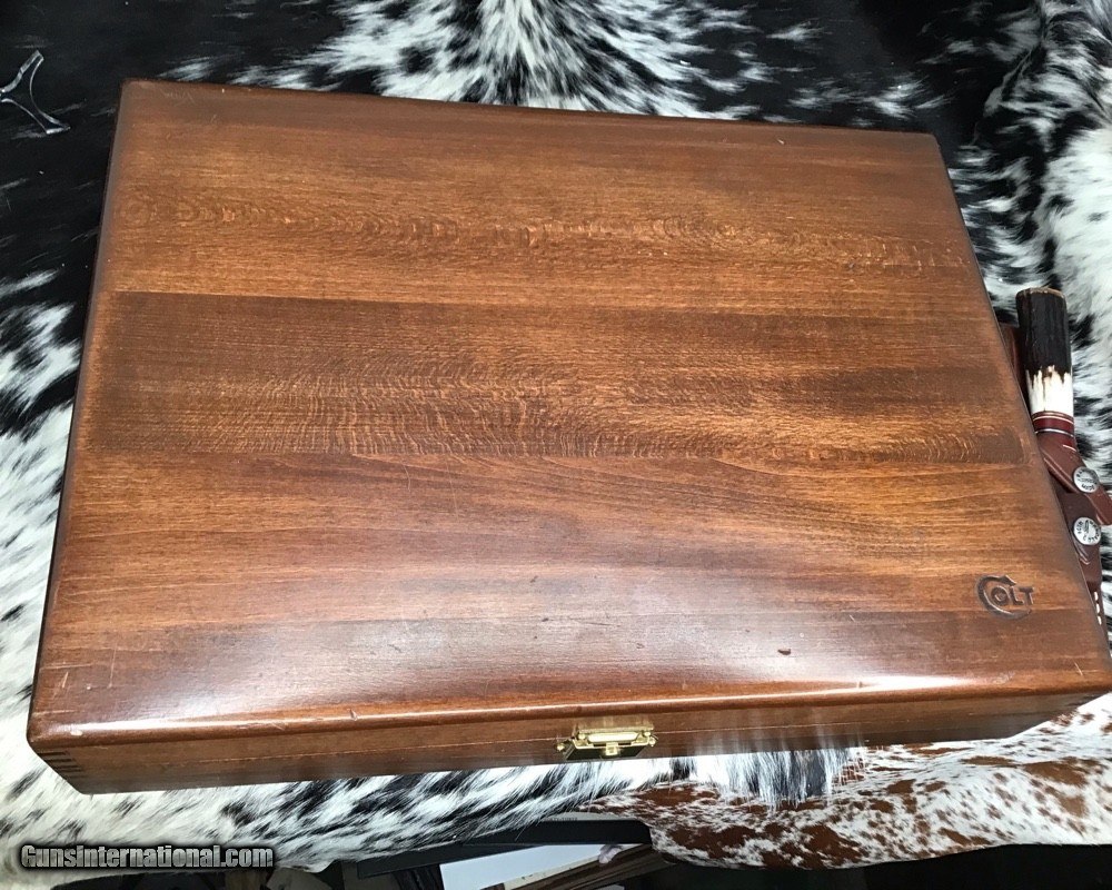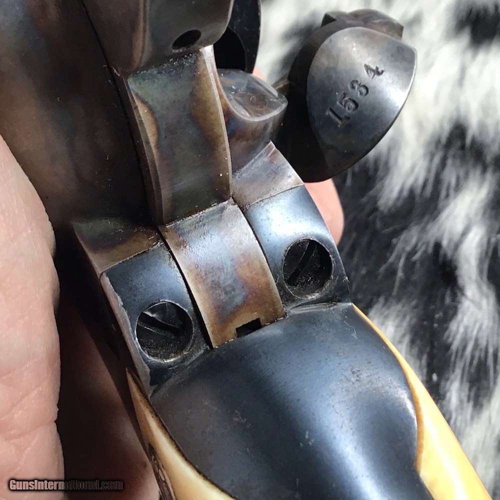 Description: 1924 Colt SAA, First Generation revolver, wearing a 7.5 inch Barrel and Elephant Ivory grips with Silver medallions. Excellent condition with near 90% case colors and factory blued finish remaining. Some freckling on blued surfaces. Gorgeous Pre ban Ivory grips showing great Amber patina with Silver factory medallions. Matching numbers on frame , and two spots on grip frame under grips. Loading gate and back of frame marked 1534. Bottom of grip frame engraved with initials W.E.U. A beautiful first generation Colt SAA in the best caliber wearing its original finish. Comes in Colt factory SAA presentation locking wood case with key and plush French cut interior. Add 3% if paying with credit card. God Bless America from a proud American, and a Viet Nam Vet , thankful for our freedoms.. paid for by the Blood ,Sweat and Tears of our brave men and women in uniform. Ten Below Firearms is a Veteran owned and operated business. We specialize in out of production models of high quality firearms. We love to ship! If you are out of state or can't make it to our store, just give us a call! Handguns normally ship for $30 and Long guns for $40 to $65 for extra length long guns. That's 2-3 day USPS Priority shipping, Delivery conformation and with tracking number. Optional Postal insurance is additional $1.70 per $100 and highly recommended. We are OPEN BY APPOINTMENT ONLY FOR IN PERSON VISITS SOLD Handgun Caliber: .45 Colt Manufacturer: Colt Model: SAA Serial Number: 346821 Barrel Length: 7.5 inch Condition: 90% Metal Condition: Very good Bore Condition: Very good Action: SA Finish: Blued/Case colors Sights: Fixed Manufacture Date: 1924 Item Location: Mn |