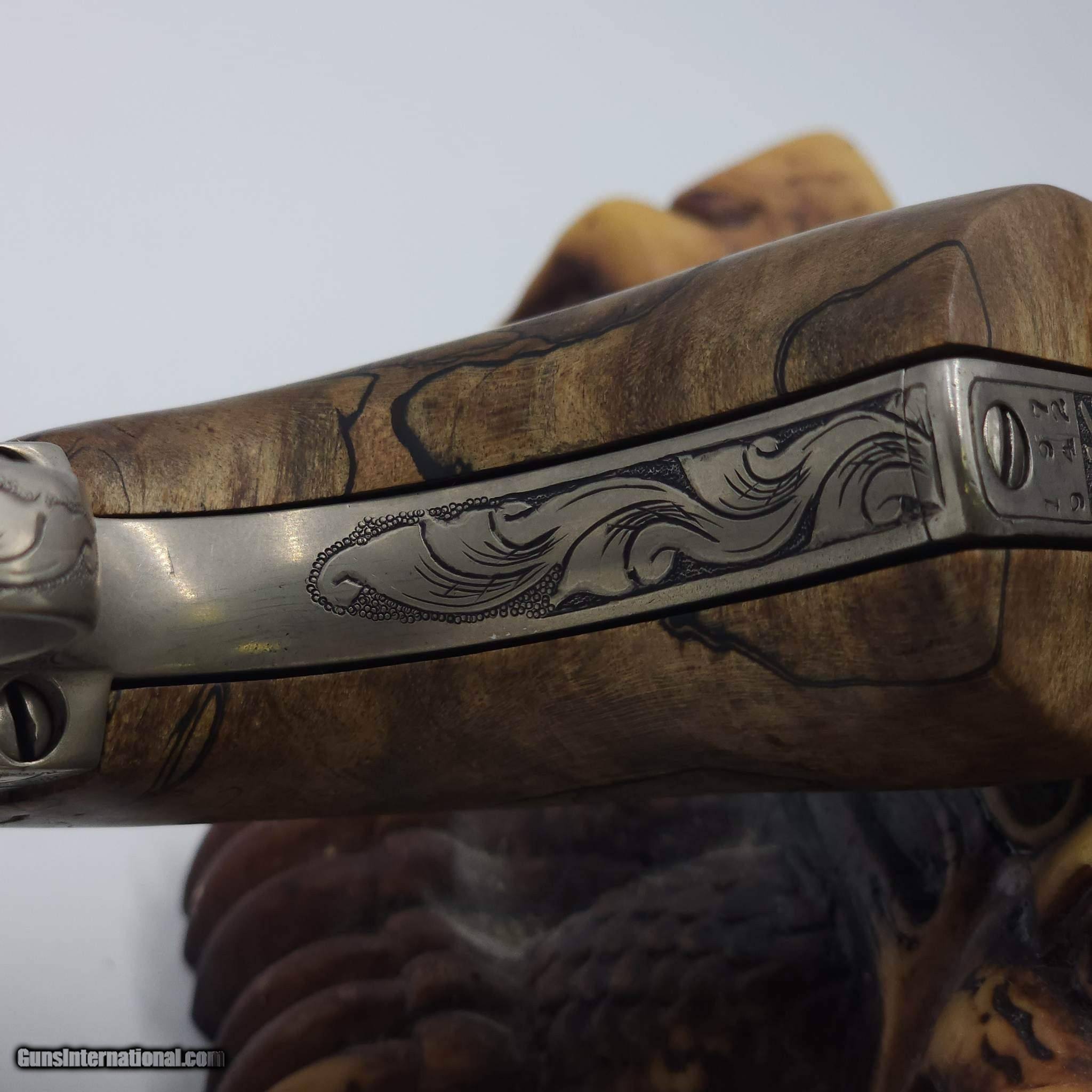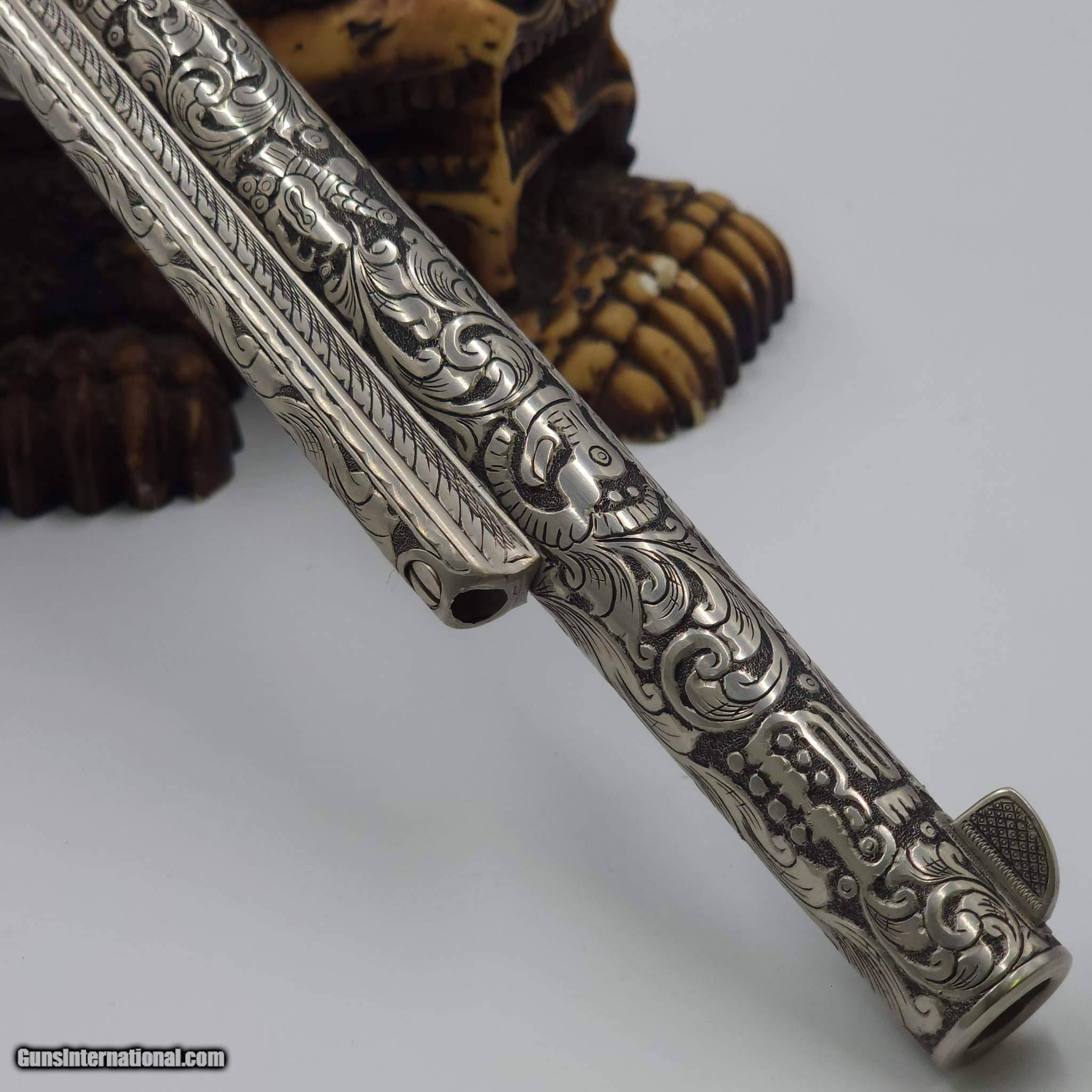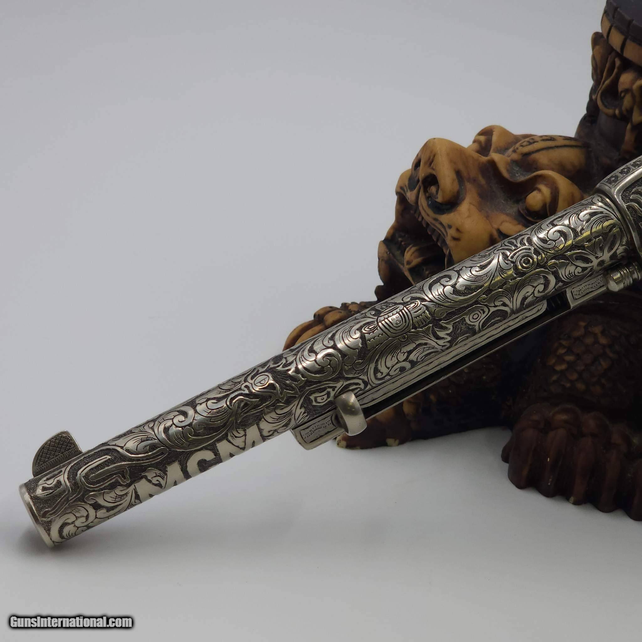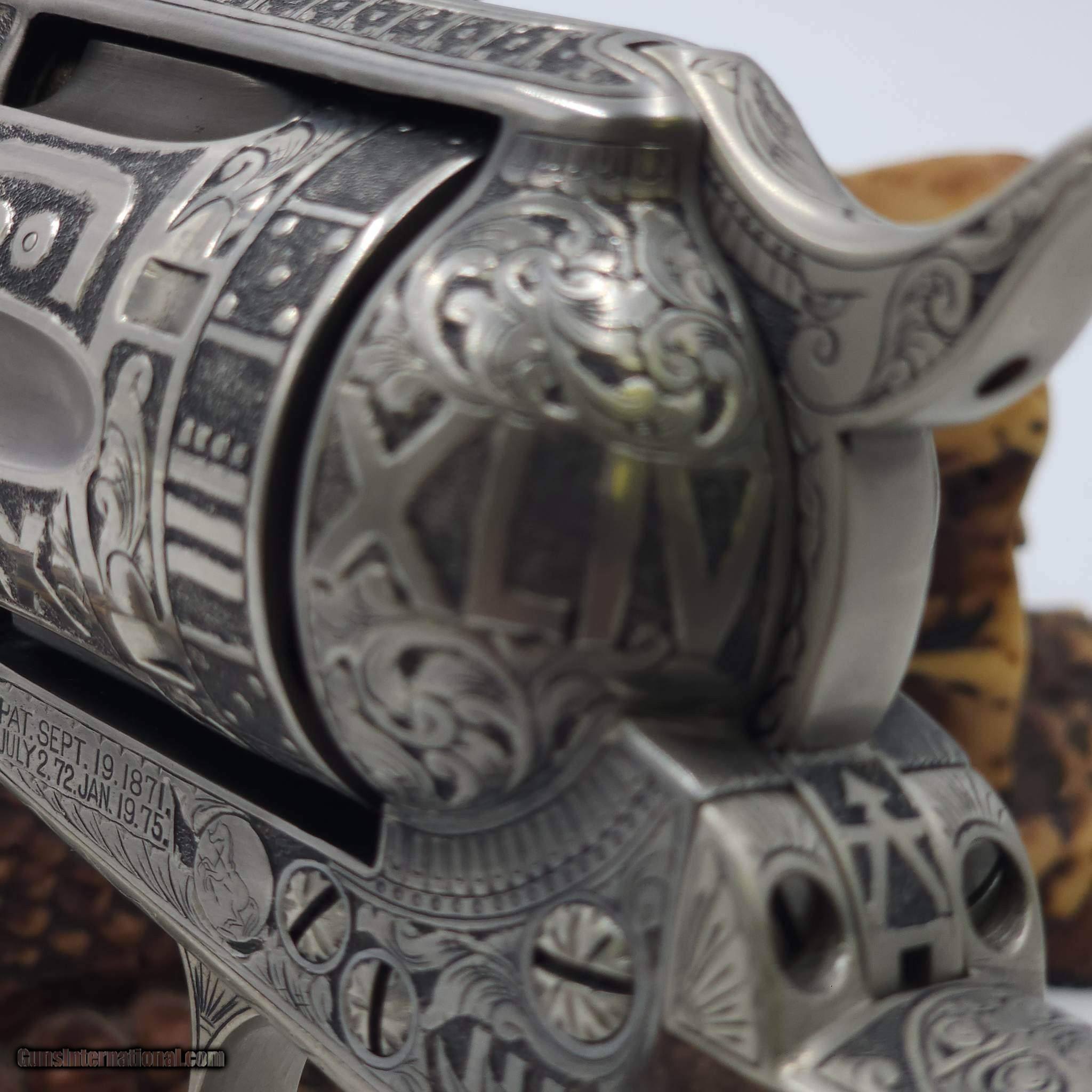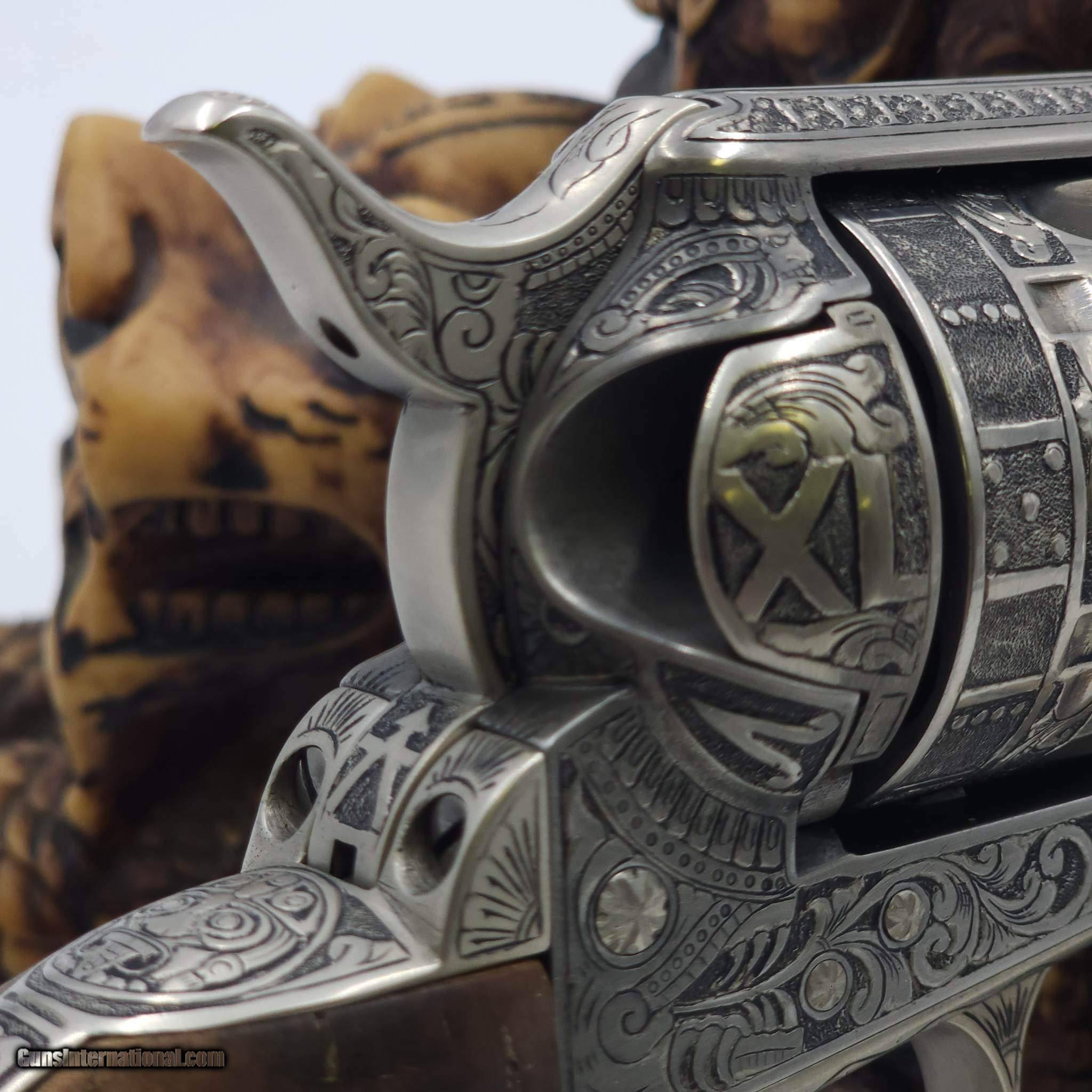 Description: 1900 Colt 44-40 , 7.5 barrel, deep hammer and chisel engraved, coded puzzle engraved. If you look at the the engraving you will find information like. The maker of the gun (Colt), the year of manufacture (1900), the serial number (---------), the caliper (44-40). It also has the Mayan calendar symbols and a monster fish eating a shrimp on the right side of the frame. A Mayan crab in the loading gate. Hammer has monster fish heads on each side. This is the barbecue gun to have and share. David Wade Harris has included some of his personal touches. Will take trades. SOLD Handgun Caliber: .44-40 Winchester (.44 WCF) Manufacturer: Colt Model: SAA |