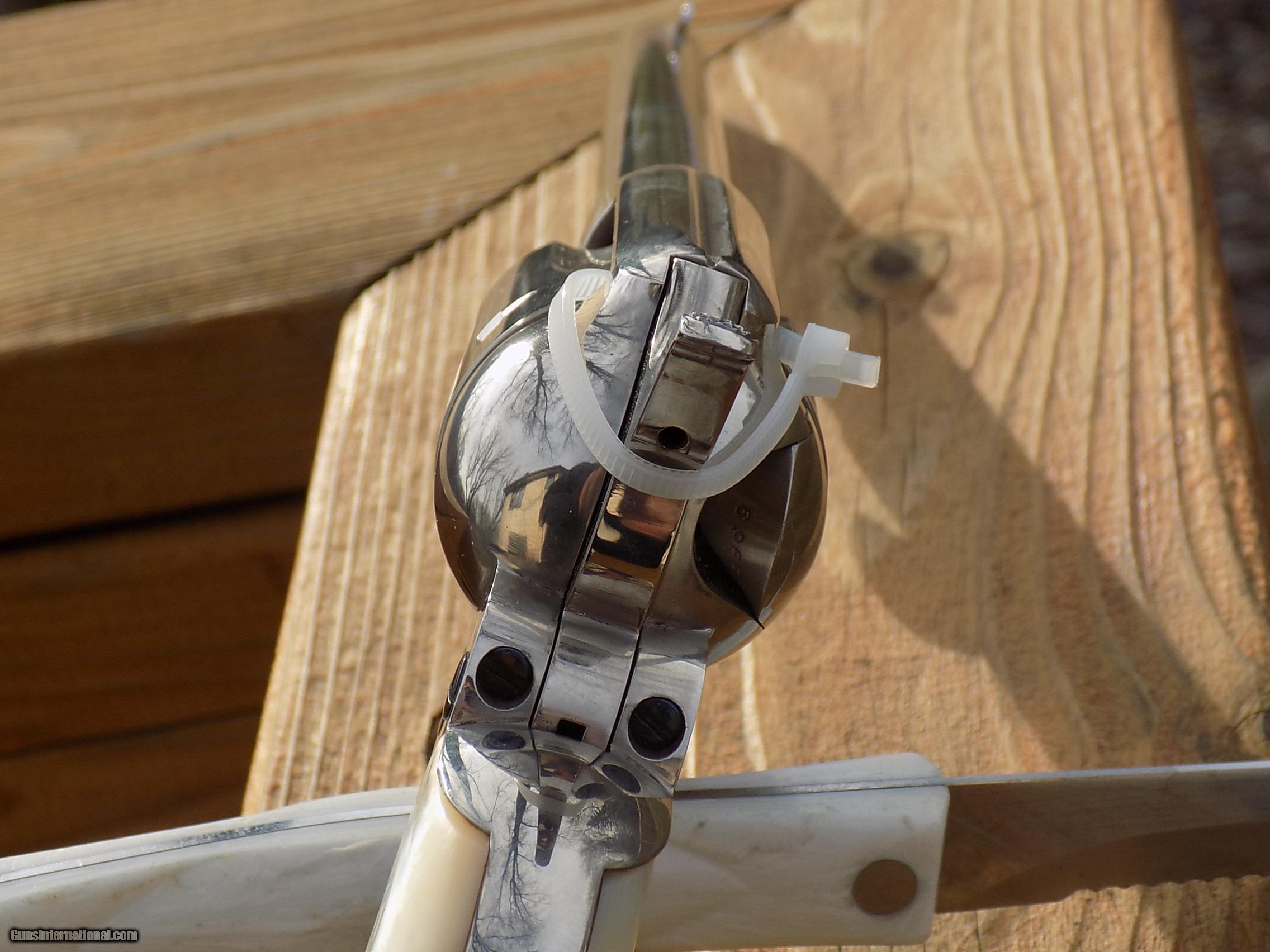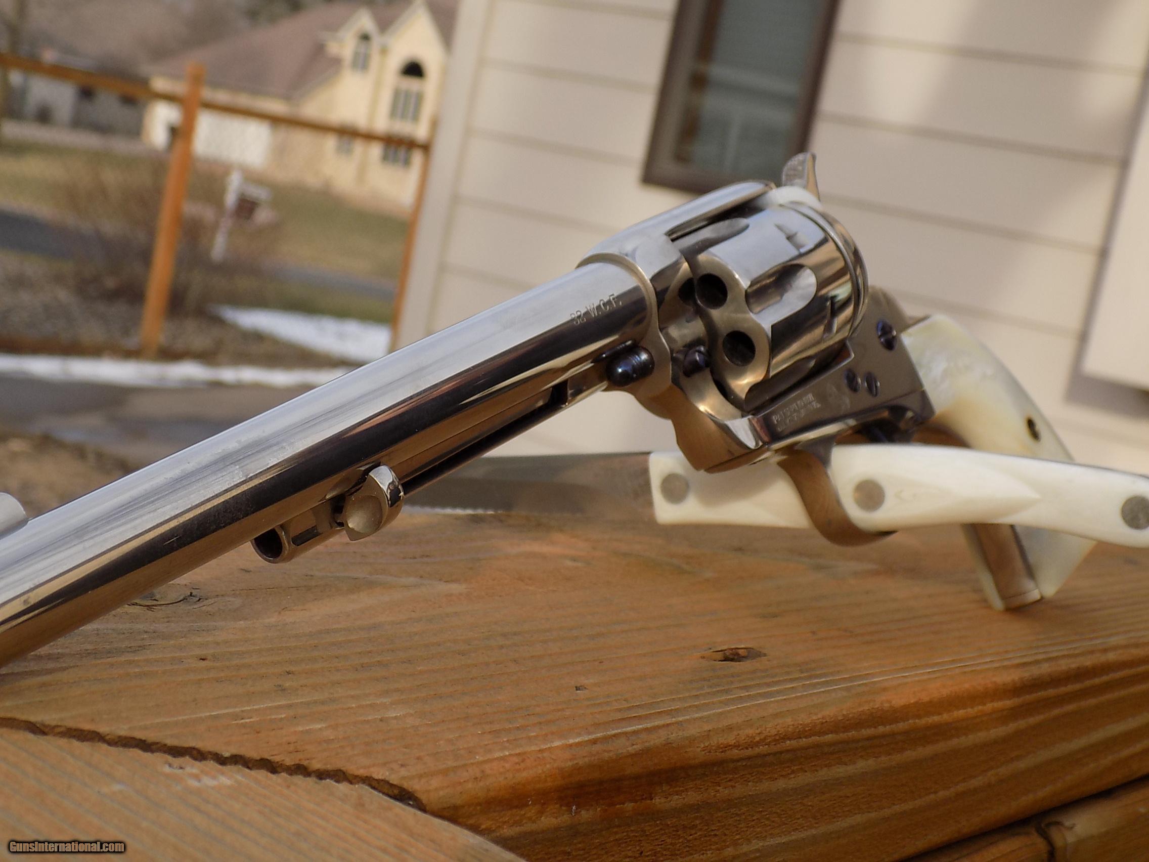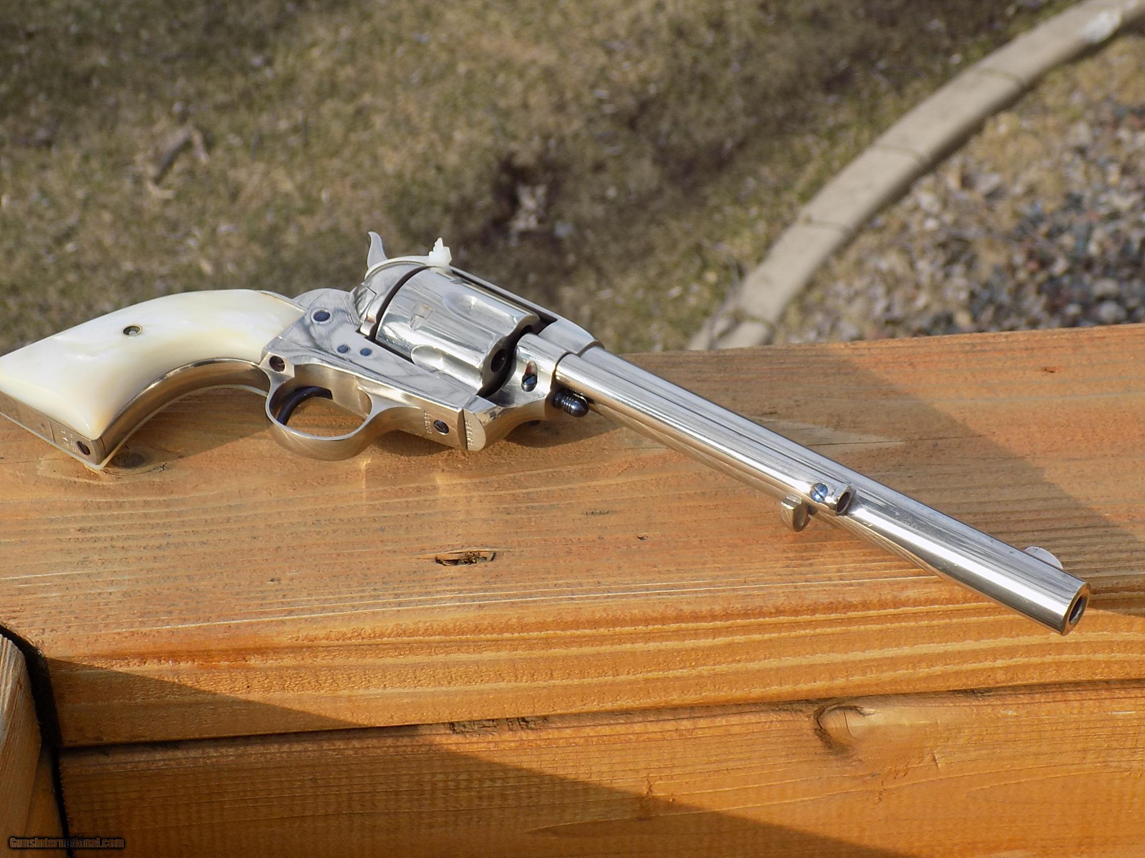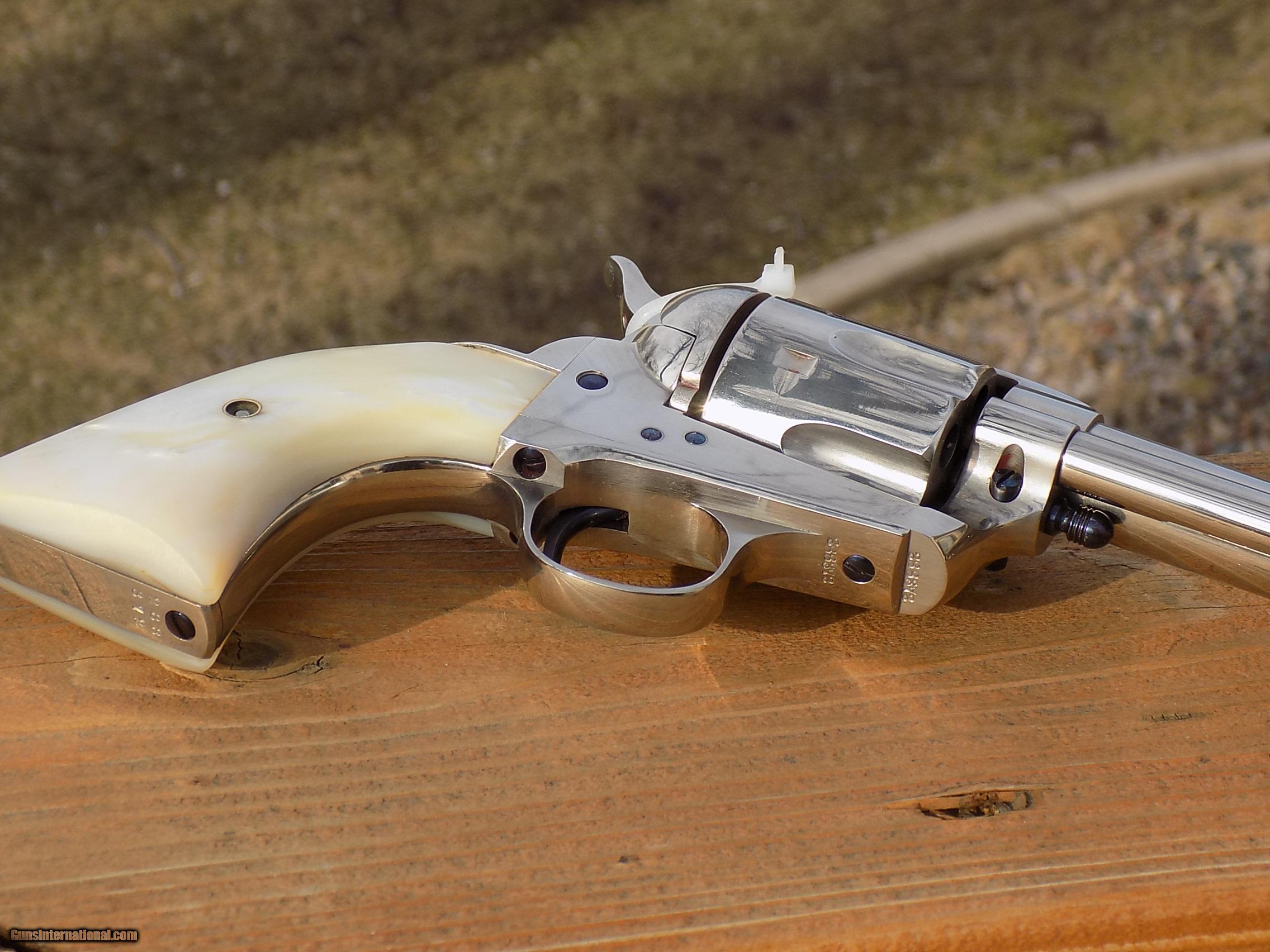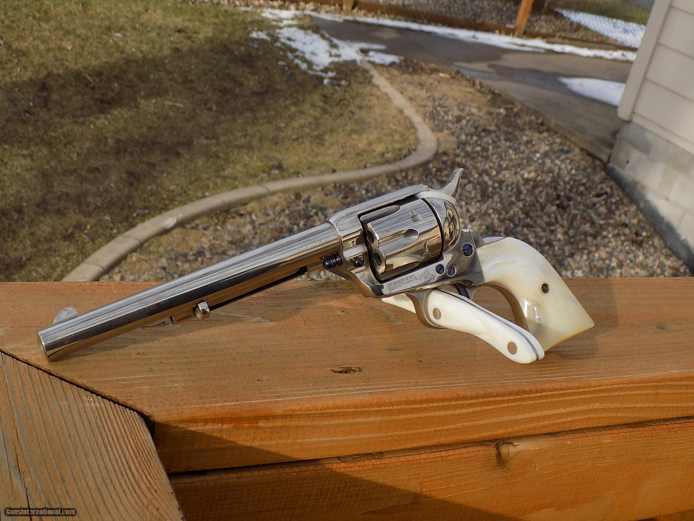 Description: 'WE NEED INVENTORY' WE BUY, TRADE AND CONSIGN QUALITY FIREARMS' Here is one amazing old Colt. Manufactured in 1907 this SAA remains in like new condition, appears unfired and is unturned. the nickel finish is 100% with just a mild frosting of the finish as should be expected. Fire blue parts are perfect and the Mother Of Pearl grips are near perfect with a minor chip on the left panel at the frame. No cracks to the grips and they are in solid condition. The factory letter, ordered, confirms the configuration including the MOP grips. An outstanding example of an early 1900's Nickel finish Colt SAA. Sorry, no box... Buyer pays overnight insured shipping to FFL. C&R OK sold SOLD Curio/Relic: Yes |