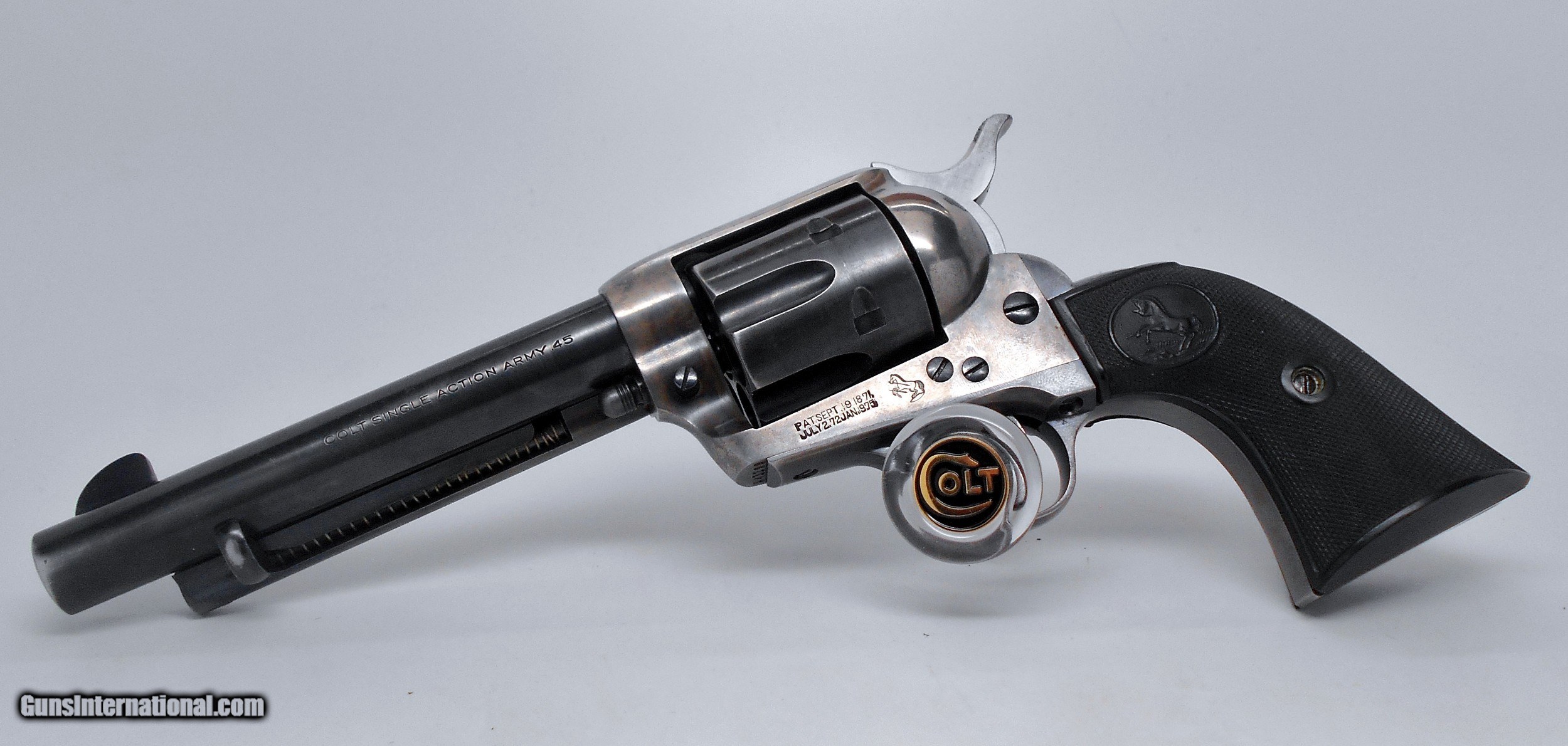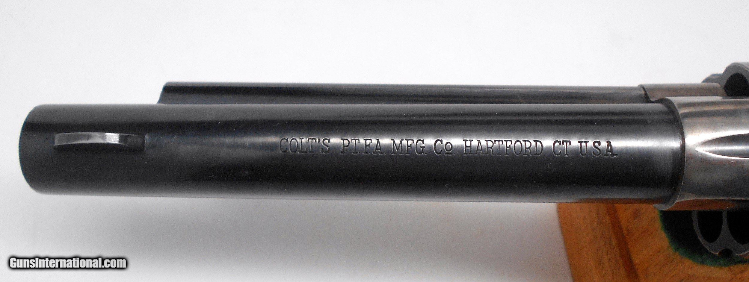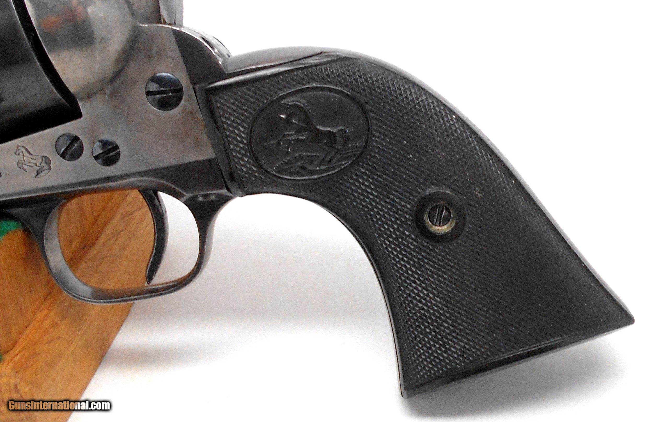 Description: SOLD Bore in the 5 1/2" barrel is like new. Shows excellent care. Action is smooth and tight. Lock-up is tight also. Markings are clear and original. Manufacture date is 1921. Numbers do match. Forgot to picture the assembly numbers. They also match. The grips are in nice condition, but do not match. The hammer is an earlier type. You will find a lot of the original blue on the barrel and the cylinder. Notice how much case color is still present. I have taken a lot of pictures which clearly and fairly show the condition of this Colt .45 caliber Single Action Revolver. American Arms & Antiques item #2454 SOLD Curio/Relic: Yes |