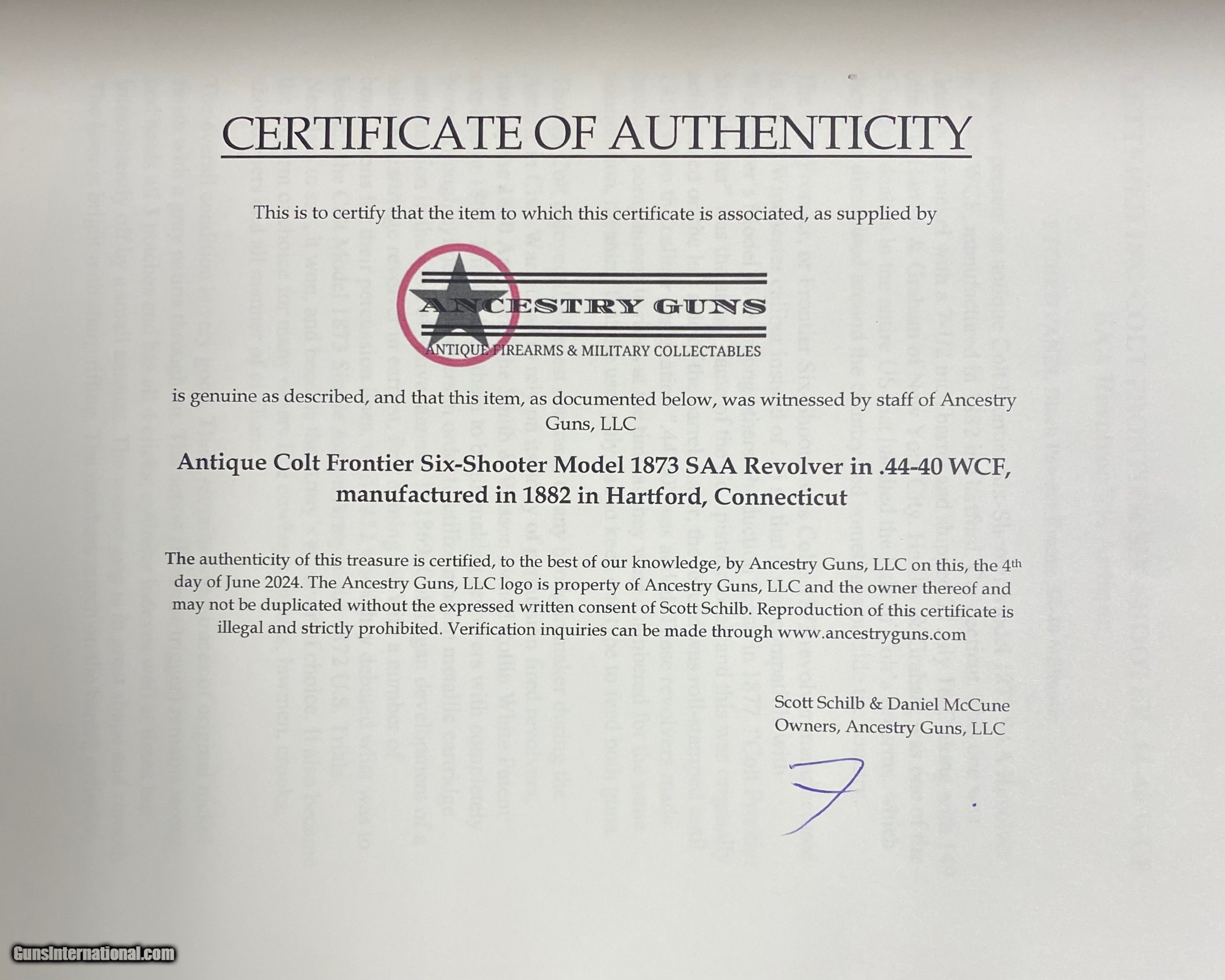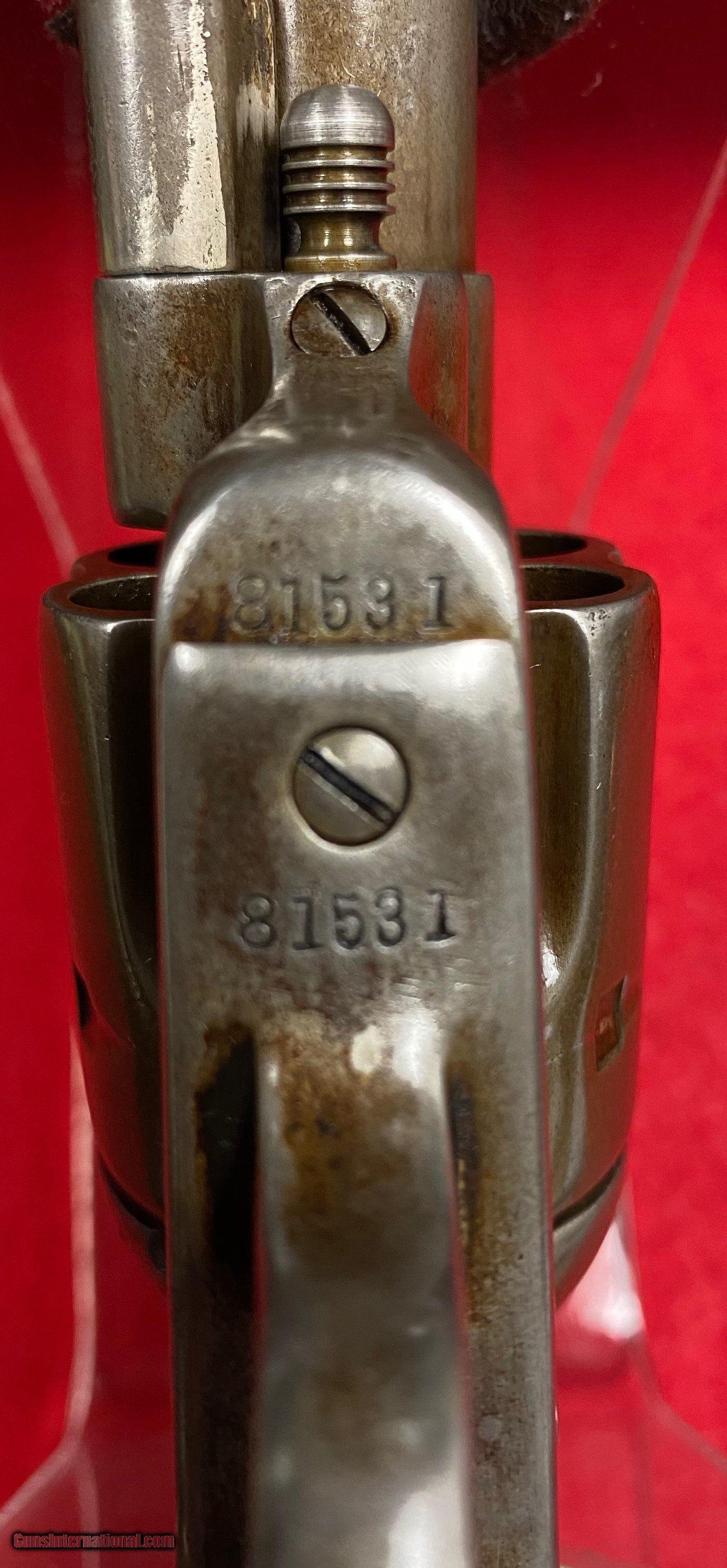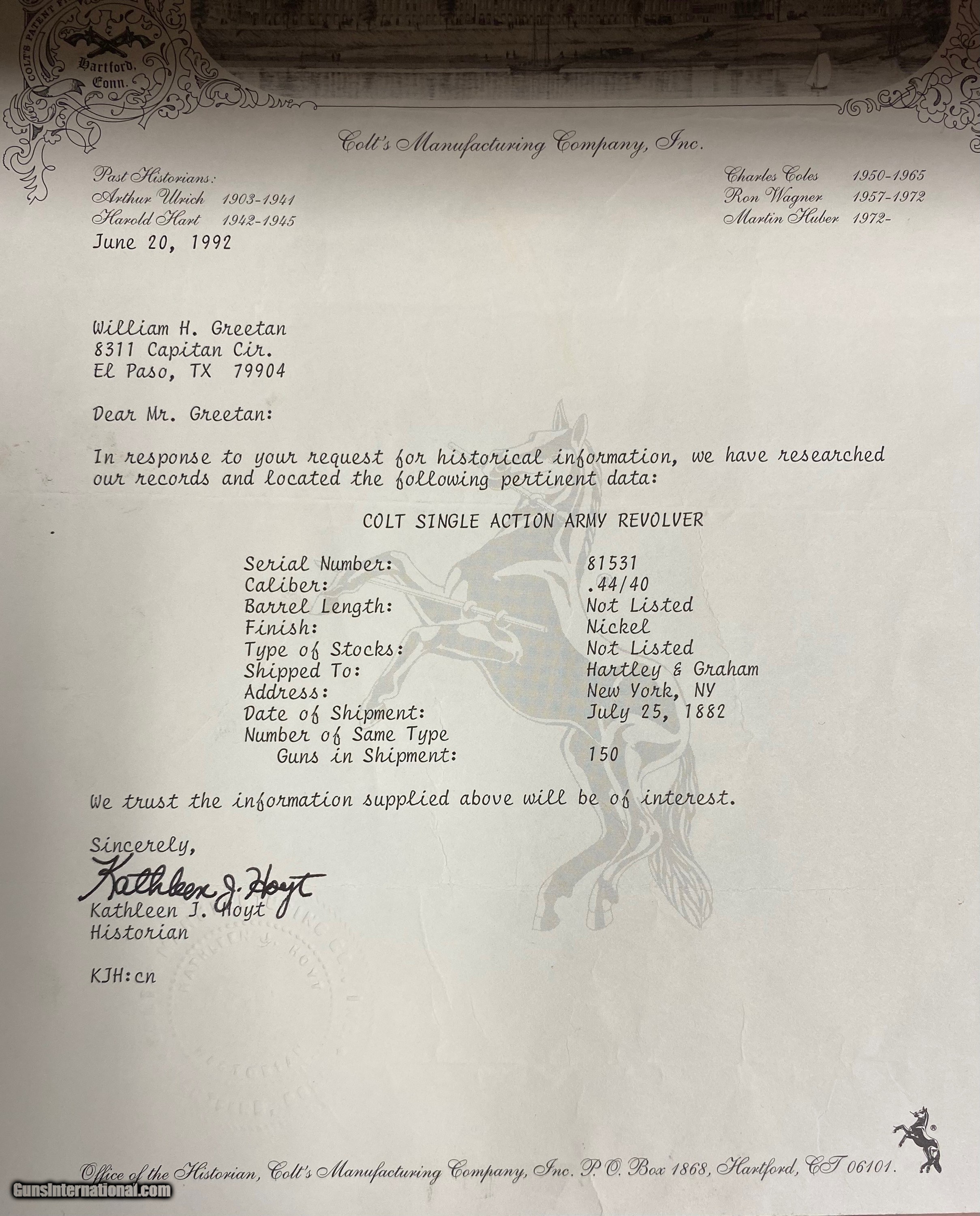 Description: Antique 1882 Colt Frontier Six Shooter 44–40 WCF SAA revolver with an etched panel along with Colt Letter. Manufactured in 1882 in Hartford, Connecticut. Colt Letter shows this Revolver produced with nickel finish and a 7 1/2 inch barrel. It was shipped to Hartley and Graham of New York City. Overall condition is very good. There still remains some traces of original nickel finish with a gray patina throughout. The action remains strong and holds all three notches and has all four clicks. Cylinder indexes well but occasionally off by a small amount. Walnut grips are in great shape and smooth. The bore is bright with sharp rifling. The numbers match on the barrel, cylinder, frame, trigger guard and grip frame. A very nicely preserved and archived lettered Colt Frontier Six Shooter for your collection! Complete with Colt Letter and additional Certificate of Authenticity. $100 insured shipping packaged safely and sent directly to your door! SOLD Antique: Yes Handgun Caliber: .44-40 Winchester (.44 WCF) Manufacturer: Colt Model: Saa Serial Number: 81531 Barrel Length: 7 1/2” Chambers: Six Condition: Very good Metal Condition: Very good Wood Condition: Very good Bore Condition: Very good Action: Single Finish: Nickel Sights: Fixed Manufacture Date: 1882 Item Location: WV |