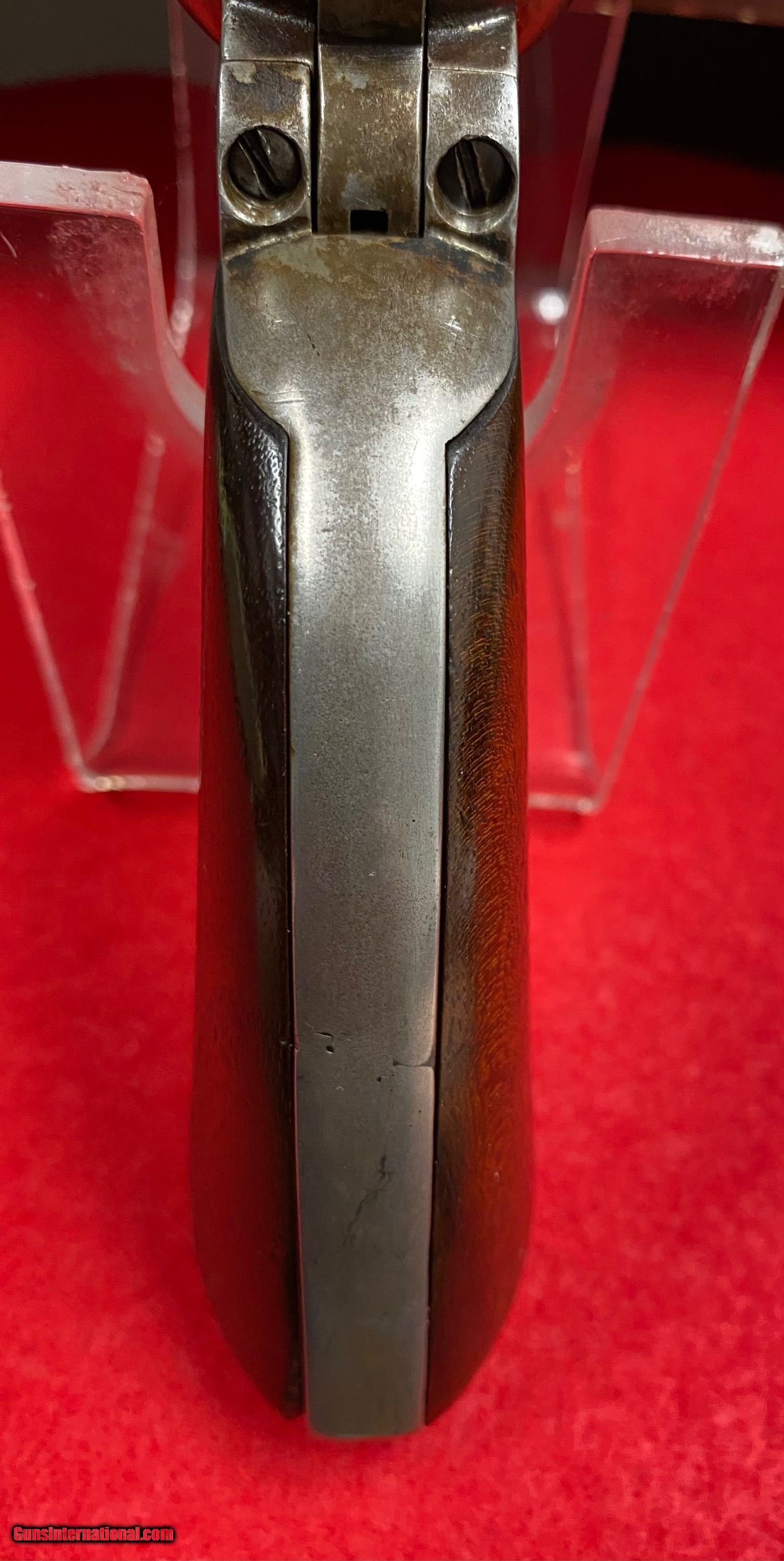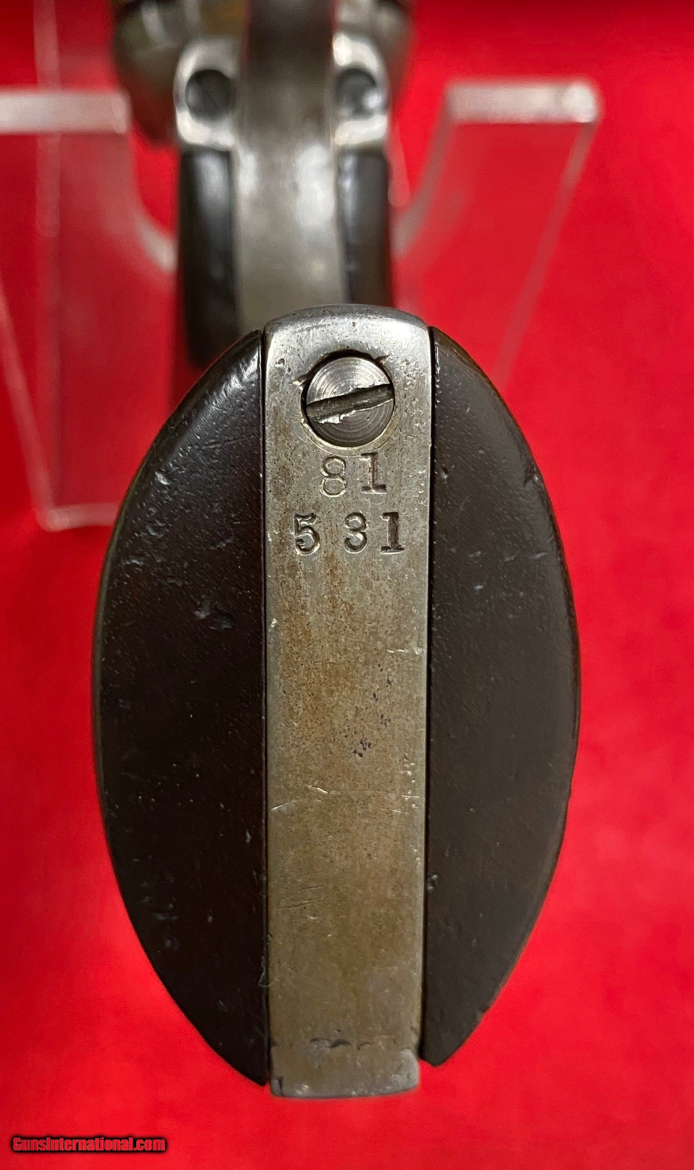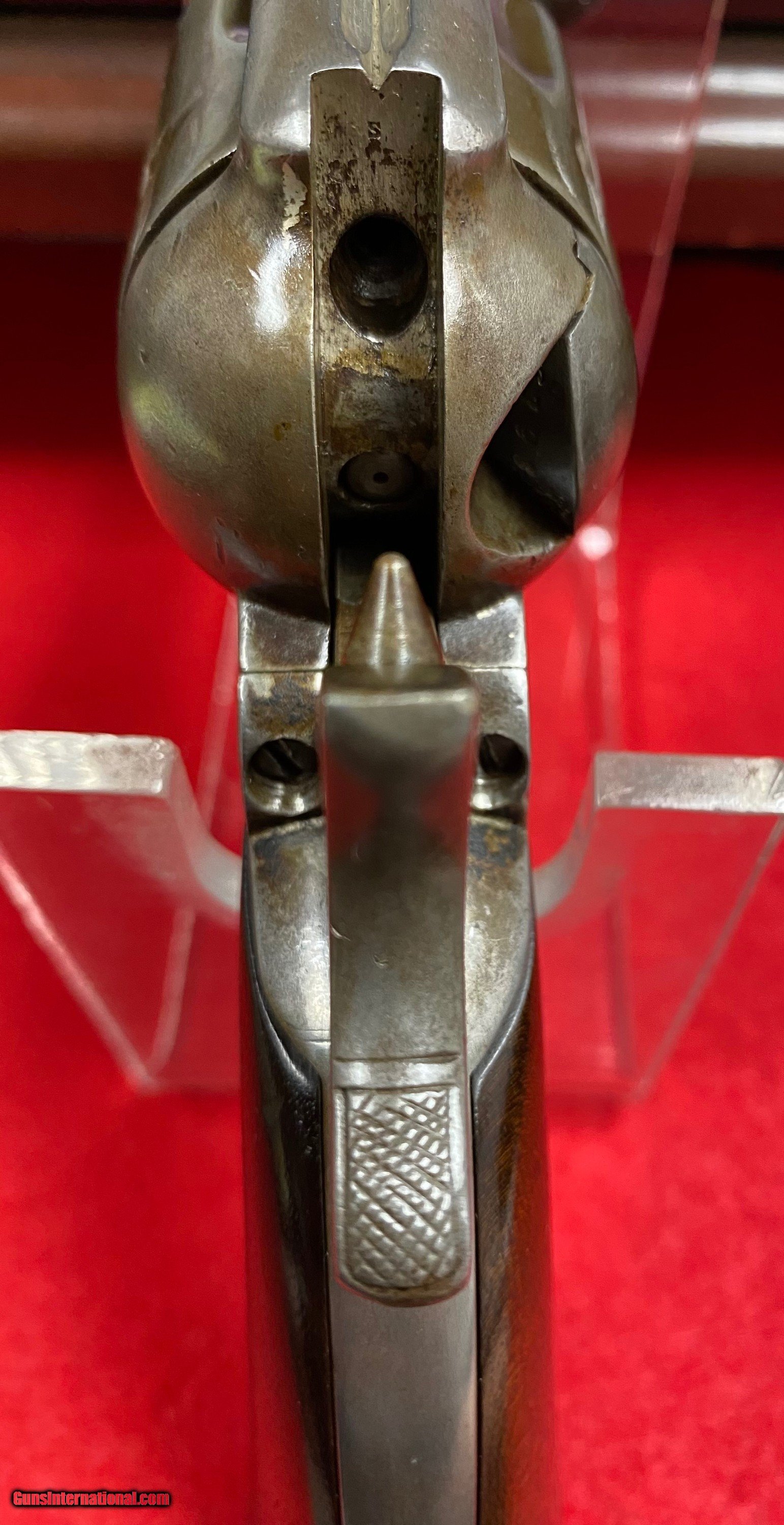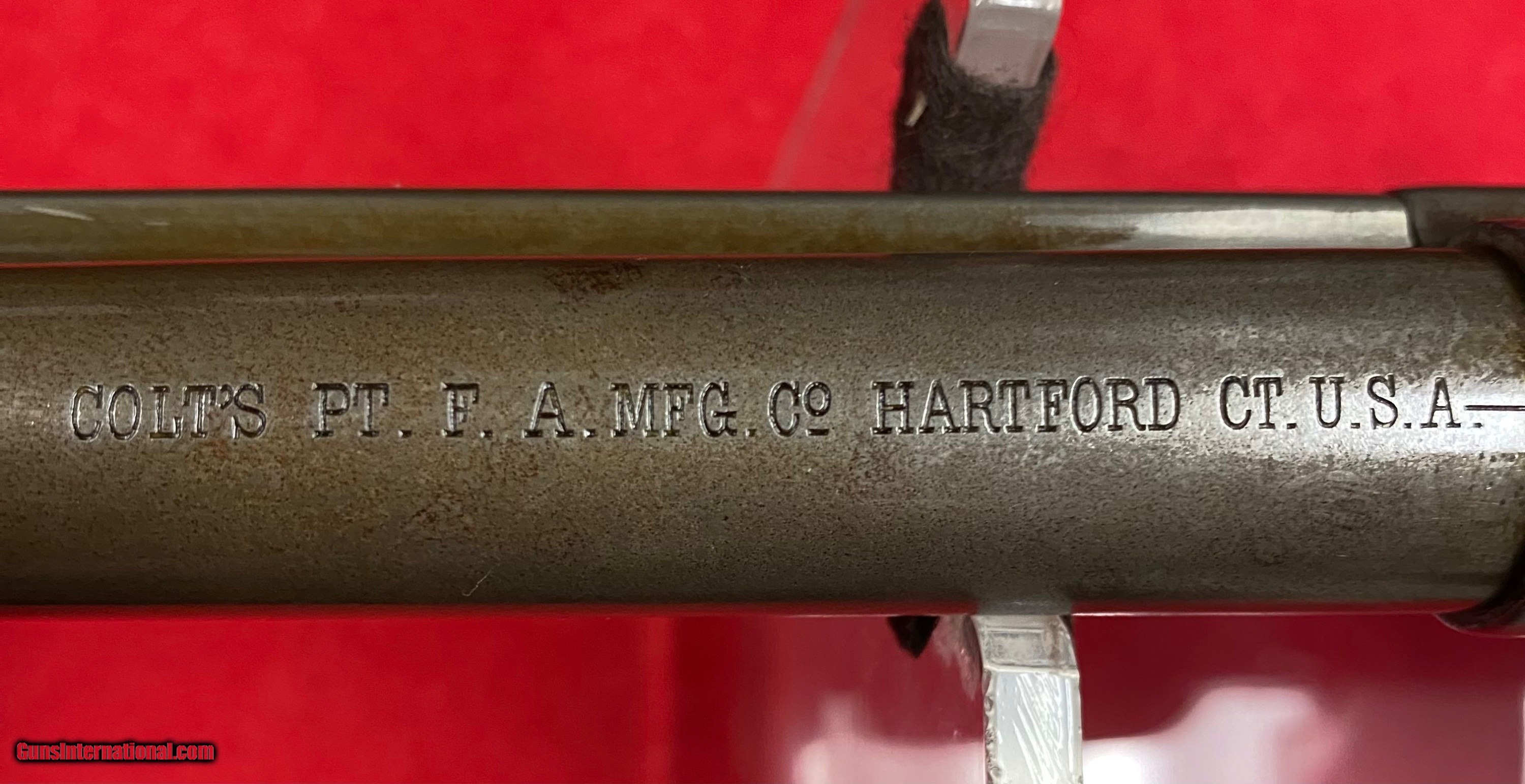 Description: Antique 1882 Colt Frontier Six Shooter 44–40 WCF SAA revolver with an etched panel along with Colt Letter. Manufactured in 1882 in Hartford, Connecticut. Colt Letter shows this Revolver produced with nickel finish and a 7 1/2 inch barrel. It was shipped to Hartley and Graham of New York City. Overall condition is very good. There still remains some traces of original nickel finish with a gray patina throughout. The action remains strong and holds all three notches and has all four clicks. Cylinder indexes well but occasionally off by a small amount. Walnut grips are in great shape and smooth. The bore is bright with sharp rifling. The numbers match on the barrel, cylinder, frame, trigger guard and grip frame. A very nicely preserved and archived lettered Colt Frontier Six Shooter for your collection! Complete with Colt Letter and additional Certificate of Authenticity. $100 insured shipping packaged safely and sent directly to your door! SOLD Antique: Yes Handgun Caliber: .44-40 Winchester (.44 WCF) Manufacturer: Colt Model: Saa Serial Number: 81531 Barrel Length: 7 1/2” Chambers: Six Condition: Very good Metal Condition: Very good Wood Condition: Very good Bore Condition: Very good Action: Single Finish: Nickel Sights: Fixed Manufacture Date: 1882 Item Location: WV |