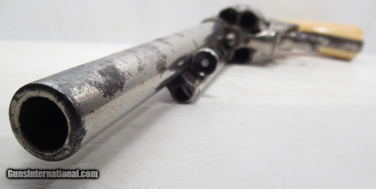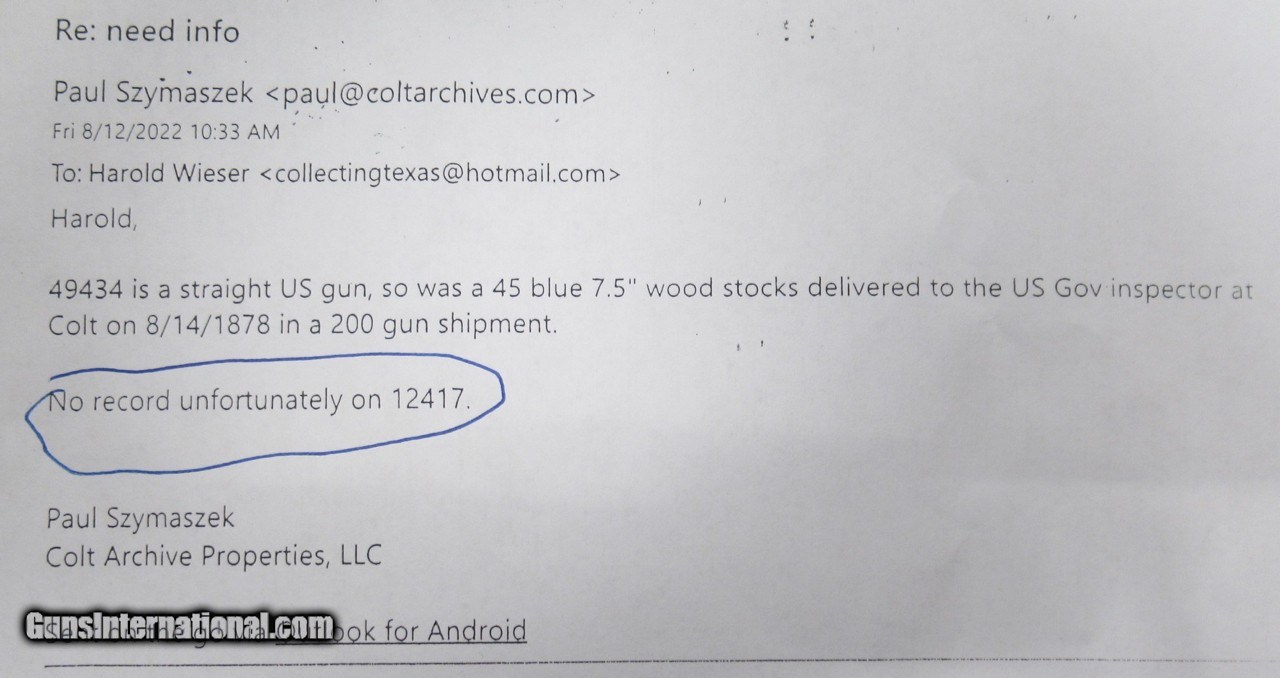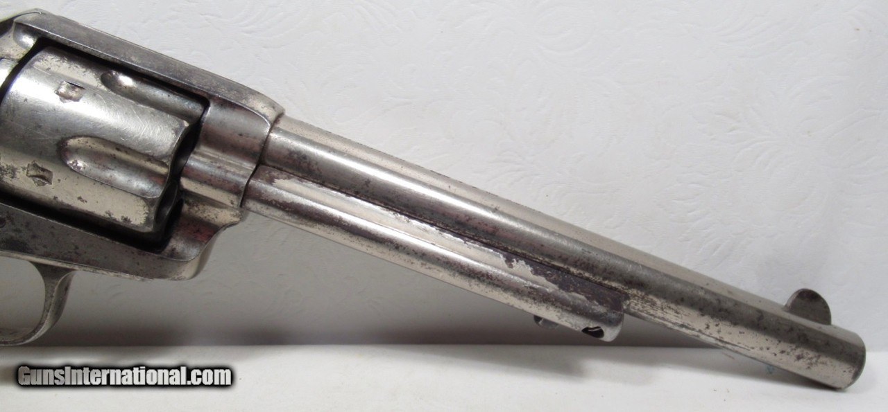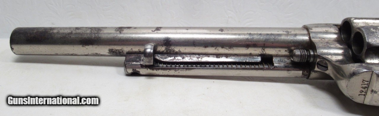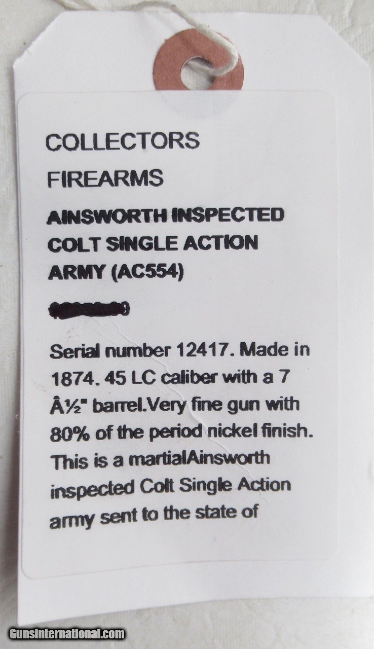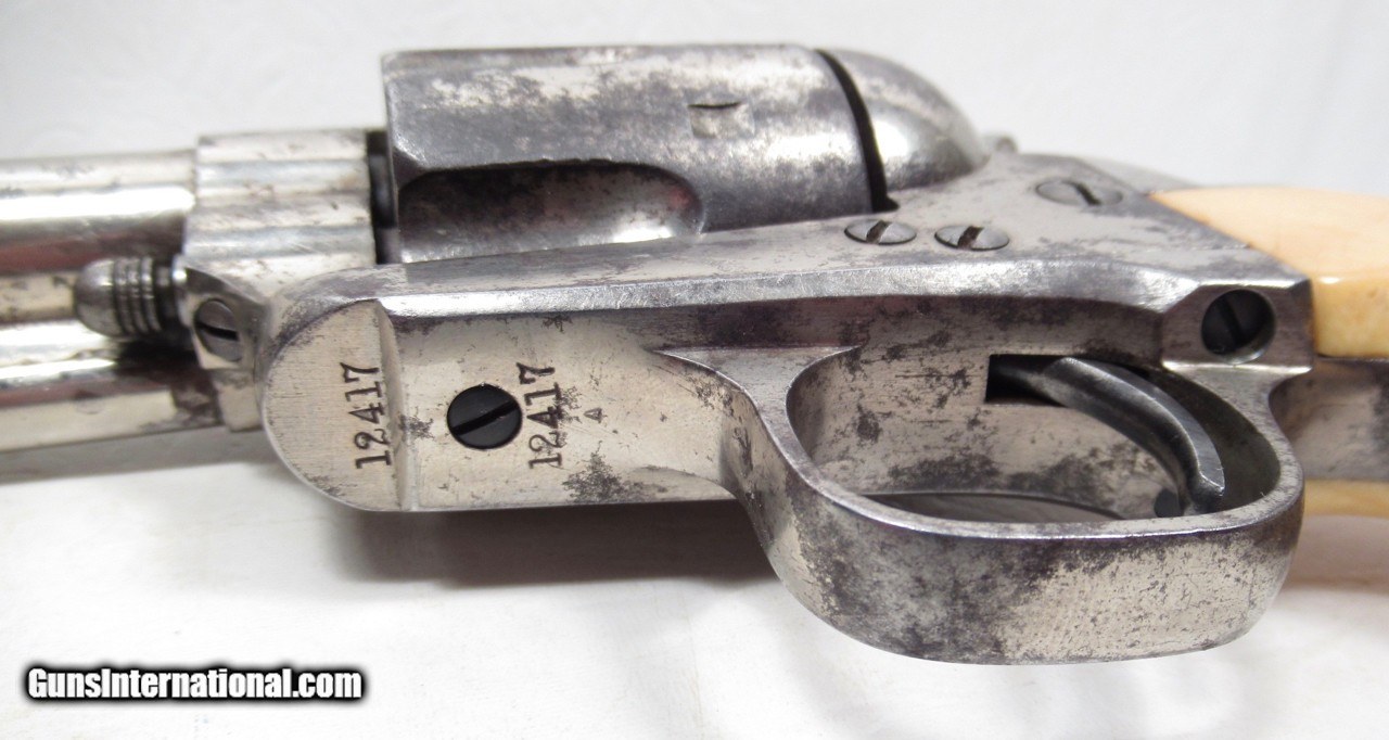 Description: Colt Single Action Army Revolver; Serial No. 12417; Colt has no Record of This Revolver; Per Collectors Firearms Info: 45 Caliber with 7 ½” Barrel and Made in 1874; This is 1 of About 1600 S.A.A.’s that the U.S. Government Sent to West Virginia; West Virginia Immediately Turned Around and Sold the Revolvers to Dealers; This Colt is All Matching except 3rd Style Ejector Housing; No U.S. or Patent Dates on Frame; All “A” Inspector Marks Present; Per Collectors Firearms Description – About 80% Nickel Finish Remains; Great Old Ivory Grips; Perfect Action; Very Strong Bore with minor flaws; Nice Old Tooled Slim Jim Holster Included; Very Colorful 148 Year-Old Colt 45 Revolver; See All Photos for Condition; No Texts; Call (254)541-5765 or Email Only; PERSONAL PROPERTY of Harold Wieser; Price: $10,975 + $45 S&H Via USPS PRIORITY MAIL; Payment Address: Harold Wieser - 1466 U.S. Hwy 77 - Rosebud, TX 76570; SEND PAYMENTS VIA USPS PRIORITY MAIL; BEWARE of SCAMS!!! – DO NOT SEND MONEY or CORRESPONDENTS ELECTRONICALLY UNLESS YOU HAVE SPOKEN to HAROLD WIESER FIRST! 254-541-5765 SOLD Antique: Yes Manufacturer: Colt Model: 1873 Serial Number: 12417 |