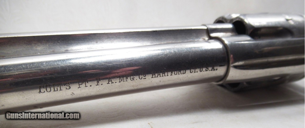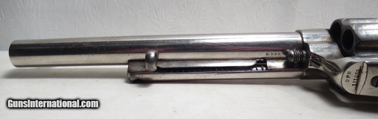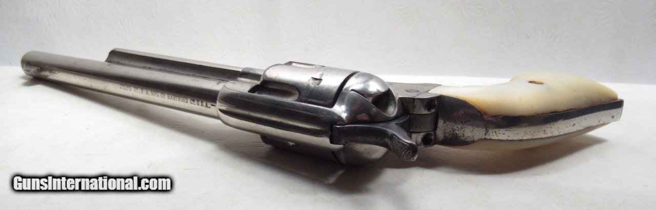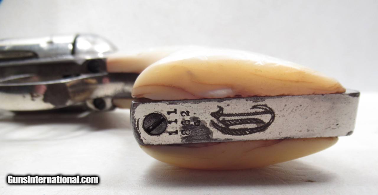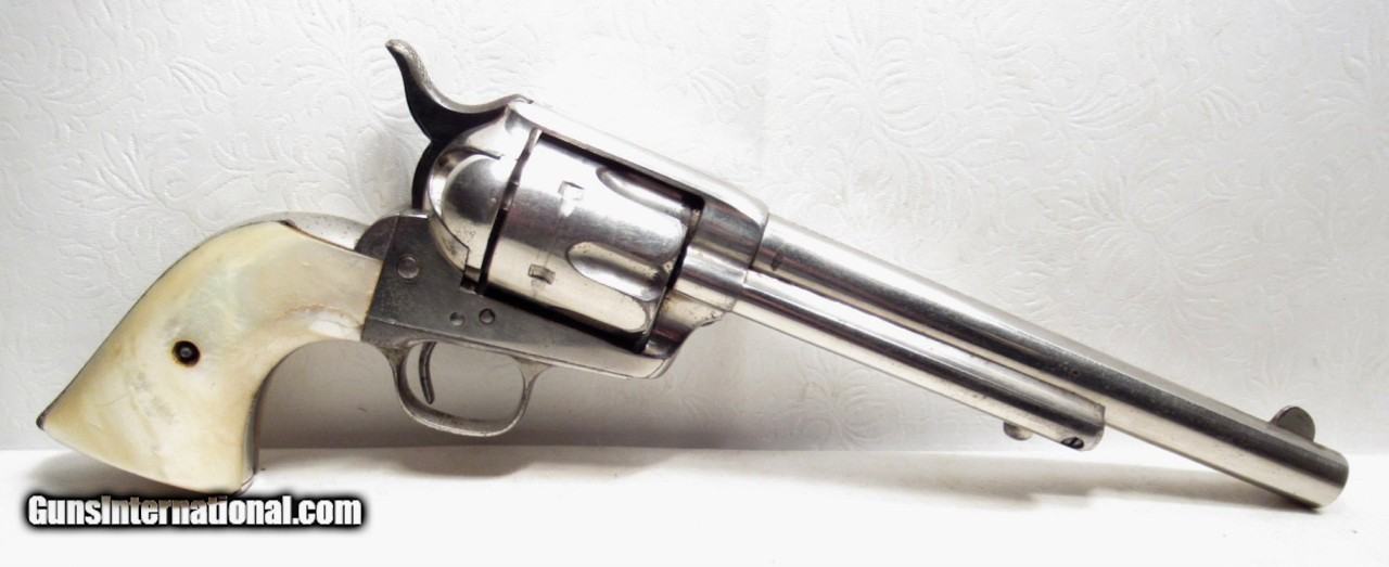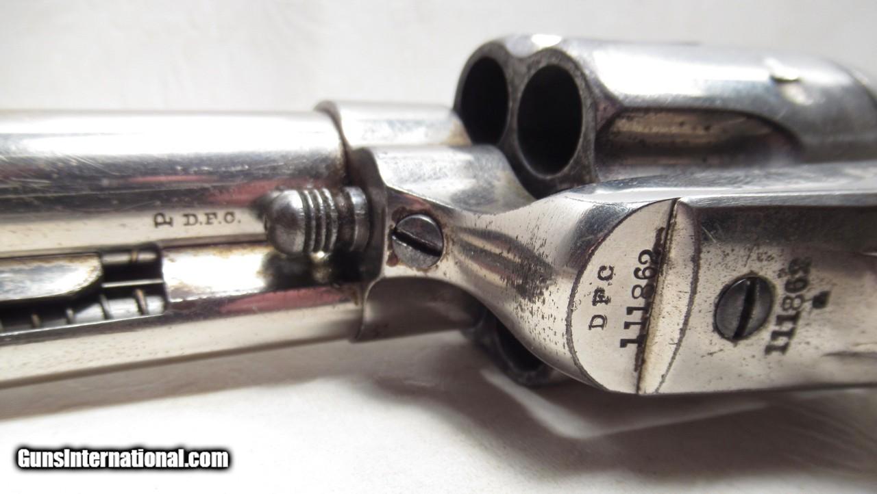 Description: Colt Single Action Army Revolver; Serial No. 111862; .45 Long Colt Caliber; 7 ½” Barrel; Nickel Plated; David F. Clark Inspected; “U.S.” Marked on Left Side of Frame; Pearl Grips (with Chip on Right Grip); “D.F.C.” Marked on Barrel, Frame, and Cylinder; “P” Proof Appears on Bottom of Barrel and Cylinder; Nickel Plated U.S. Cavalry Models are a Hot Topic of Debate Among Colt and U.S. Military Collectors; Four Current Basic Theories Exist on these Revolvers and are as Follows: 1. Issued to Indian Scouts and Police; 2. Special Order “Officers” Revolvers; 3. Surplus State of Virginia Militia Revolvers Sold to and Nickel Plated by Colt or Commercial Retailers; 4. U.S. Navy Revolvers; History Relating to this Ongoing Debate can be Found on Pages 249-258 of “A Study of Colt Single Action Army Revolver”; Butt of Revolver is Inscribed with a Large “C” in Old English Font; Good Action; Very Strong Bore with light even frosting throughout; Proper 2nd Model Housing; Historic 140 Year-Old Colt U.S. Cavalry Model Revolver; See All Photos for Condition; No Texts; Call (254)541-5765 or Email Only; PERSONAL PROPERTY of Harold Wieser; NOTICE: We Do Not Do Any Consignments - All Items Listed are Owned by Us - NO SALES to New Jersey or New York City - Antiques Only to Massachusetts and California; Price: $14,975 + $45 S&H Via USPS PRIORITY MAIL; Payment Address: Harold Wieser - 1466 U.S. Hwy 77 - Rosebud, TX 76570; SEND PAYMENTS VIA USPS PRIORITY MAIL; BEWARE of SCAMS!!! – DO NOT SEND MONEY or CORRESPONDENTS ELECTRONICALLY UNLESS YOU HAVE SPOKEN to HAROLD WIESER FIRST! 254-541-5765 SOLD Antique: Yes Manufacturer: Colt Model: 1873 Serial Number: 111862 |