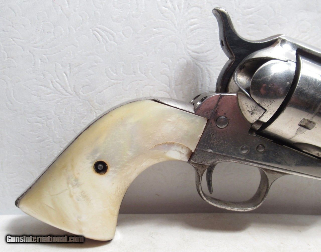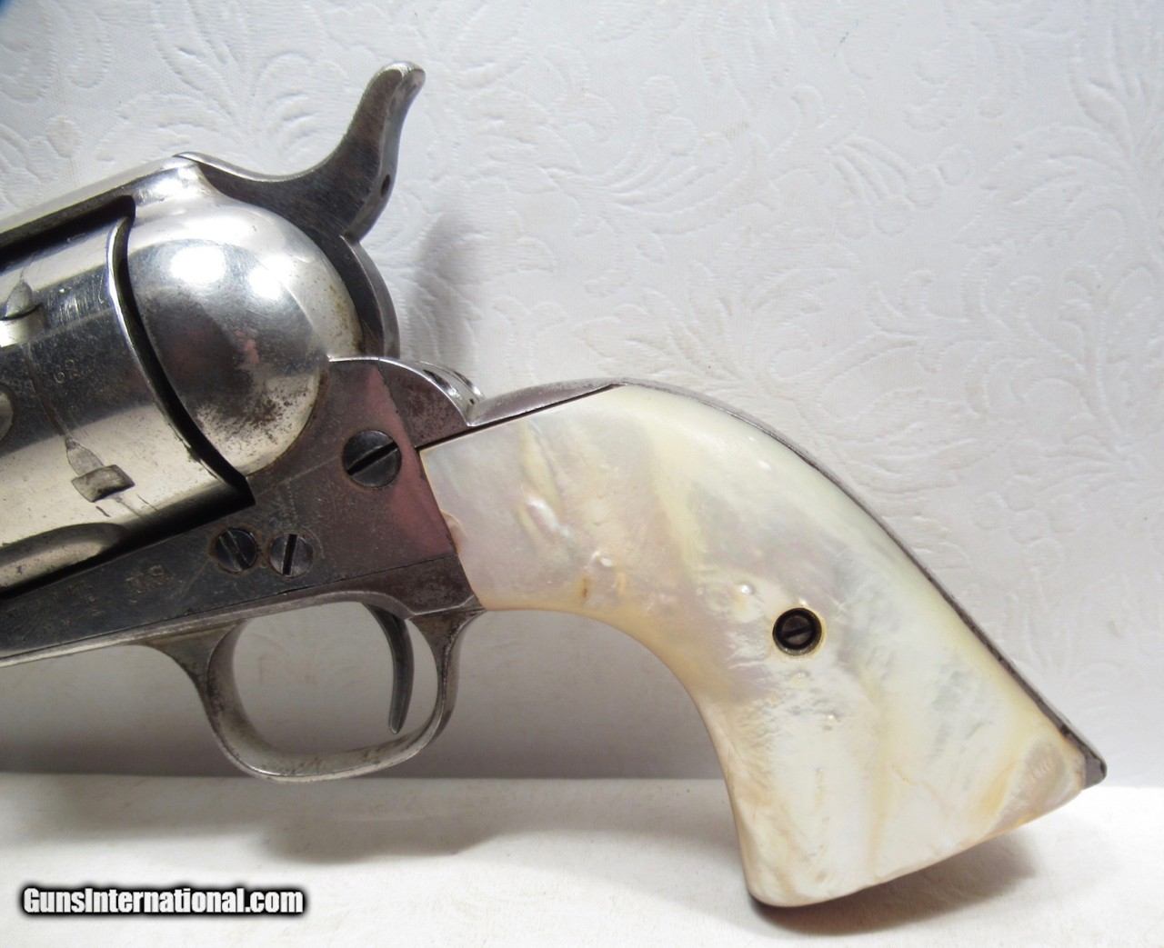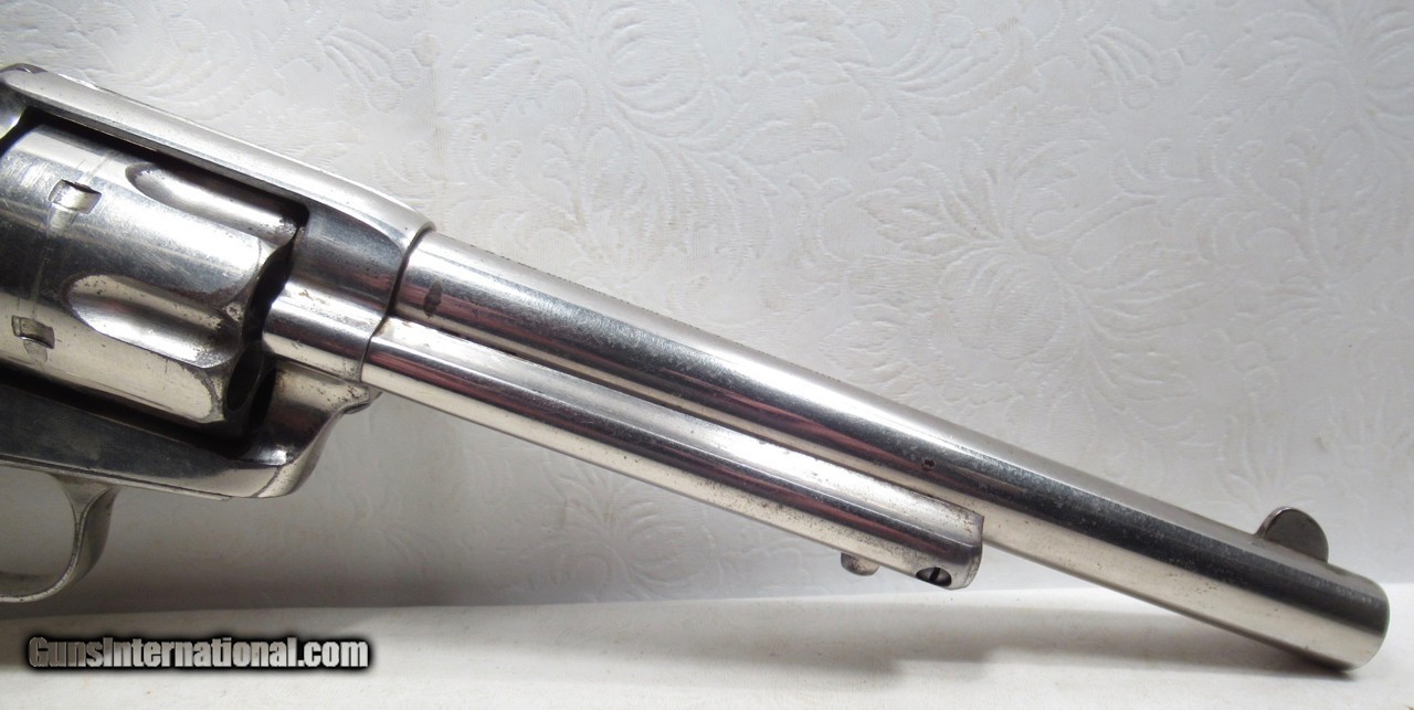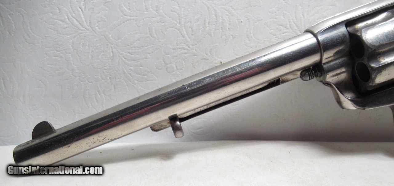 Description: Colt Single Action Army Revolver; Serial No. 111862; .45 Long Colt Caliber; 7 ½” Barrel; Nickel Plated; David F. Clark Inspected; “U.S.” Marked on Left Side of Frame; Pearl Grips (with Chip on Right Grip); “D.F.C.” Marked on Barrel, Frame, and Cylinder; “P” Proof Appears on Bottom of Barrel and Cylinder; Nickel Plated U.S. Cavalry Models are a Hot Topic of Debate Among Colt and U.S. Military Collectors; Four Current Basic Theories Exist on these Revolvers and are as Follows: 1. Issued to Indian Scouts and Police; 2. Special Order “Officers” Revolvers; 3. Surplus State of Virginia Militia Revolvers Sold to and Nickel Plated by Colt or Commercial Retailers; 4. U.S. Navy Revolvers; History Relating to this Ongoing Debate can be Found on Pages 249-258 of “A Study of Colt Single Action Army Revolver”; Butt of Revolver is Inscribed with a Large “C” in Old English Font; Good Action; Very Strong Bore with light even frosting throughout; Proper 2nd Model Housing; Historic 140 Year-Old Colt U.S. Cavalry Model Revolver; See All Photos for Condition; No Texts; Call (254)541-5765 or Email Only; PERSONAL PROPERTY of Harold Wieser; NOTICE: We Do Not Do Any Consignments - All Items Listed are Owned by Us - NO SALES to New Jersey or New York City - Antiques Only to Massachusetts and California; Price: $14,975 + $45 S&H Via USPS PRIORITY MAIL; Payment Address: Harold Wieser - 1466 U.S. Hwy 77 - Rosebud, TX 76570; SEND PAYMENTS VIA USPS PRIORITY MAIL; BEWARE of SCAMS!!! – DO NOT SEND MONEY or CORRESPONDENTS ELECTRONICALLY UNLESS YOU HAVE SPOKEN to HAROLD WIESER FIRST! 254-541-5765 SOLD Antique: Yes Manufacturer: Colt Model: 1873 Serial Number: 111862 |