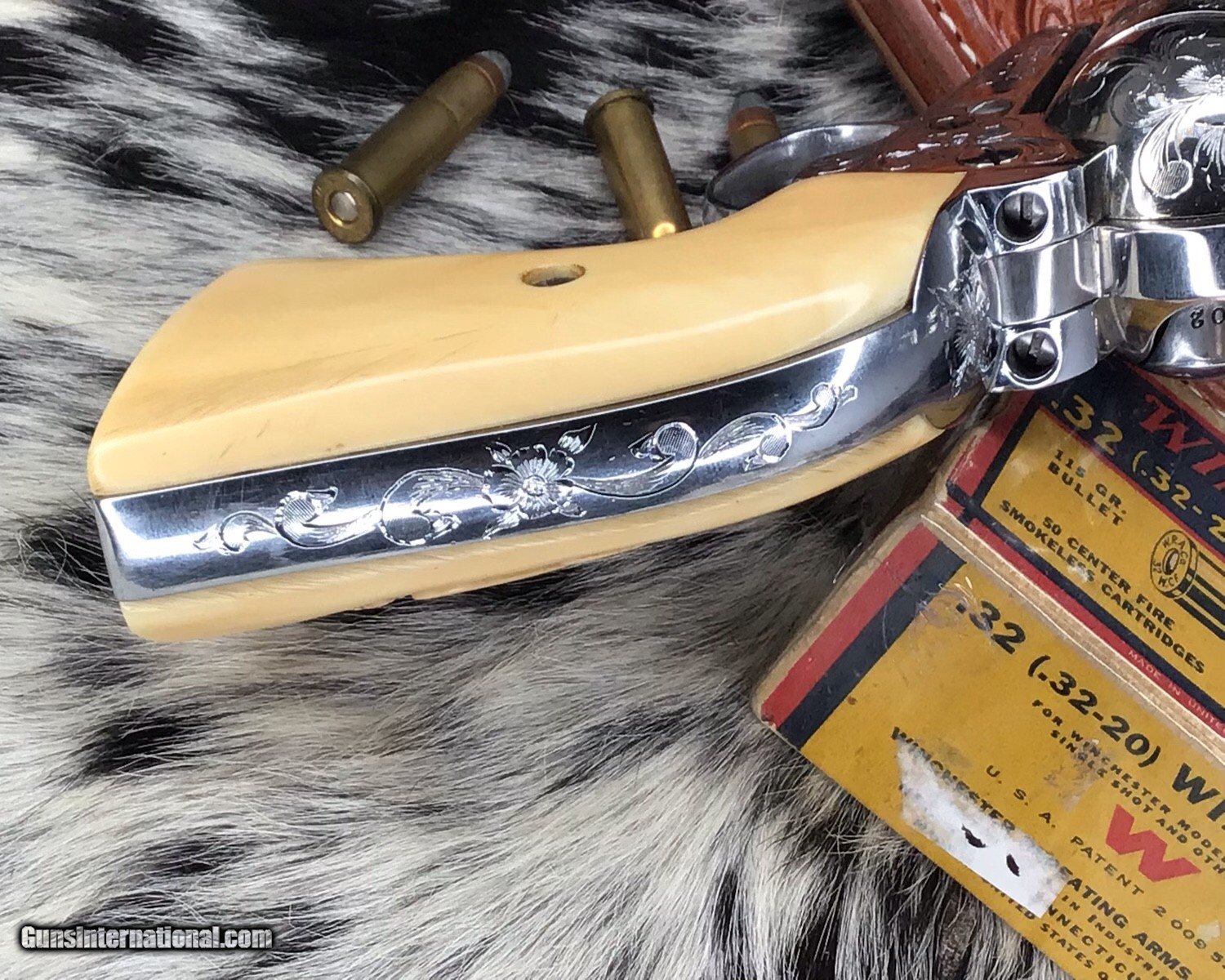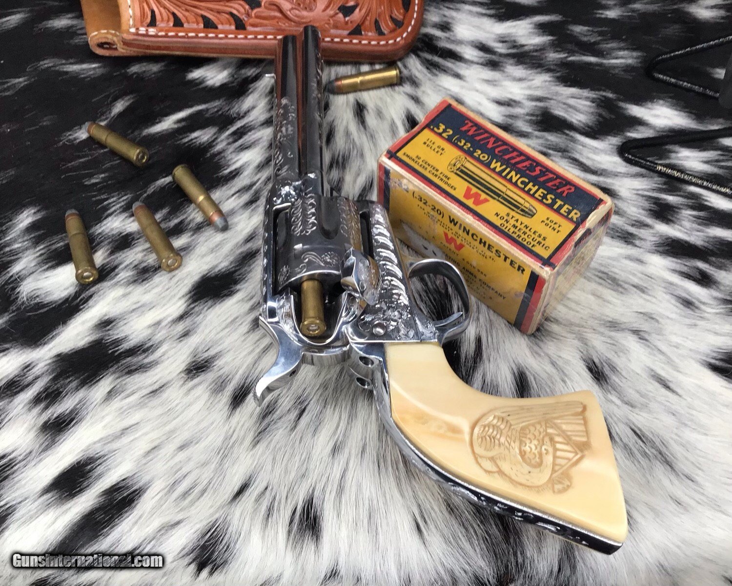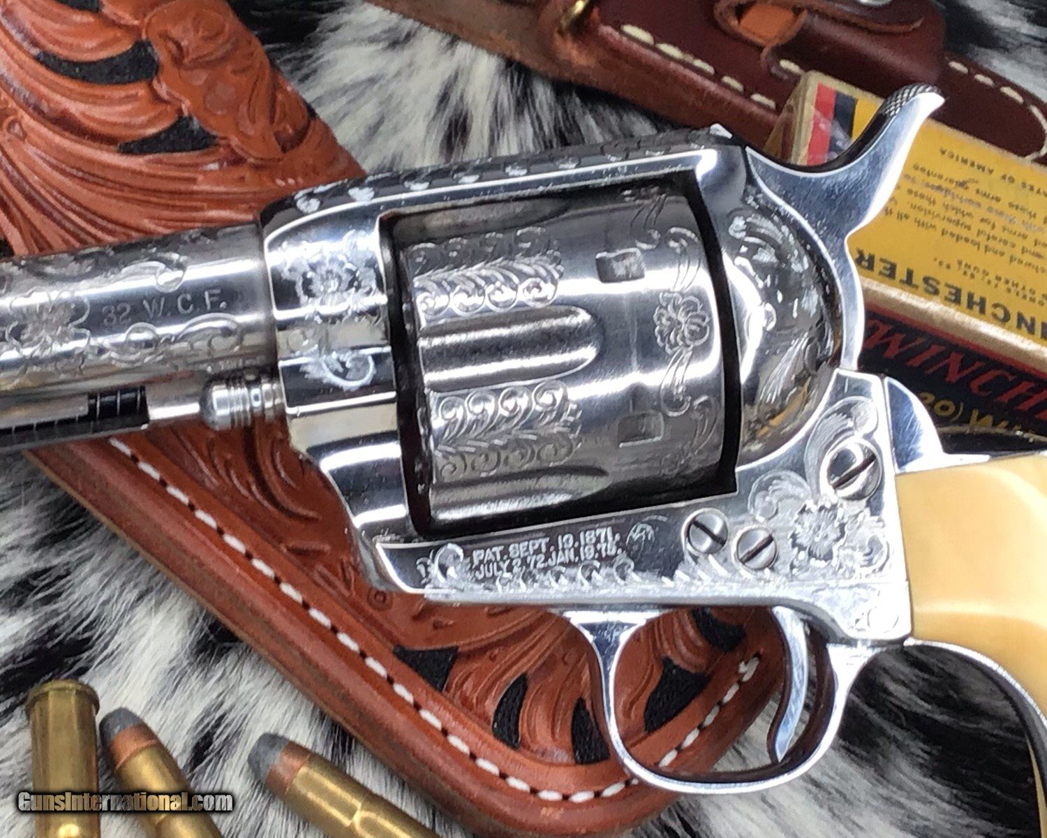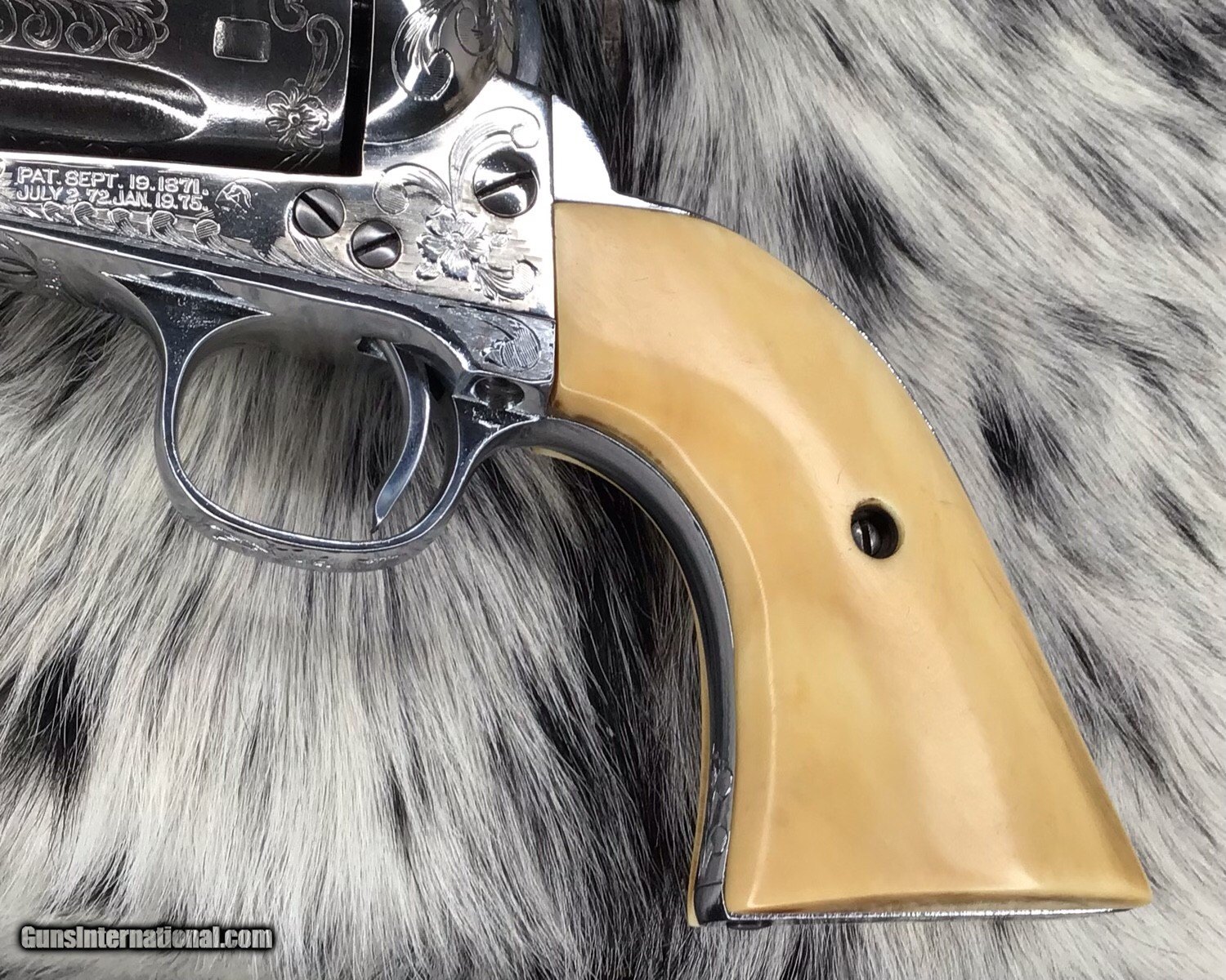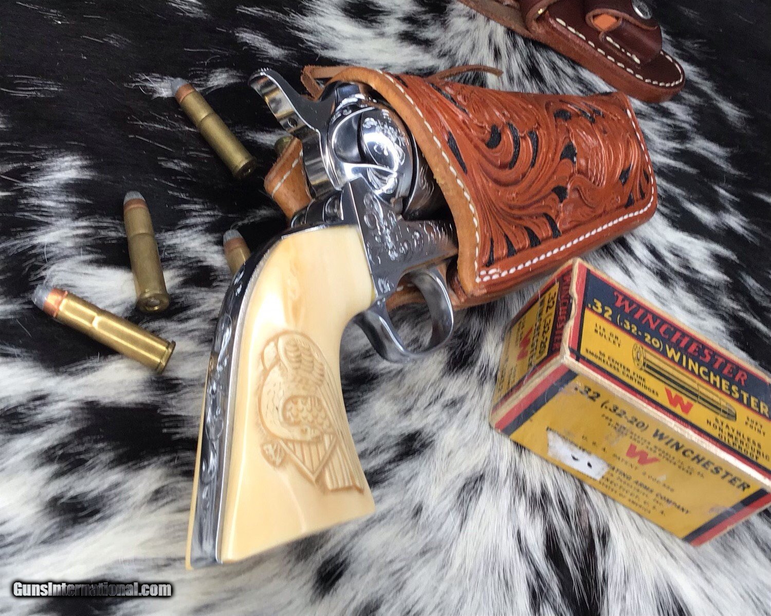 Description: Colt SAA made in 1892, wearing a 4.75 inch barrel, floral hand engraved , Nickel finish with antique carved Elephant Ivory grips. Chambered in 32 WCF/25-20 caliber. Numbers match on frame, trigger guard and butt. Bright Nickel finish intact with no flaking . Barrel address and patent dates crisp and legible. Good bore with strong rifling, action cycles well with tight lockup. The hand engraving follows a floral theme with well placed flowers centering tasteful scrolled engraving. 65% to 75% coverage hand engraving. Overall in high condition for a 129 years young Colt. Grips show some shrinkage with age but still have a beautiful honey gold luster. A unique and special antique Colt SAA in a style maybe owned by a businessman banker or carried by a well accessorized female. Antique firearm requires no transfer or FFL , can be shipped direct to your address, insurance highly recommended on shipment . Add 3% if paying with credit card. Holster shown in pics not included, God Bless America from a proud American, and a Viet Nam Vet , thankful for our freedoms.. paid for by the Blood ,Sweat and Tears of our brave men and women in uniform. Ten Below Firearms is a Veteran owned and operated business. We specialize in out of production models of high quality firearms. We love to ship! If you are out of state or can't make it to our store, just give us a call! Handguns normally ship for $30 and Long guns for $40 to $55 for extra length long guns. That's 2-3 day USPS Priority shipping, Delivery conformation and with tracking number. Optional Postal insurance is additional $1.50 per $100 and highly recommended. SOLD Antique: Yes Handgun Caliber: .32-20 Winchester (.32 WCF, .32-20 Marlin, .32 Colt Lightning ) Manufacturer: Colt Model: Single Action Army Serial Number: 140569 Barrel Length: 4.75 inch Condition: Very good Metal Condition: Very good Bore Condition: Very good Action: SA Finish: Nickel Manufacture Date: 1892 Engraving: Hand Floral with scrolls |