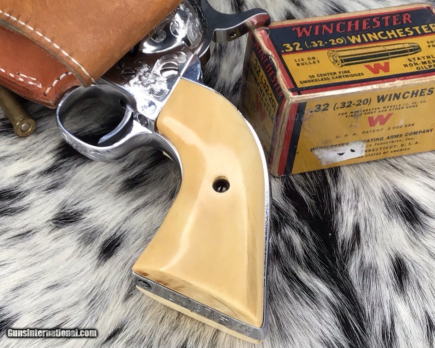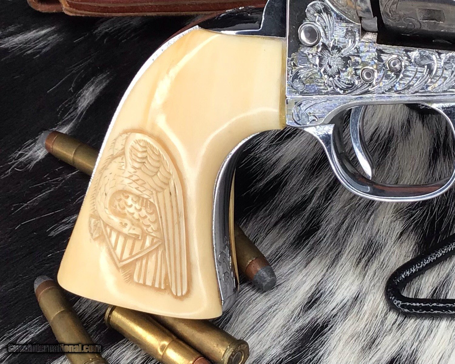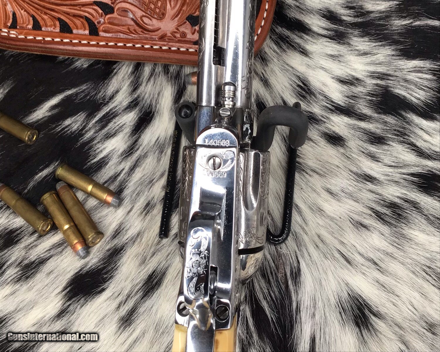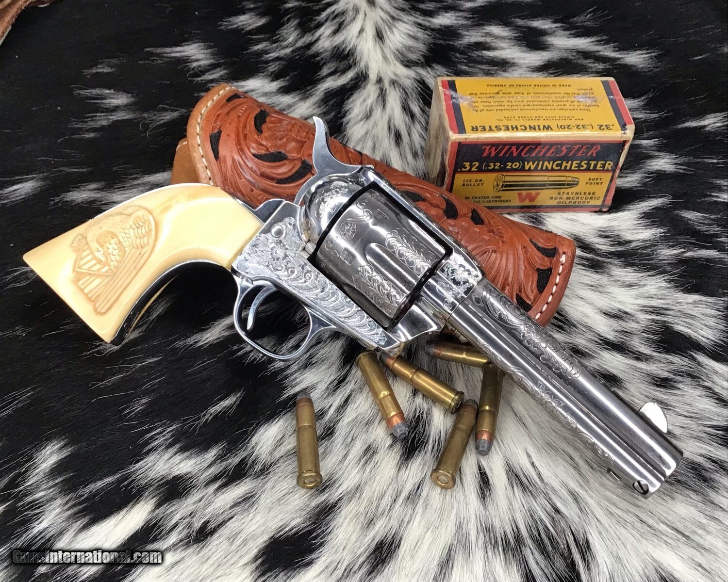 Description: Colt SAA made in 1892, wearing a 4.75 inch barrel, floral hand engraved , Nickel finish with antique carved Elephant Ivory grips. Chambered in 32 WCF/25-20 caliber. Numbers match on frame, trigger guard and butt. Bright Nickel finish intact with no flaking . Barrel address and patent dates crisp and legible. Good bore with strong rifling, action cycles well with tight lockup. The hand engraving follows a floral theme with well placed flowers centering tasteful scrolled engraving. 65% to 75% coverage hand engraving. Overall in high condition for a 129 years young Colt. Grips show some shrinkage with age but still have a beautiful honey gold luster. A unique and special antique Colt SAA in a style maybe owned by a businessman banker or carried by a well accessorized female. Antique firearm requires no transfer or FFL , can be shipped direct to your address, insurance highly recommended on shipment . Add 3% if paying with credit card. Holster shown in pics not included, God Bless America from a proud American, and a Viet Nam Vet , thankful for our freedoms.. paid for by the Blood ,Sweat and Tears of our brave men and women in uniform. Ten Below Firearms is a Veteran owned and operated business. We specialize in out of production models of high quality firearms. We love to ship! If you are out of state or can't make it to our store, just give us a call! Handguns normally ship for $30 and Long guns for $40 to $55 for extra length long guns. That's 2-3 day USPS Priority shipping, Delivery conformation and with tracking number. Optional Postal insurance is additional $1.50 per $100 and highly recommended. SOLD Antique: Yes Handgun Caliber: .32-20 Winchester (.32 WCF, .32-20 Marlin, .32 Colt Lightning ) Manufacturer: Colt Model: Single Action Army Serial Number: 140569 Barrel Length: 4.75 inch Condition: Very good Metal Condition: Very good Bore Condition: Very good Action: SA Finish: Nickel Manufacture Date: 1892 Engraving: Hand Floral with scrolls |