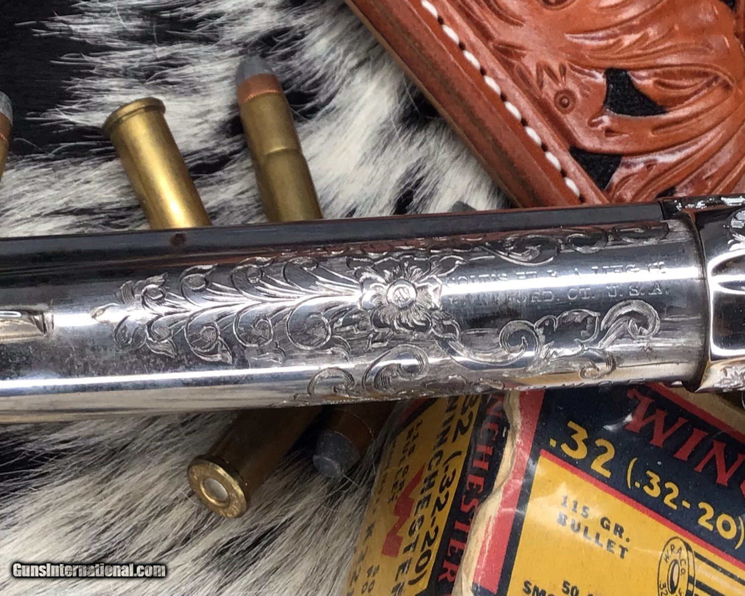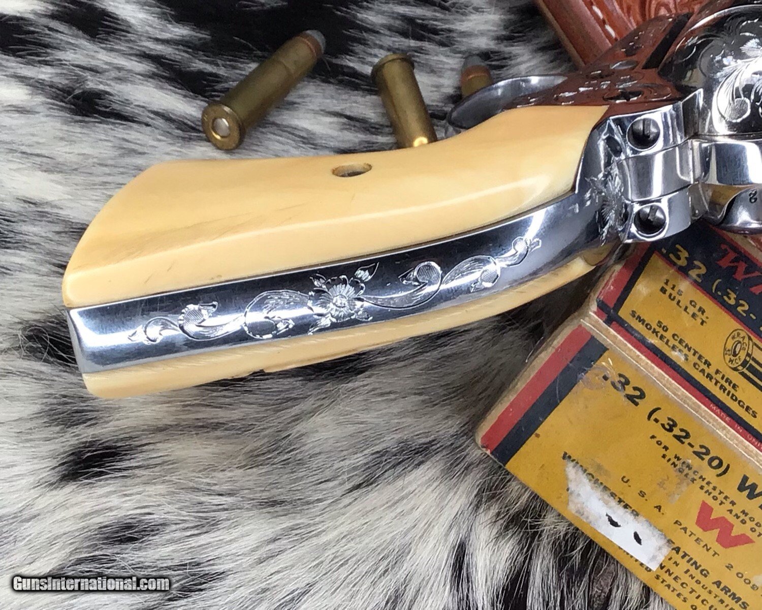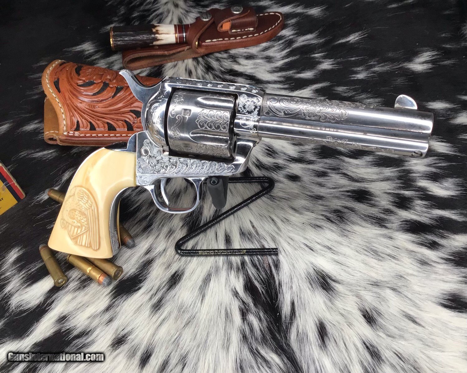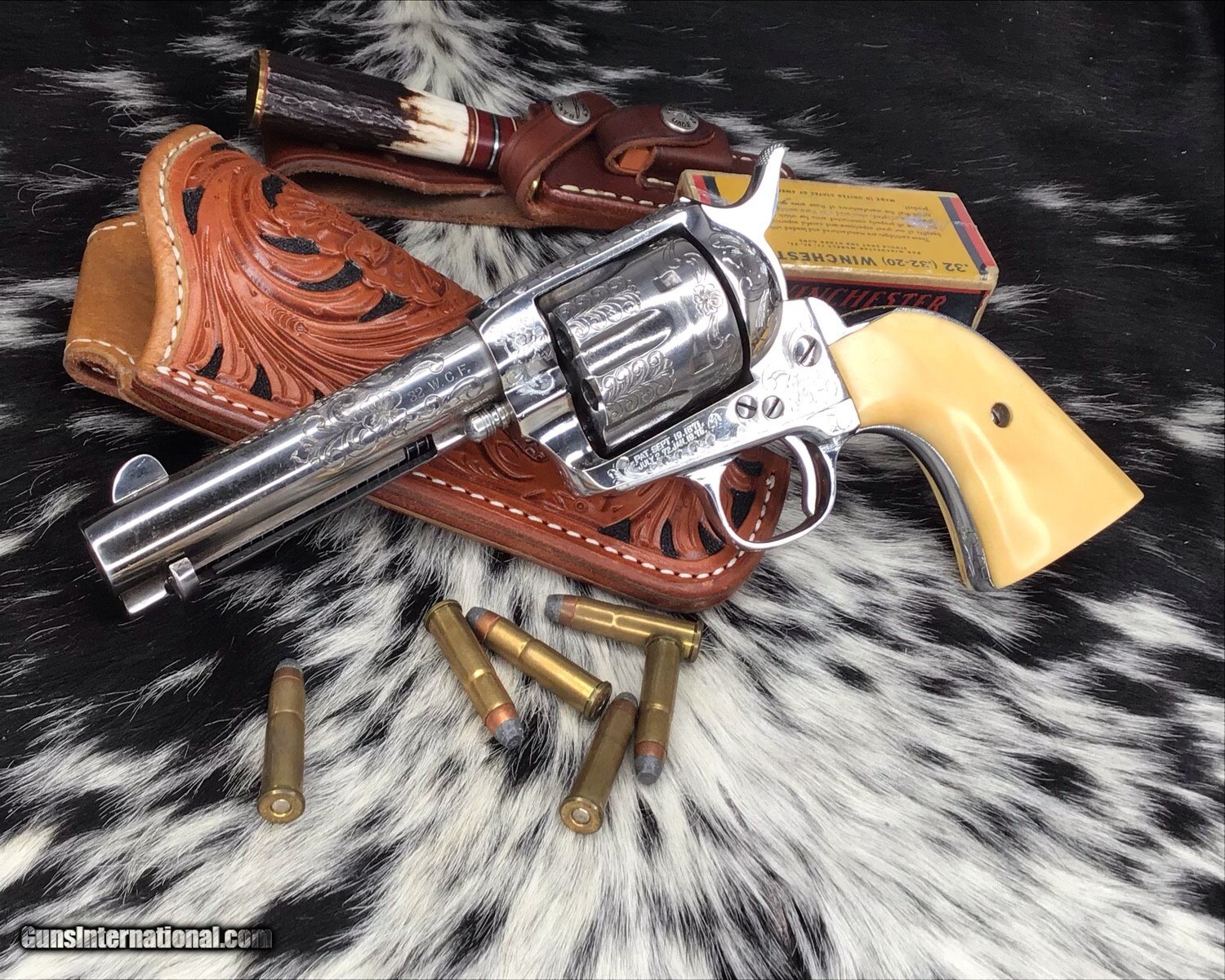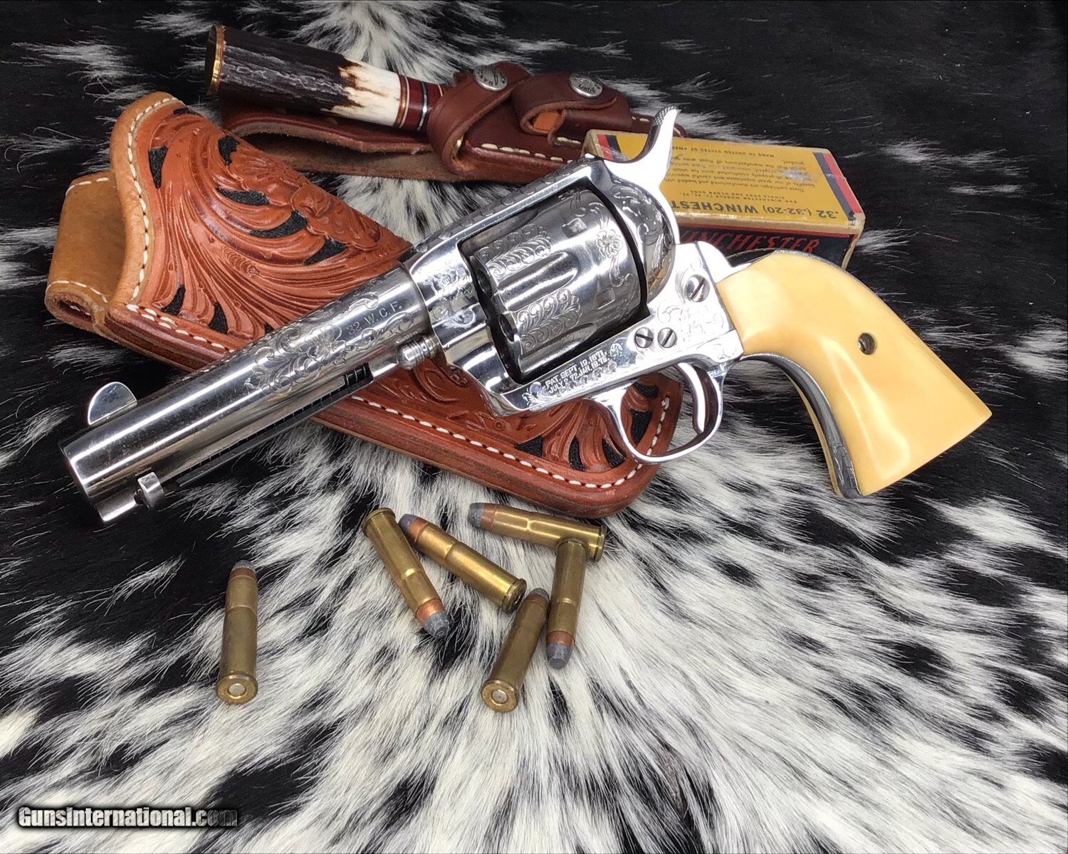 Description: Colt SAA made in 1892, wearing a 4.75 inch barrel, floral hand engraved , Nickel finish with antique carved Elephant Ivory grips. Chambered in 32 WCF/25-20 caliber. Numbers match on frame, trigger guard and butt. Bright Nickel finish intact with no flaking . Barrel address and patent dates crisp and legible. Good bore with strong rifling, action cycles well with tight lockup. The hand engraving follows a floral theme with well placed flowers centering tasteful scrolled engraving. 65% to 75% coverage hand engraving. Overall in high condition for a 129 years young Colt. Grips show some shrinkage with age but still have a beautiful honey gold luster. A unique and special antique Colt SAA in a style maybe owned by a businessman banker or carried by a well accessorized female. Antique firearm requires no transfer or FFL , can be shipped direct to your address, insurance highly recommended on shipment . Add 3% if paying with credit card. Holster shown in pics not included, God Bless America from a proud American, and a Viet Nam Vet , thankful for our freedoms.. paid for by the Blood ,Sweat and Tears of our brave men and women in uniform. Ten Below Firearms is a Veteran owned and operated business. We specialize in out of production models of high quality firearms. We love to ship! If you are out of state or can't make it to our store, just give us a call! Handguns normally ship for $30 and Long guns for $40 to $55 for extra length long guns. That's 2-3 day USPS Priority shipping, Delivery conformation and with tracking number. Optional Postal insurance is additional $1.50 per $100 and highly recommended. SOLD Antique: Yes Handgun Caliber: .32-20 Winchester (.32 WCF, .32-20 Marlin, .32 Colt Lightning ) Manufacturer: Colt Model: Single Action Army Serial Number: 140569 Barrel Length: 4.75 inch Condition: Very good Metal Condition: Very good Bore Condition: Very good Action: SA Finish: Nickel Manufacture Date: 1892 Engraving: Hand Floral with scrolls |